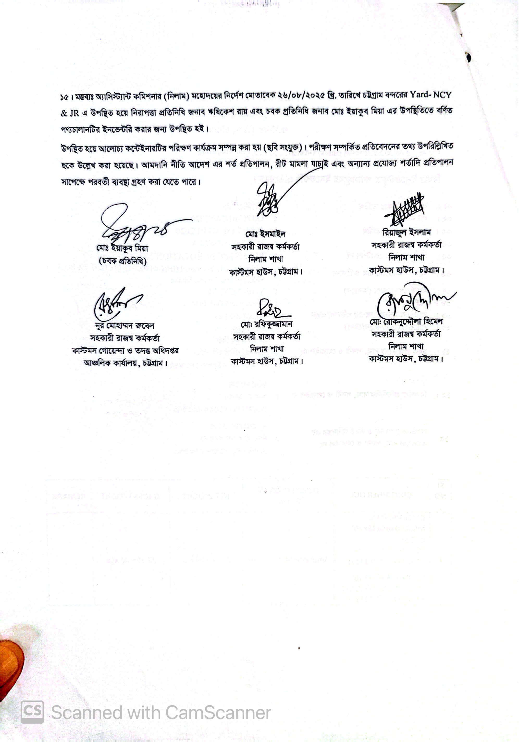 Terms & condition : আমদানি নীতি আদেশ এবং বিদ্যমান অন্যান্য আইন ও বিধি-বিধানের প্রযোজ্য সকল শর্ত পরিপালন এবং প্রযোজ্য ক্ষেত্রে রাসায়নিক পরীক্ষায় পণ্যের সঠিকতা ও ব্যবহার উপযোগিতা থাকা সাপেক্ষে খালাসকালে পণ্যের বর্ণনা এবং ওজন নিশ্চিত করে পণ্য ছাড়যোগ্য হবে। কোন লটভুক্ত পণ্যচালানে মেয়াদ উত্তীর্ণ/ধ্বসংযোগ্য পণ্য অন্তর্ভুক্ত থাকলে, উক্ত পণ্যচালানের ক্ষেত্রে মেয়াদ উত্তীর্ণ/ধ্বসংযোগ্য পণ্য ব্যতীত (প্রযোজ্য ক্ষেত্রে) কেবল মেয়াদযুক্ত/নিলামযোগ্য পণ্যসমূহ বিদ্যমান ও প্রযোজ্য আইন ও বিধি-বিধানের প্রযোজ্য সকল শর্ত পরিপালন সাপেক্ষে পণ্য ছাড়যোগ্য হবে। সার্ভার জটিলতা এড়ানোর জন্য আগ্রহী নিলাম ক্রেতাগণকে সরেজমিন পণ্য দেখে নিলামের নির্ধারিত শেষ তারিখ ও সময়ের (২৭/১১/২০২৫ খ্রি. তারিখ বিকাল ০৪.০০ টা) পূর্বেই বিশেষ ই-নিলামে অংশগ্রহণ করার জন্য অনুরোধ করা যাচ্ছে। কোনরূপ কারণ দর্শানো ব্যতিরেকে কর্তৃপক্ষ যে কোন সময় ও পর্যায়ে যে কোন লট বা সকল লটের নিলাম আংশিক বা সম্পূর্ণ স্থগিত বা বাতিলের অধিকার সংরক্ষণ করেন।