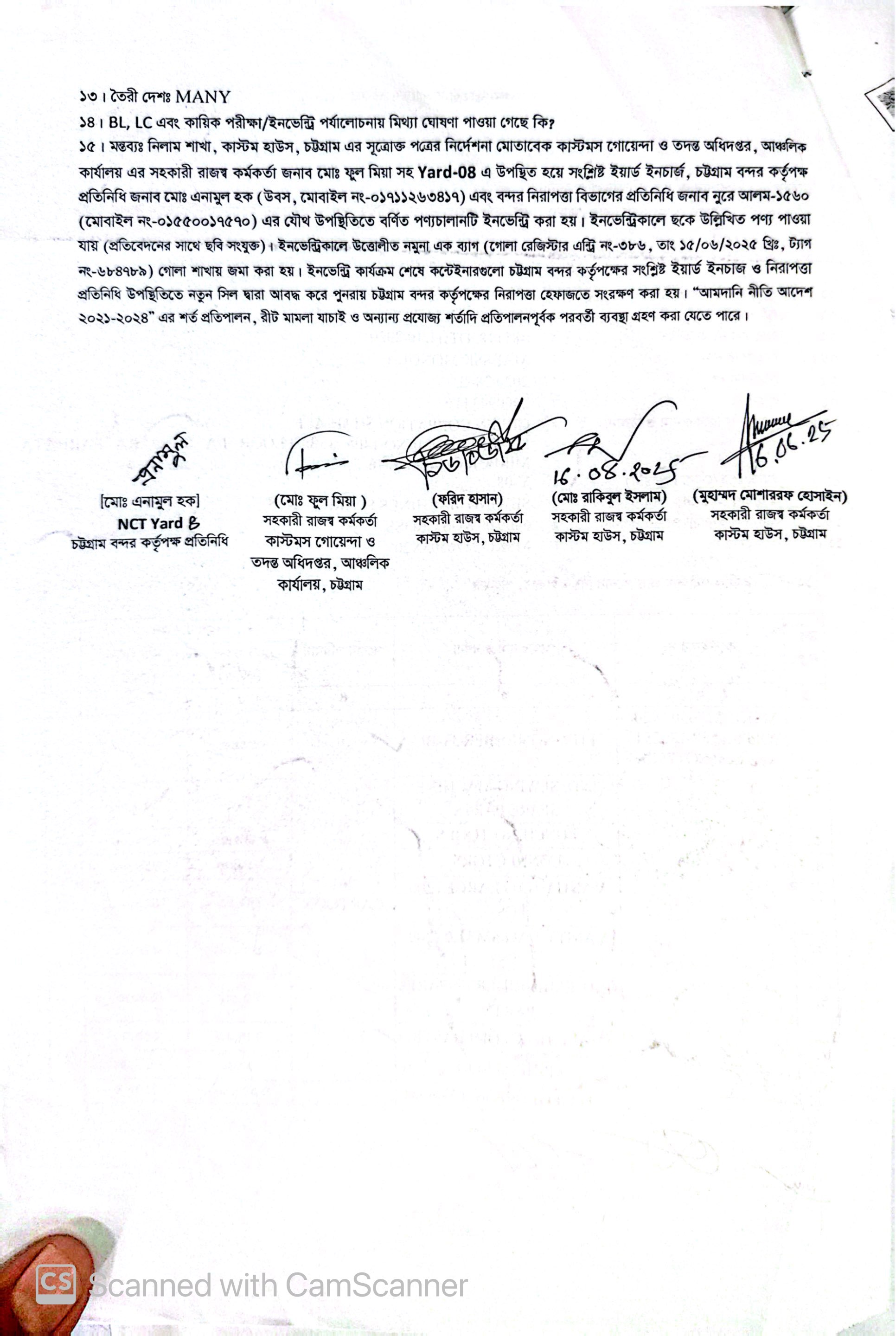 Terms & condition : আমদানি নীতি আদেশ এবং বিদ্যমান অন্যান্য আইন ও বিধি-বিধানের প্রযোজ্য সকল শর্ত পরিপালন এবং প্রযোজ্য ক্ষেত্রে রাসায়নিক পরীক্ষায় পণ্যের সঠিকতা ও ব্যবহার উপযোগিতা থাকা সাপেক্ষে খালাসকালে পণ্যের বর্ণনা এবং ওজন নিশ্চিত করে পণ্য ছাড়যোগ্য হবে। কোন লটভুক্ত পণ্যচালানে মেয়াদ উত্তীর্ণ/ধ্বসংযোগ্য পণ্য অন্তর্ভুক্ত থাকলে, উক্ত পণ্যচালানের ক্ষেত্রে মেয়াদ উত্তীর্ণ/ধ্বসংযোগ্য পণ্য ব্যতীত (প্রযোজ্য ক্ষেত্রে) কেবল মেয়াদযুক্ত/নিলামযোগ্য পণ্যসমূহ বিদ্যমান ও প্রযোজ্য আইন ও বিধি-বিধানের প্রযোজ্য সকল শর্ত পরিপালন সাপেক্ষে পণ্য ছাড়যোগ্য হবে। সার্ভার জটিলতা এড়ানোর জন্য আগ্রহী নিলাম ক্রেতাগণকে সরেজমিন পণ্য দেখে নিলামের নির্ধারিত শেষ তারিখ ও সময়ের (২৭/১১/২০২৫ খ্রি. তারিখ বিকাল ০৪.০০ টা) পূর্বেই বিশেষ ই-নিলামে অংশগ্রহণ করার জন্য অনুরোধ করা যাচ্ছে। কোনরূপ কারণ দর্শানো ব্যতিরেকে কর্তৃপক্ষ যে কোন সময় ও পর্যায়ে যে কোন লট বা সকল লটের নিলাম আংশিক বা সম্পূর্ণ স্থগিত বা বাতিলের অধিকার সংরক্ষণ করেন।