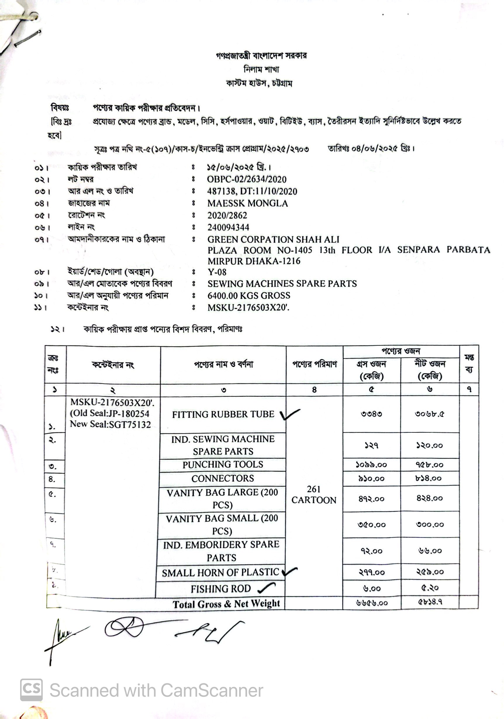 লটের শিরোনাম :(1) Fitting Rubber Tube 3068.5Kgs; (2) Ind. Sewing Machine Spare Parts 120 Kgs; (3) Punching Tools758 Kgs; (4) Connectors 814 Kgs; (5) Vanity Bag Large (200 Pcs) 424 Kgs; (6) Vanity Bag Small (200 Pcs(Previous Bid: 0 TK)