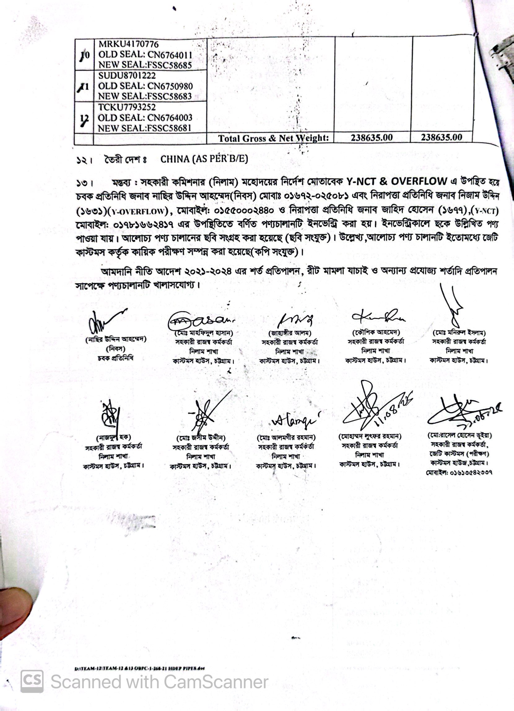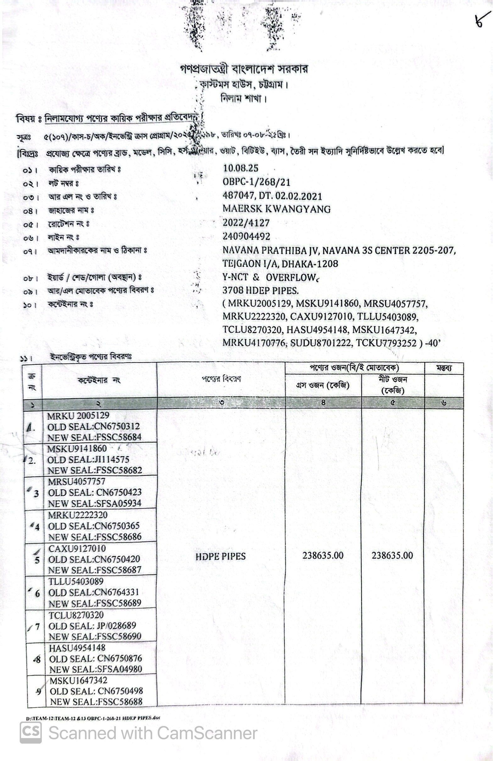 Terms & condition : আমদানি নীতি আদেশ এবং বিদ্যমান অন্যান্য আইন ও বিধি-বিধানের প্রযোজ্য সকল শর্ত পরিপালন এবং প্রযোজ্য ক্ষেত্রে রাসায়নিক পরীক্ষায় পণ্যের সঠিকতা ও ব্যবহার উপযোগিতা থাকা সাপেক্ষে খালাসকালে পণ্যের বর্ণনা এবং ওজন নিশ্চিত করে পণ্য ছাড়যোগ্য হবে। কোন লটভুক্ত পণ্যচালানে মেয়াদ উত্তীর্ণ/ধ্বসংযোগ্য পণ্য অন্তর্ভুক্ত থাকলে, উক্ত পণ্যচালানের ক্ষেত্রে মেয়াদ উত্তীর্ণ/ধ্বসংযোগ্য পণ্য ব্যতীত (প্রযোজ্য ক্ষেত্রে) কেবল মেয়াদযুক্ত/নিলামযোগ্য পণ্যসমূহ বিদ্যমান ও প্রযোজ্য আইন ও বিধি-বিধানের প্রযোজ্য সকল শর্ত পরিপালন সাপেক্ষে পণ্য ছাড়যোগ্য হবে। সার্ভার জটিলতা এড়ানোর জন্য আগ্রহী নিলাম ক্রেতাগণকে সরেজমিন পণ্য দেখে নিলামের নির্ধারিত শেষ তারিখ ও সময়ের (২৭/১১/২০২৫ খ্রি. তারিখ বিকাল ০৪.০০ টা) পূর্বেই বিশেষ ই-নিলামে অংশগ্রহণ করার জন্য অনুরোধ করা যাচ্ছে। কোনরূপ কারণ দর্শানো ব্যতিরেকে কর্তৃপক্ষ যে কোন সময় ও পর্যায়ে যে কোন লট বা সকল লটের নিলাম আংশিক বা সম্পূর্ণ স্থগিত বা বাতিলের অধিকার সংরক্ষণ করেন।