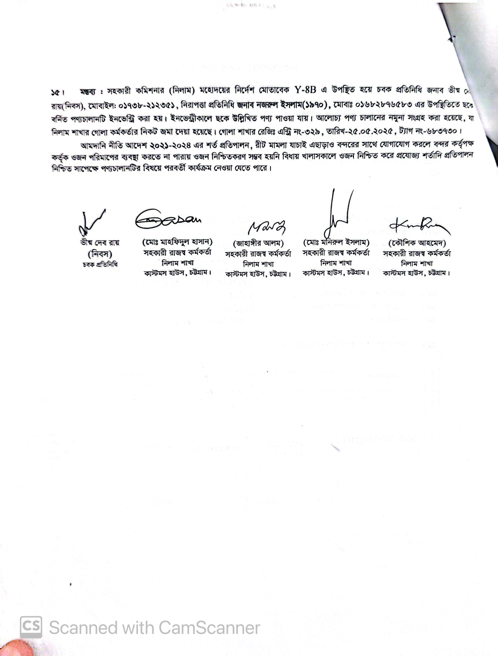 Terms & condition : আমদানি নীতি আদেশ এবং বিদ্যমান অন্যান্য আইন ও বিধি-বিধানের প্রযোজ্য সকল শর্ত পরিপালন এবং প্রযোজ্য ক্ষেত্রে রাসায়নিক পরীক্ষায় পণ্যের সঠিকতা ও ব্যবহার উপযোগিতা থাকা সাপেক্ষে খালাসকালে পণ্যের বর্ণনা এবং ওজন নিশ্চিত করে পণ্য ছাড়যোগ্য হবে। কোন লটভুক্ত পণ্যচালানে মেয়াদ উত্তীর্ণ/ধ্বসংযোগ্য পণ্য অন্তর্ভুক্ত থাকলে, উক্ত পণ্যচালানের ক্ষেত্রে মেয়াদ উত্তীর্ণ/ধ্বসংযোগ্য পণ্য ব্যতীত (প্রযোজ্য ক্ষেত্রে) কেবল মেয়াদযুক্ত/নিলামযোগ্য পণ্যসমূহ বিদ্যমান ও প্রযোজ্য আইন ও বিধি-বিধানের প্রযোজ্য সকল শর্ত পরিপালন সাপেক্ষে পণ্য ছাড়যোগ্য হবে। সার্ভার জটিলতা এড়ানোর জন্য আগ্রহী নিলাম ক্রেতাগণকে সরেজমিন পণ্য দেখে নিলামের নির্ধারিত শেষ তারিখ ও সময়ের (২৭/১১/২০২৫ খ্রি. তারিখ বিকাল ০৪.০০ টা) পূর্বেই বিশেষ ই-নিলামে অংশগ্রহণ করার জন্য অনুরোধ করা যাচ্ছে। কোনরূপ কারণ দর্শানো ব্যতিরেকে কর্তৃপক্ষ যে কোন সময় ও পর্যায়ে যে কোন লট বা সকল লটের নিলাম আংশিক বা সম্পূর্ণ স্থগিত বা বাতিলের অধিকার সংরক্ষণ করেন।