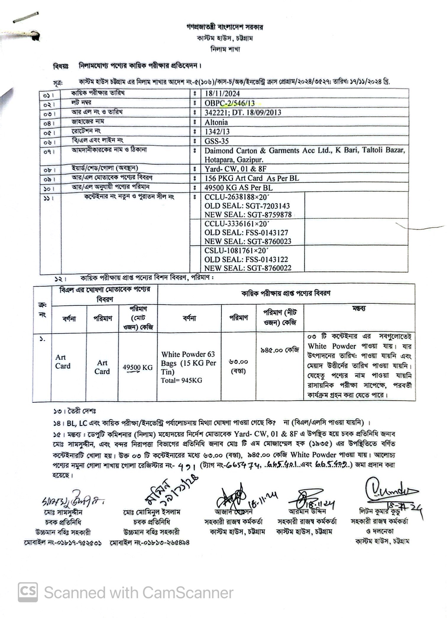 Terms & condition : আমদানি নীতি আদেশ এবং বিদ্যমান অন্যান্য আইন ও বিধি-বিধানের প্রযোজ্য সকল শর্ত পরিপালন এবং প্রযোজ্য ক্ষেত্রে রাসায়নিক পরীক্ষায় পণ্যের সঠিকতা ও ব্যবহার উপযোগিতা থাকা সাপেক্ষে খালাসকালে পণ্যের বর্ণনা এবং ওজন নিশ্চিত করে পণ্য ছাড়যোগ্য হবে। কোন লটভুক্ত পণ্যচালানে মেয়াদ উত্তীর্ণ/ধ্বসংযোগ্য পণ্য অন্তর্ভুক্ত থাকলে, উক্ত পণ্যচালানের ক্ষেত্রে মেয়াদ উত্তীর্ণ/ধ্বসংযোগ্য পণ্য ব্যতীত (প্রযোজ্য ক্ষেত্রে) কেবল মেয়াদযুক্ত/নিলামযোগ্য পণ্যসমূহ বিদ্যমান ও প্রযোজ্য আইন ও বিধি-বিধানের প্রযোজ্য সকল শর্ত পরিপালন সাপেক্ষে পণ্য ছাড়যোগ্য হবে। সার্ভার জটিলতা এড়ানোর জন্য আগ্রহী নিলাম ক্রেতাগণকে সরেজমিন পণ্য দেখে নিলামের নির্ধারিত শেষ তারিখ ও সময়ের (২৭/১১/২০২৫ খ্রি. তারিখ বিকাল ০৪.০০ টা) পূর্বেই বিশেষ ই-নিলামে অংশগ্রহণ করার জন্য অনুরোধ করা যাচ্ছে। কোনরূপ কারণ দর্শানো ব্যতিরেকে কর্তৃপক্ষ যে কোন সময় ও পর্যায়ে যে কোন লট বা সকল লটের নিলাম আংশিক বা সম্পূর্ণ স্থগিত বা বাতিলের অধিকার সংরক্ষণ করেন।