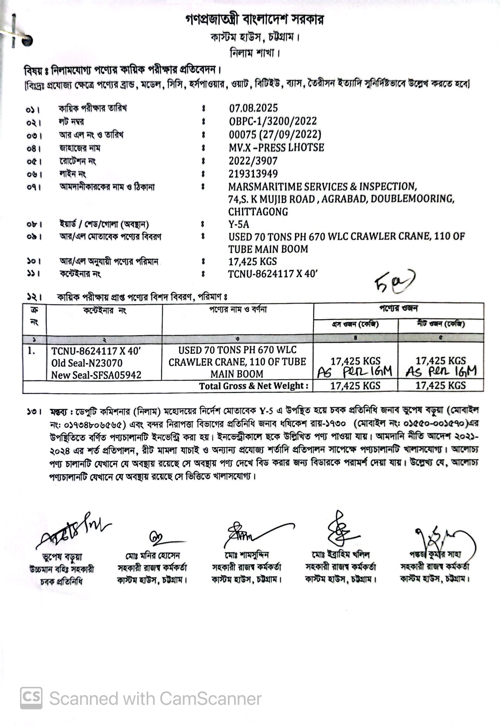 Terms & condition : আমদানি নীতি আদেশ এবং বিদ্যমান অন্যান্য আইন ও বিধি-বিধানের প্রযোজ্য সকল শর্ত পরিপালন এবং প্রযোজ্য ক্ষেত্রে রাসায়নিক পরীক্ষায় পণ্যের সঠিকতা ও ব্যবহার উপযোগিতা থাকা সাপেক্ষে খালাসকালে পণ্যের বর্ণনা এবং ওজন নিশ্চিত করে পণ্য ছাড়যোগ্য হবে। কোন লটভুক্ত পণ্যচালানে মেয়াদ উত্তীর্ণ/ধ্বসংযোগ্য পণ্য অন্তর্ভুক্ত থাকলে, উক্ত পণ্যচালানের ক্ষেত্রে মেয়াদ উত্তীর্ণ/ধ্বসংযোগ্য পণ্য ব্যতীত (প্রযোজ্য ক্ষেত্রে) কেবল মেয়াদযুক্ত/নিলামযোগ্য পণ্যসমূহ বিদ্যমান ও প্রযোজ্য আইন ও বিধি-বিধানের প্রযোজ্য সকল শর্ত পরিপালন সাপেক্ষে পণ্য ছাড়যোগ্য হবে। সার্ভার জটিলতা এড়ানোর জন্য আগ্রহী নিলাম ক্রেতাগণকে সরেজমিন পণ্য দেখে নিলামের নির্ধারিত শেষ তারিখ ও সময়ের (২৭/১১/২০২৫ খ্রি. তারিখ বিকাল ০৪.০০ টা) পূর্বেই বিশেষ ই-নিলামে অংশগ্রহণ করার জন্য অনুরোধ করা যাচ্ছে। কোনরূপ কারণ দর্শানো ব্যতিরেকে কর্তৃপক্ষ যে কোন সময় ও পর্যায়ে যে কোন লট বা সকল লটের নিলাম আংশিক বা সম্পূর্ণ স্থগিত বা বাতিলের অধিকার সংরক্ষণ করেন।