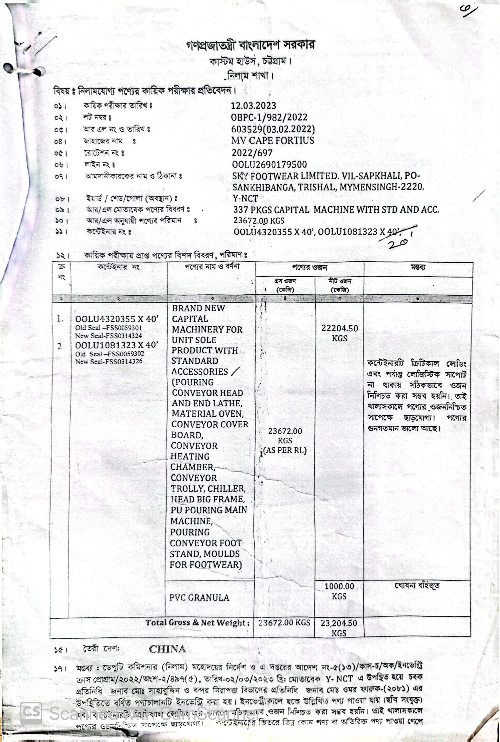 (1) Brand New Capital Machinery for Unit Sole Product with Standard Accessories (Pouring Conveyor Head and End Lathe, Material Oven, Conveyor Cover Board, Conveyor Heating Chamber, Conveyor Trolly, Chiller, Head Big Frame, PU Pouring Main Machine, Pouring Conveyor Foot Stand, Molds for Footwears= 22,204.50 kgs, (2) PVC Granules= 1,000 kgs |