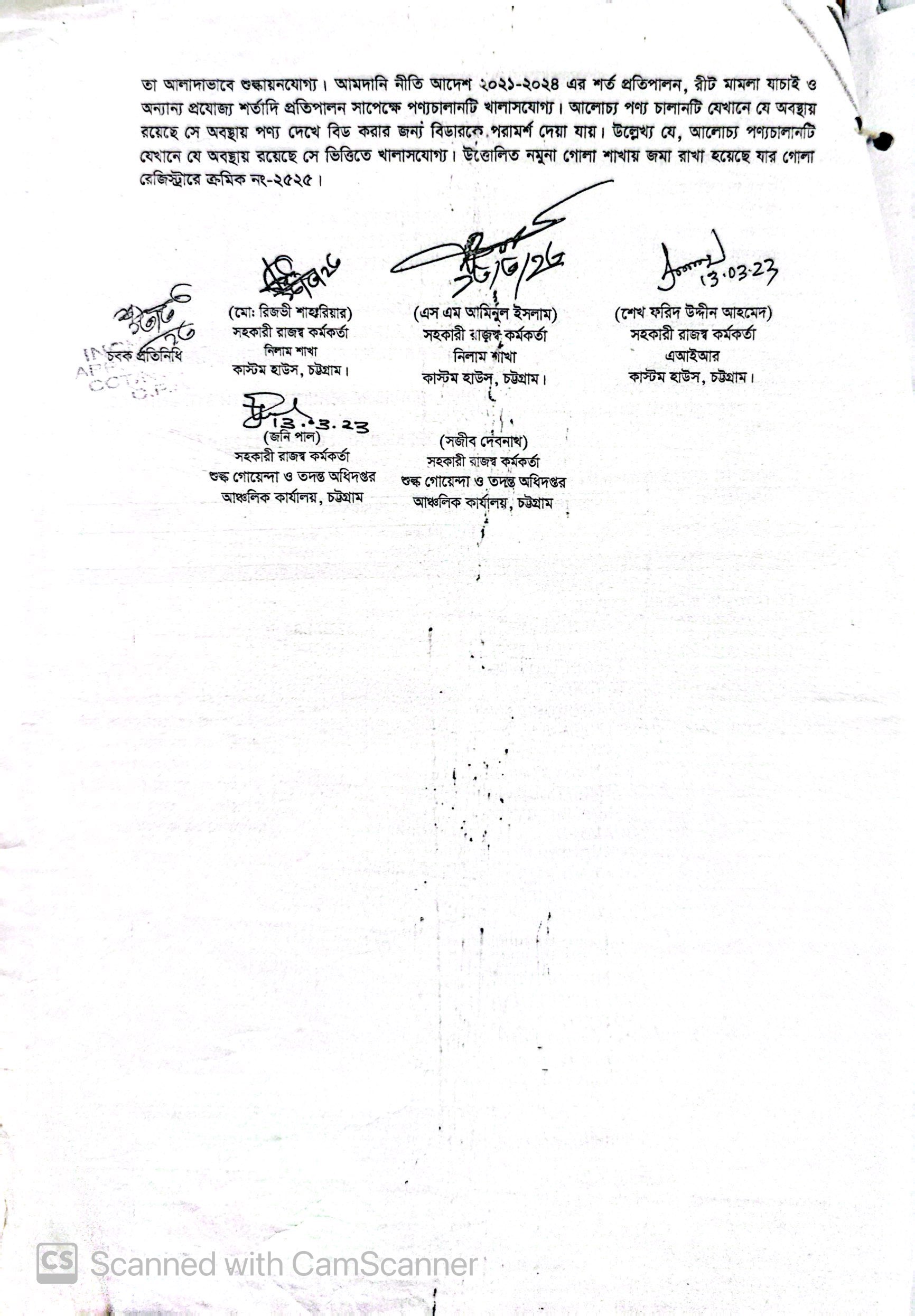 Terms & condition : আমদানি নীতি আদেশ এবং বিদ্যমান অন্যান্য আইন ও বিধি-বিধানের প্রযোজ্য সকল শর্ত পরিপালন এবং প্রযোজ্য ক্ষেত্রে রাসায়নিক পরীক্ষায় পণ্যের সঠিকতা ও ব্যবহার উপযোগিতা থাকা সাপেক্ষে খালাসকালে পণ্যের বর্ণনা এবং ওজন নিশ্চিত করে পণ্য ছাড়যোগ্য হবে। কোন লটভুক্ত পণ্যচালানে মেয়াদ উত্তীর্ণ/ধ্বসংযোগ্য পণ্য অন্তর্ভুক্ত থাকলে, উক্ত পণ্যচালানের ক্ষেত্রে মেয়াদ উত্তীর্ণ/ধ্বসংযোগ্য পণ্য ব্যতীত (প্রযোজ্য ক্ষেত্রে) কেবল মেয়াদযুক্ত/নিলামযোগ্য পণ্যসমূহ বিদ্যমান ও প্রযোজ্য আইন ও বিধি-বিধানের প্রযোজ্য সকল শর্ত পরিপালন সাপেক্ষে পণ্য ছাড়যোগ্য হবে। সার্ভার জটিলতা এড়ানোর জন্য আগ্রহী নিলাম ক্রেতাগণকে সরেজমিন পণ্য দেখে নিলামের নির্ধারিত শেষ তারিখ ও সময়ের (২৭/১১/২০২৫ খ্রি. তারিখ বিকাল ০৪.০০ টা) পূর্বেই বিশেষ ই-নিলামে অংশগ্রহণ করার জন্য অনুরোধ করা যাচ্ছে। কোনরূপ কারণ দর্শানো ব্যতিরেকে কর্তৃপক্ষ যে কোন সময় ও পর্যায়ে যে কোন লট বা সকল লটের নিলাম আংশিক বা সম্পূর্ণ স্থগিত বা বাতিলের অধিকার সংরক্ষণ করেন।