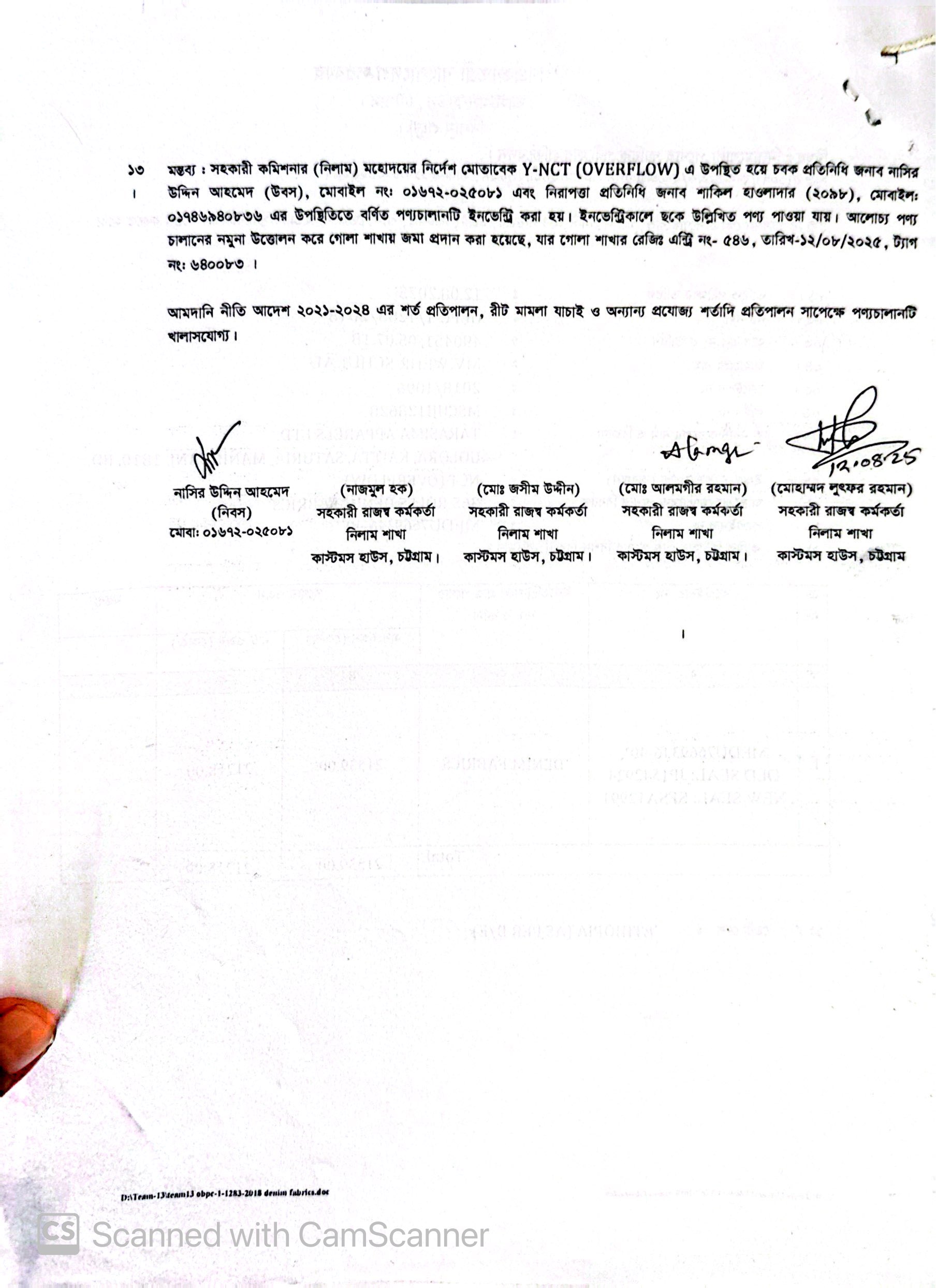 Terms & condition : আমদানি নীতি আদেশ এবং বিদ্যমান অন্যান্য আইন ও বিধি-বিধানের প্রযোজ্য সকল শর্ত পরিপালন এবং প্রযোজ্য ক্ষেত্রে রাসায়নিক পরীক্ষায় পণ্যের সঠিকতা ও ব্যবহার উপযোগিতা থাকা সাপেক্ষে খালাসকালে পণ্যের বর্ণনা এবং ওজন নিশ্চিত করে পণ্য ছাড়যোগ্য হবে। কোন লটভুক্ত পণ্যচালানে মেয়াদ উত্তীর্ণ/ধ্বসংযোগ্য পণ্য অন্তর্ভুক্ত থাকলে, উক্ত পণ্যচালানের ক্ষেত্রে মেয়াদ উত্তীর্ণ/ধ্বসংযোগ্য পণ্য ব্যতীত (প্রযোজ্য ক্ষেত্রে) কেবল মেয়াদযুক্ত/নিলামযোগ্য পণ্যসমূহ বিদ্যমান ও প্রযোজ্য আইন ও বিধি-বিধানের প্রযোজ্য সকল শর্ত পরিপালন সাপেক্ষে পণ্য ছাড়যোগ্য হবে। সার্ভার জটিলতা এড়ানোর জন্য আগ্রহী নিলাম ক্রেতাগণকে সরেজমিন পণ্য দেখে নিলামের নির্ধারিত শেষ তারিখ ও সময়ের (২৭/১১/২০২৫ খ্রি. তারিখ বিকাল ০৪.০০ টা) পূর্বেই বিশেষ ই-নিলামে অংশগ্রহণ করার জন্য অনুরোধ করা যাচ্ছে। কোনরূপ কারণ দর্শানো ব্যতিরেকে কর্তৃপক্ষ যে কোন সময় ও পর্যায়ে যে কোন লট বা সকল লটের নিলাম আংশিক বা সম্পূর্ণ স্থগিত বা বাতিলের অধিকার সংরক্ষণ করেন।