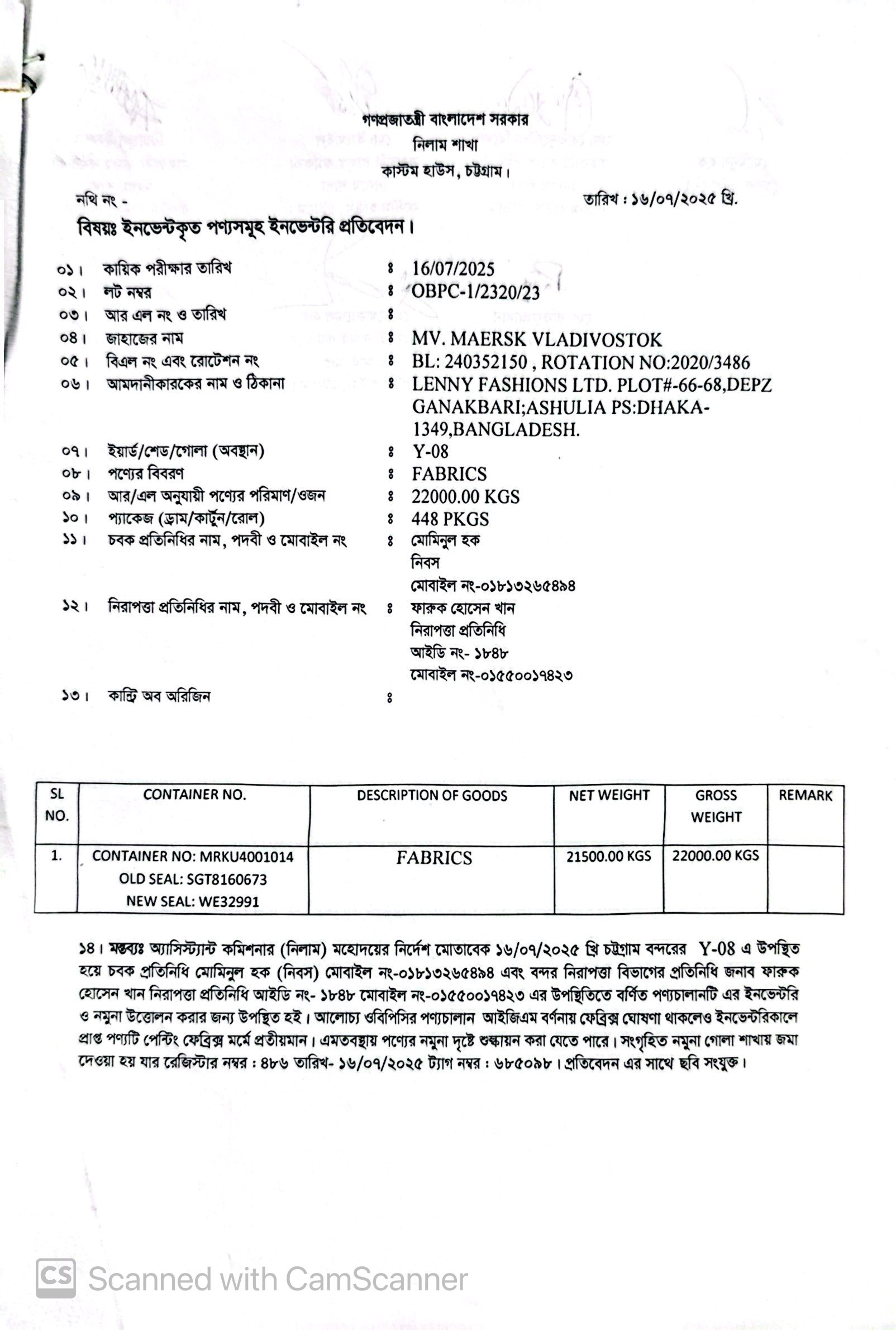 Terms & condition : আমদানি নীতি আদেশ এবং বিদ্যমান অন্যান্য আইন ও বিধি-বিধানের প্রযোজ্য সকল শর্ত পরিপালন এবং প্রযোজ্য ক্ষেত্রে রাসায়নিক পরীক্ষায় পণ্যের সঠিকতা ও ব্যবহার উপযোগিতা থাকা সাপেক্ষে খালাসকালে পণ্যের বর্ণনা এবং ওজন নিশ্চিত করে পণ্য ছাড়যোগ্য হবে। কোন লটভুক্ত পণ্যচালানে মেয়াদ উত্তীর্ণ/ধ্বসংযোগ্য পণ্য অন্তর্ভুক্ত থাকলে, উক্ত পণ্যচালানের ক্ষেত্রে মেয়াদ উত্তীর্ণ/ধ্বসংযোগ্য পণ্য ব্যতীত (প্রযোজ্য ক্ষেত্রে) কেবল মেয়াদযুক্ত/নিলামযোগ্য পণ্যসমূহ বিদ্যমান ও প্রযোজ্য আইন ও বিধি-বিধানের প্রযোজ্য সকল শর্ত পরিপালন সাপেক্ষে পণ্য ছাড়যোগ্য হবে। সার্ভার জটিলতা এড়ানোর জন্য আগ্রহী নিলাম ক্রেতাগণকে সরেজমিন পণ্য দেখে নিলামের নির্ধারিত শেষ তারিখ ও সময়ের (২৭/১১/২০২৫ খ্রি. তারিখ বিকাল ০৪.০০ টা) পূর্বেই বিশেষ ই-নিলামে অংশগ্রহণ করার জন্য অনুরোধ করা যাচ্ছে। কোনরূপ কারণ দর্শানো ব্যতিরেকে কর্তৃপক্ষ যে কোন সময় ও পর্যায়ে যে কোন লট বা সকল লটের নিলাম আংশিক বা সম্পূর্ণ স্থগিত বা বাতিলের অধিকার সংরক্ষণ করেন।