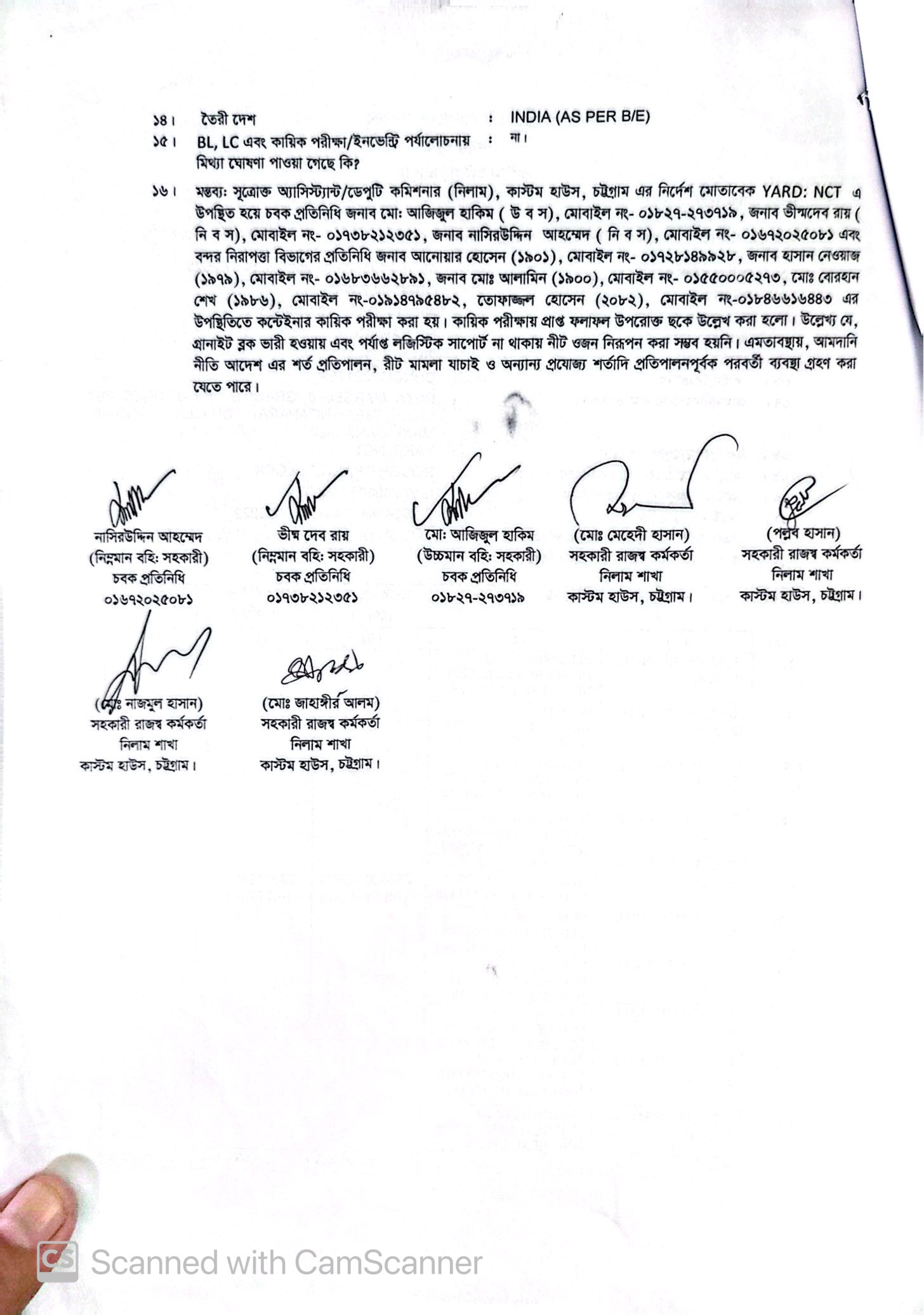 Terms & condition : আমদানি নীতি আদেশ এবং বিদ্যমান অন্যান্য আইন ও বিধি-বিধানের প্রযোজ্য সকল শর্ত পরিপালন এবং প্রযোজ্য ক্ষেত্রে রাসায়নিক পরীক্ষায় পণ্যের সঠিকতা ও ব্যবহার উপযোগিতা থাকা সাপেক্ষে খালাসকালে পণ্যের বর্ণনা এবং ওজন নিশ্চিত করে পণ্য ছাড়যোগ্য হবে। কোন লটভুক্ত পণ্যচালানে মেয়াদ উত্তীর্ণ/ধ্বসংযোগ্য পণ্য অন্তর্ভুক্ত থাকলে, উক্ত পণ্যচালানের ক্ষেত্রে মেয়াদ উত্তীর্ণ/ধ্বসংযোগ্য পণ্য ব্যতীত (প্রযোজ্য ক্ষেত্রে) কেবল মেয়াদযুক্ত/নিলামযোগ্য পণ্যসমূহ বিদ্যমান ও প্রযোজ্য আইন ও বিধি-বিধানের প্রযোজ্য সকল শর্ত পরিপালন সাপেক্ষে পণ্য ছাড়যোগ্য হবে। সার্ভার জটিলতা এড়ানোর জন্য আগ্রহী নিলাম ক্রেতাগণকে সরেজমিন পণ্য দেখে নিলামের নির্ধারিত শেষ তারিখ ও সময়ের (২৭/১১/২০২৫ খ্রি. তারিখ বিকাল ০৪.০০ টা) পূর্বেই বিশেষ ই-নিলামে অংশগ্রহণ করার জন্য অনুরোধ করা যাচ্ছে। কোনরূপ কারণ দর্শানো ব্যতিরেকে কর্তৃপক্ষ যে কোন সময় ও পর্যায়ে যে কোন লট বা সকল লটের নিলাম আংশিক বা সম্পূর্ণ স্থগিত বা বাতিলের অধিকার সংরক্ষণ করেন।