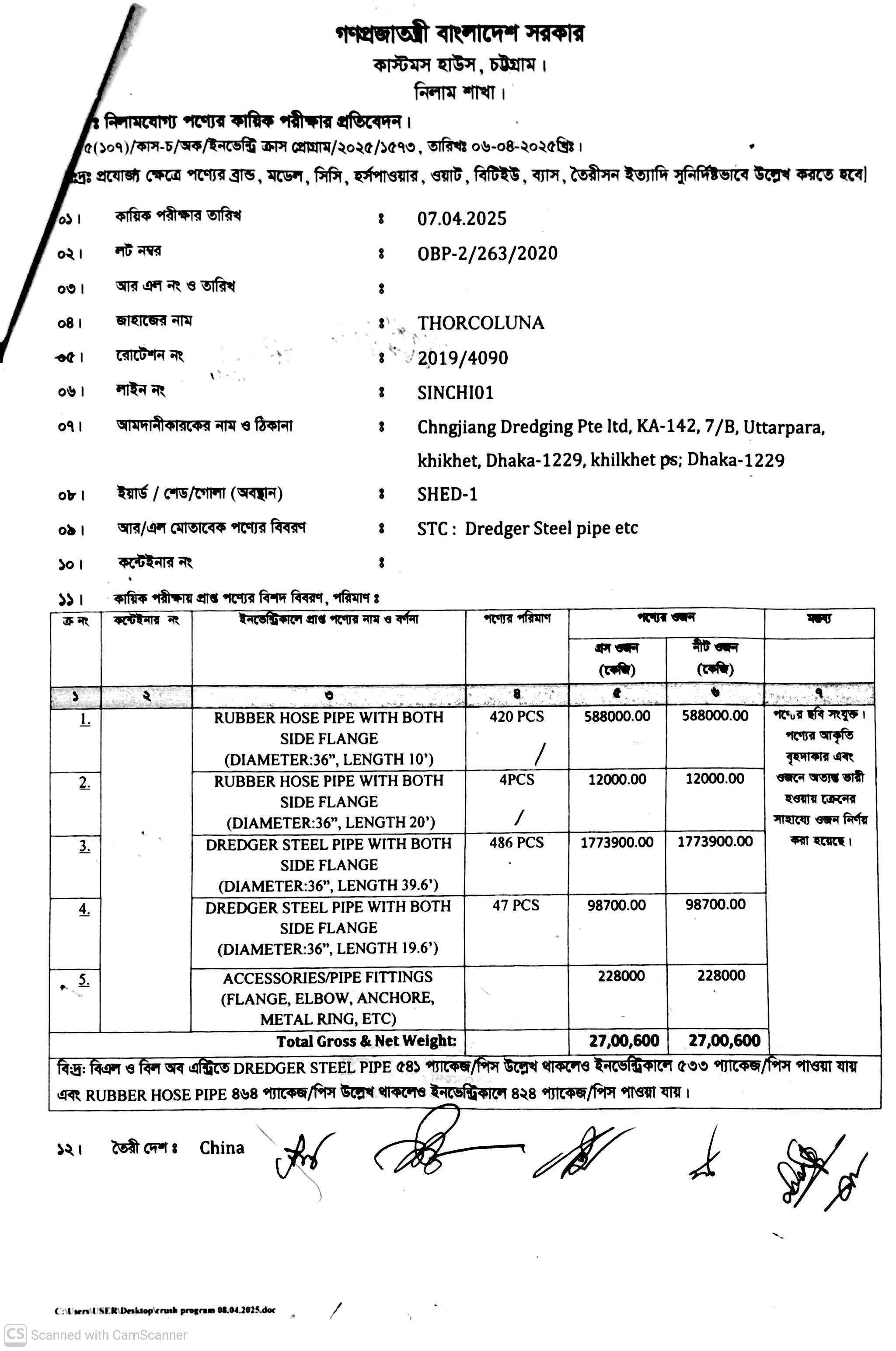 লটের শিরোনাম :(1) Rubber Hose Pipe with Both Side Flange (Diameter 36", Length 10')- 420 Pcs: 588,000 Kg; (2) Rubber Hose Pipe with Both Side Flange (Diameter 36", Length 20')- 4 Pcs: 12,000 Kg; (3) Dredger Steel P(Previous Bid: 0 TK)