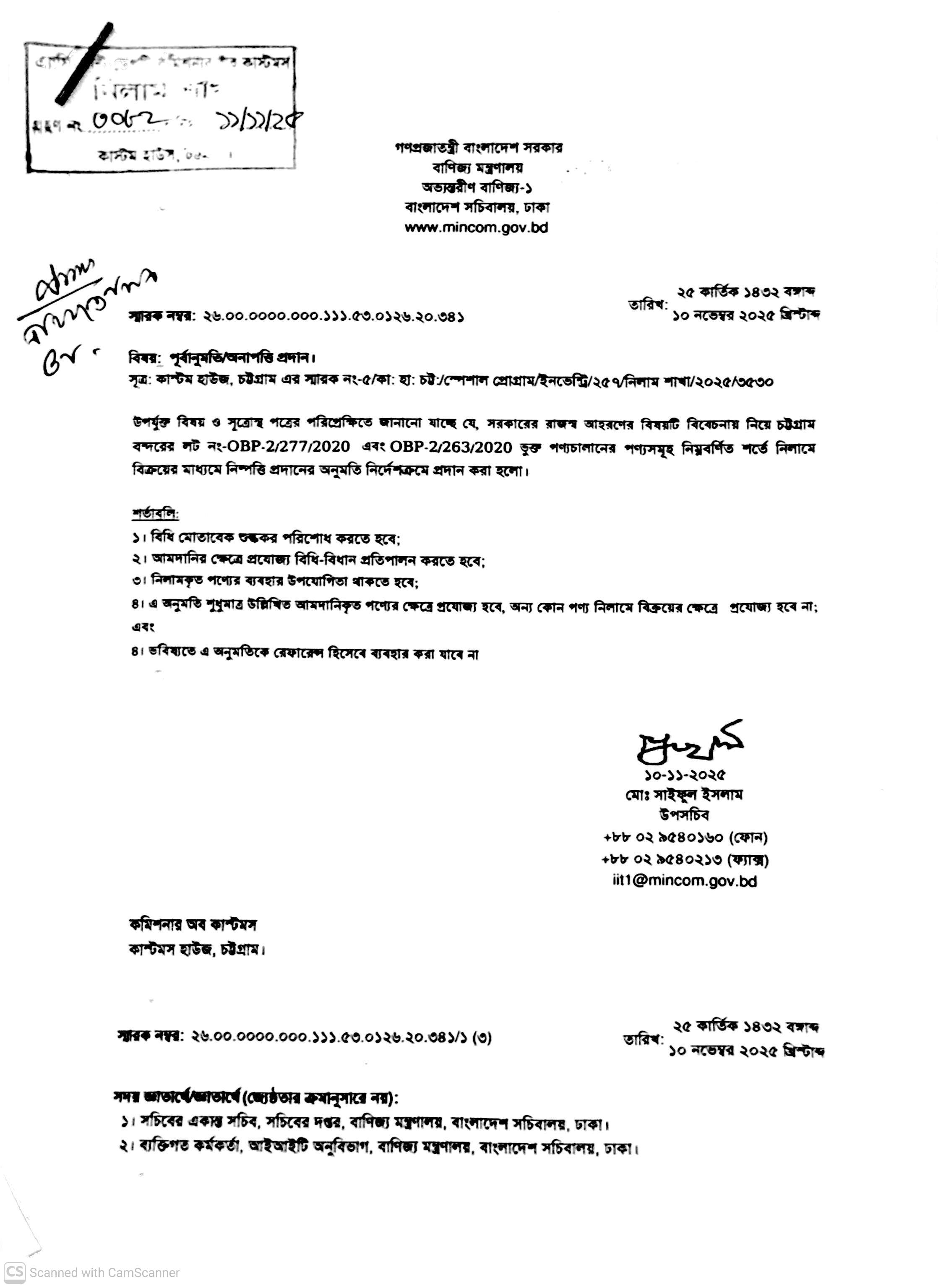 Terms & condition : বাণিজ্য মন্ত্রণালয়ের পূর্বানুমতি/অনাপত্তি পত্রে উল্লিখিত সকল শর্ত, আমদানি নীতি আদেশ ২০২১-২০২৪ এর প্রযোজ্য শর্ত পরিপালন এবং বিদ্যমান অন্যান্য আইন ও বিধি-বিধানের প্রযোজ্য সকল শর্তাদি পরিপালনপূর্বক নিলামকৃত পণ্য ছাড়যোগ্য হবে। পণ্যের ব্যবহার উপযোগিতা থাকা সাপেক্ষে পণ্য ছাড়যোগ্য হবে।