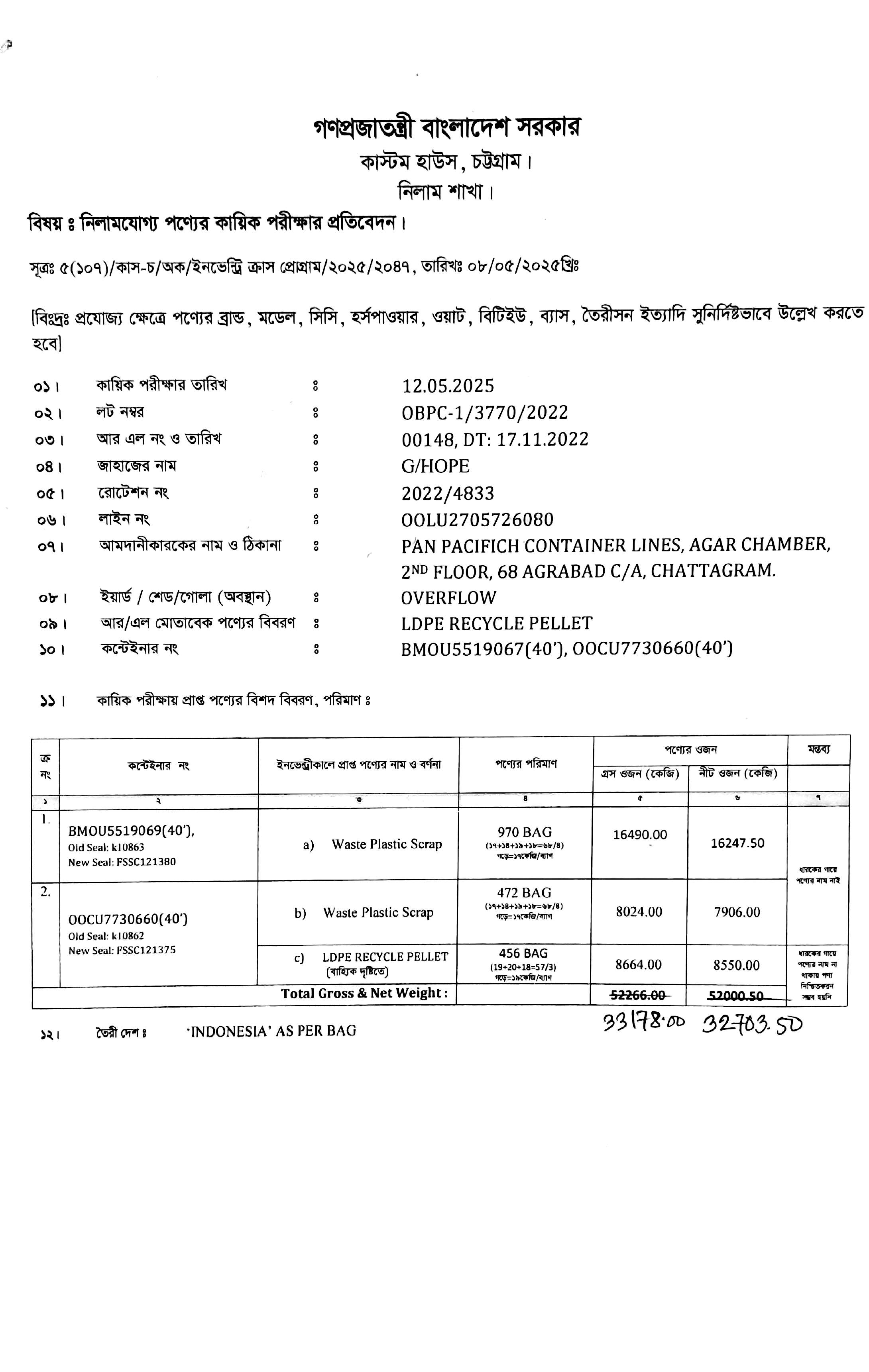 (1) Waste Plastic Scrap= 24,153.50 Kgs; (2) LDPE Recycle Pellet= 8,550 Kgs. (আমদানি নীতি আদেশের অনুচ্ছেদ-২১(১৮) প্রযোজ্য। শুধুমাত্র শিল্পের কাঁচামাল হিসেবে Re-cycling করে এরূপ প্রতিষ্ঠান নিলামে অংশগ্রহণ করতে পারবেন।) |