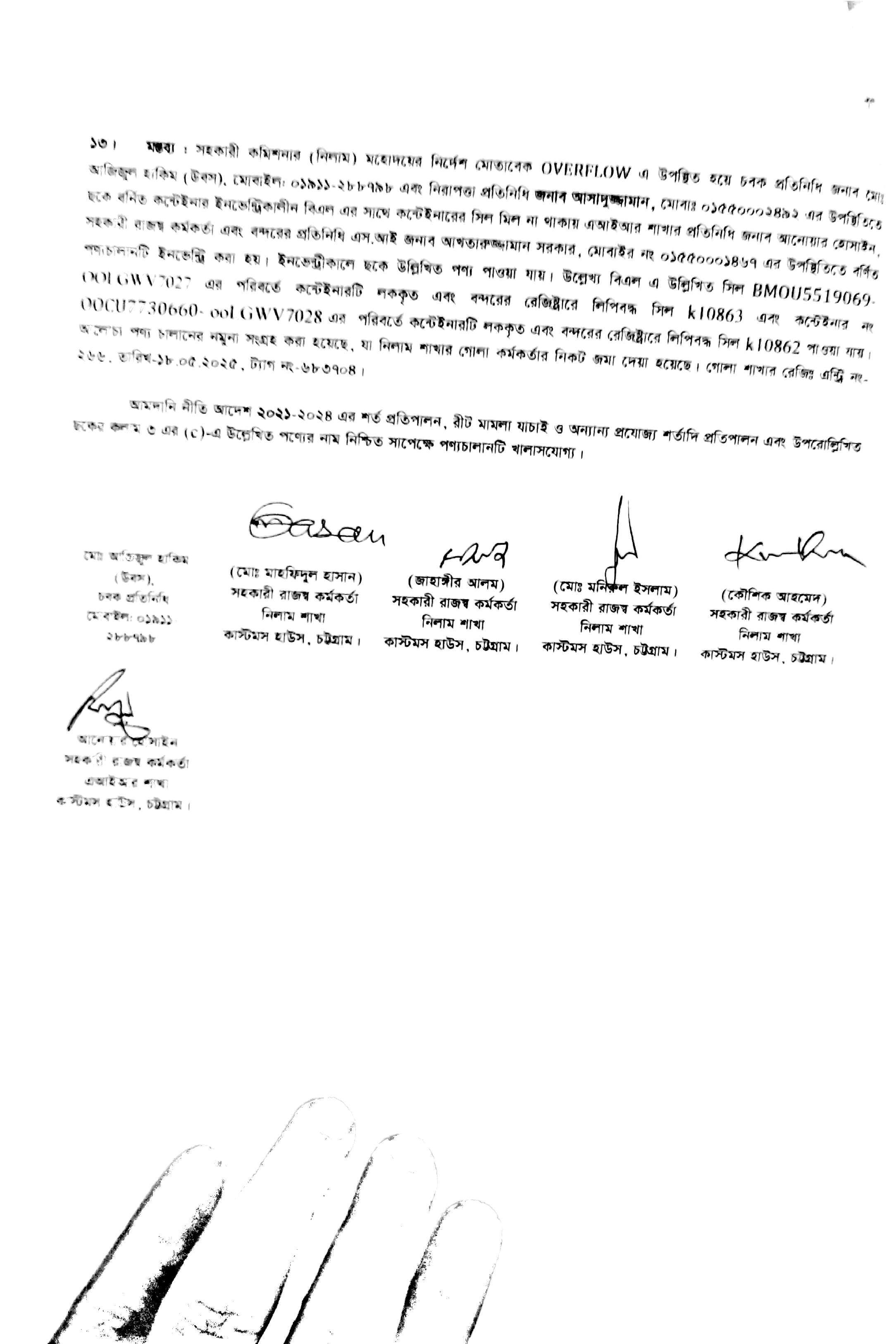 Terms & condition : আমদানি নীতি আদেশ এবং বিদ্যমান অন্যান্য আইন ও বিধি-বিধানের প্রযোজ্য সকল শর্ত পরিপালন এবং প্রযোজ্য ক্ষেত্রে রাসায়নিক পরীক্ষায় পণ্যের সঠিকতা ও ব্যবহার উপযোগিতা থাকা সাপেক্ষে খালাসকালে পণ্যের বর্ণনা এবং ওজন নিশ্চিত করে পণ্য ছাড়যোগ্য হবে। কোন লটভুক্ত পণ্যচালানে মেয়াদ উত্তীর্ণ/ধ্বসংযোগ্য পণ্য অন্তর্ভুক্ত থাকলে, উক্ত পণ্যচালানের ক্ষেত্রে মেয়াদ উত্তীর্ণ/ধ্বসংযোগ্য পণ্য ব্যতীত (প্রযোজ্য ক্ষেত্রে) কেবল মেয়াদযুক্ত/নিলামযোগ্য পণ্যসমূহ বিদ্যমান ও প্রযোজ্য আইন ও বিধি-বিধানের প্রযোজ্য সকল শর্ত পরিপালন সাপেক্ষে পণ্য ছাড়যোগ্য হবে। সার্ভার জটিলতা এড়ানোর জন্য আগ্রহী নিলাম ক্রেতাগণকে সরেজমিন পণ্য দেখে নিলামের নির্ধারিত শেষ তারিখ ও সময়ের (২৪/১২/২০২৫ খ্রি. তারিখ দুপুর ০২.০০ টা) পূর্বেই বিশেষ ই-নিলামে অংশগ্রহণ করার জন্য অনুরোধ করা যাচ্ছে। কোনরূপ কারণ দর্শানো ব্যতিরেকে কর্তৃপক্ষ যে কোন সময় ও পর্যায়ে যে কোন লট বা সকল লটের নিলাম আংশিক বা সম্পূর্ণ স্থগিত বা বাতিলের অধিকার সংরক্ষণ করেন।