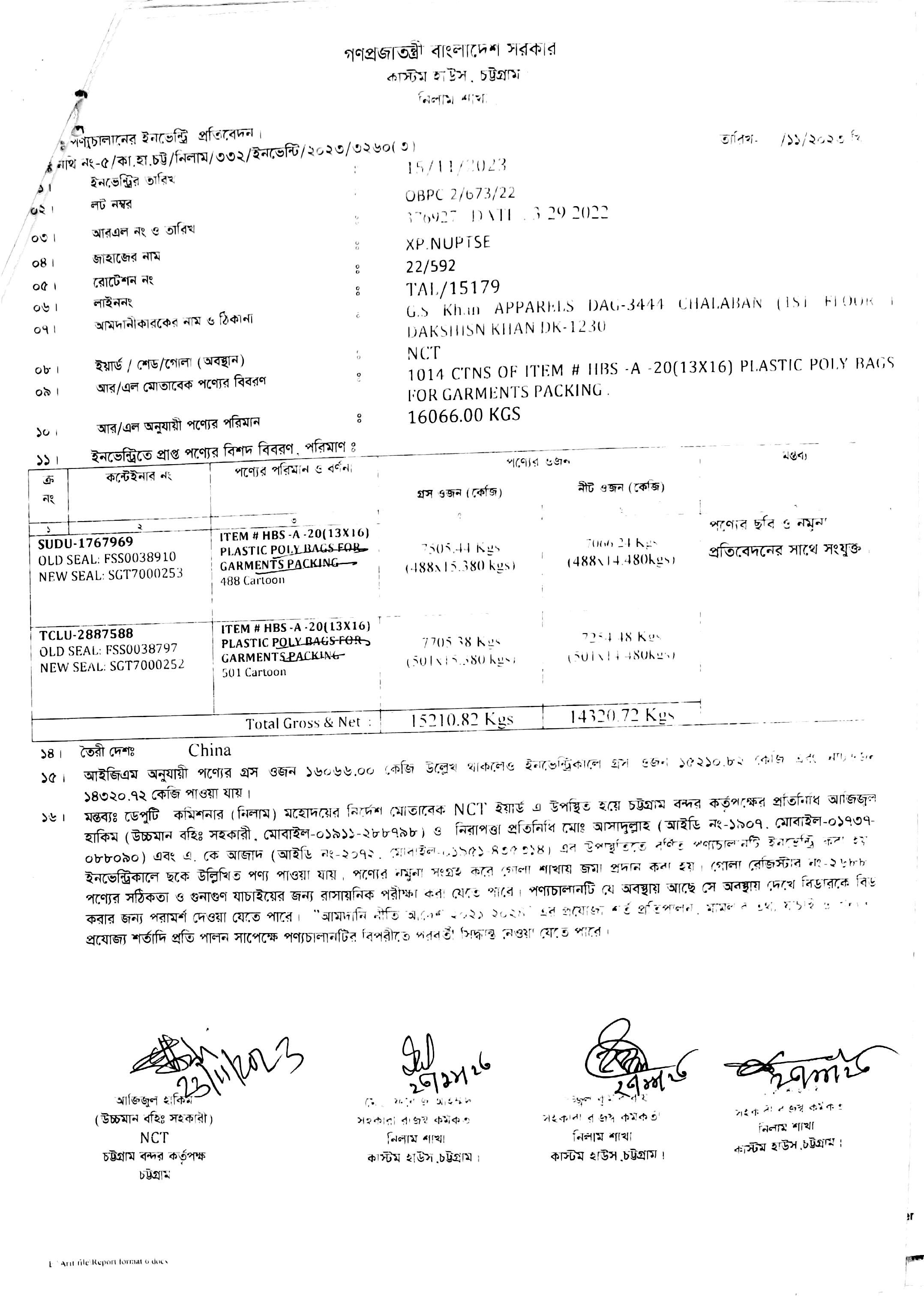 Plastic Poly Bags for Garments Packing (আমদানি নীতি আদেশের অনুচ্ছেদ-২১(৮)(ক) মোতাবেক বিজিএমইএ বা বিকেএমইএ কর্তৃক জারিকৃত ইউটিলাইজেশন ডিক্লারেশন (ইউ.ডি.) এ প্রাপ্যতা থাকা সাপেক্ষে শুধুমাত্র স্বীকৃত তৈরি পোশাক শিল্প প্রতিষ্ঠান নিলামে অংশগ্রহণ করতে পারবেন) |