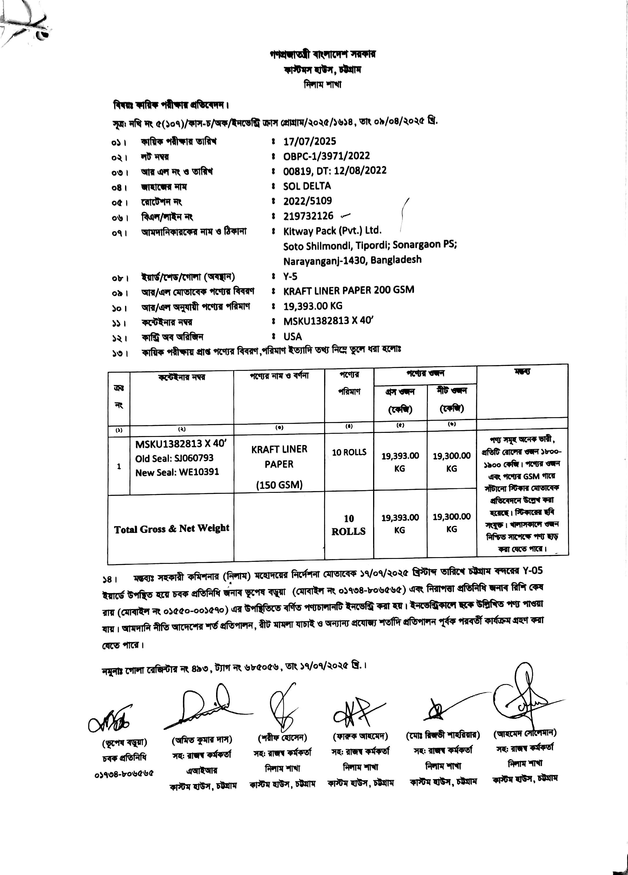 Terms & condition : আমদানি নীতি আদেশ এবং বিদ্যমান অন্যান্য আইন ও বিধি-বিধানের প্রযোজ্য সকল শর্ত পরিপালন এবং প্রযোজ্য ক্ষেত্রে রাসায়নিক পরীক্ষায় পণ্যের সঠিকতা ও ব্যবহার উপযোগিতা থাকা সাপেক্ষে খালাসকালে পণ্যের বর্ণনা এবং ওজন নিশ্চিত করে পণ্য ছাড়যোগ্য হবে। কোন লটভুক্ত পণ্যচালানে মেয়াদ উত্তীর্ণ/ধ্বসংযোগ্য পণ্য অন্তর্ভুক্ত থাকলে, উক্ত পণ্যচালানের ক্ষেত্রে মেয়াদ উত্তীর্ণ/ধ্বসংযোগ্য পণ্য ব্যতীত (প্রযোজ্য ক্ষেত্রে) কেবল মেয়াদযুক্ত/নিলামযোগ্য পণ্যসমূহ বিদ্যমান ও প্রযোজ্য আইন ও বিধি-বিধানের প্রযোজ্য সকল শর্ত পরিপালন সাপেক্ষে পণ্য ছাড়যোগ্য হবে। সার্ভার জটিলতা এড়ানোর জন্য আগ্রহী নিলাম ক্রেতাগণকে সরেজমিন পণ্য দেখে নিলামের নির্ধারিত শেষ তারিখ ও সময়ের (২৪/১২/২০২৫ খ্রি. তারিখ দুপুর ০২.০০ টা) পূর্বেই বিশেষ ই-নিলামে অংশগ্রহণ করার জন্য অনুরোধ করা যাচ্ছে। কোনরূপ কারণ দর্শানো ব্যতিরেকে কর্তৃপক্ষ যে কোন সময় ও পর্যায়ে যে কোন লট বা সকল লটের নিলাম আংশিক বা সম্পূর্ণ স্থগিত বা বাতিলের অধিকার সংরক্ষণ করেন।