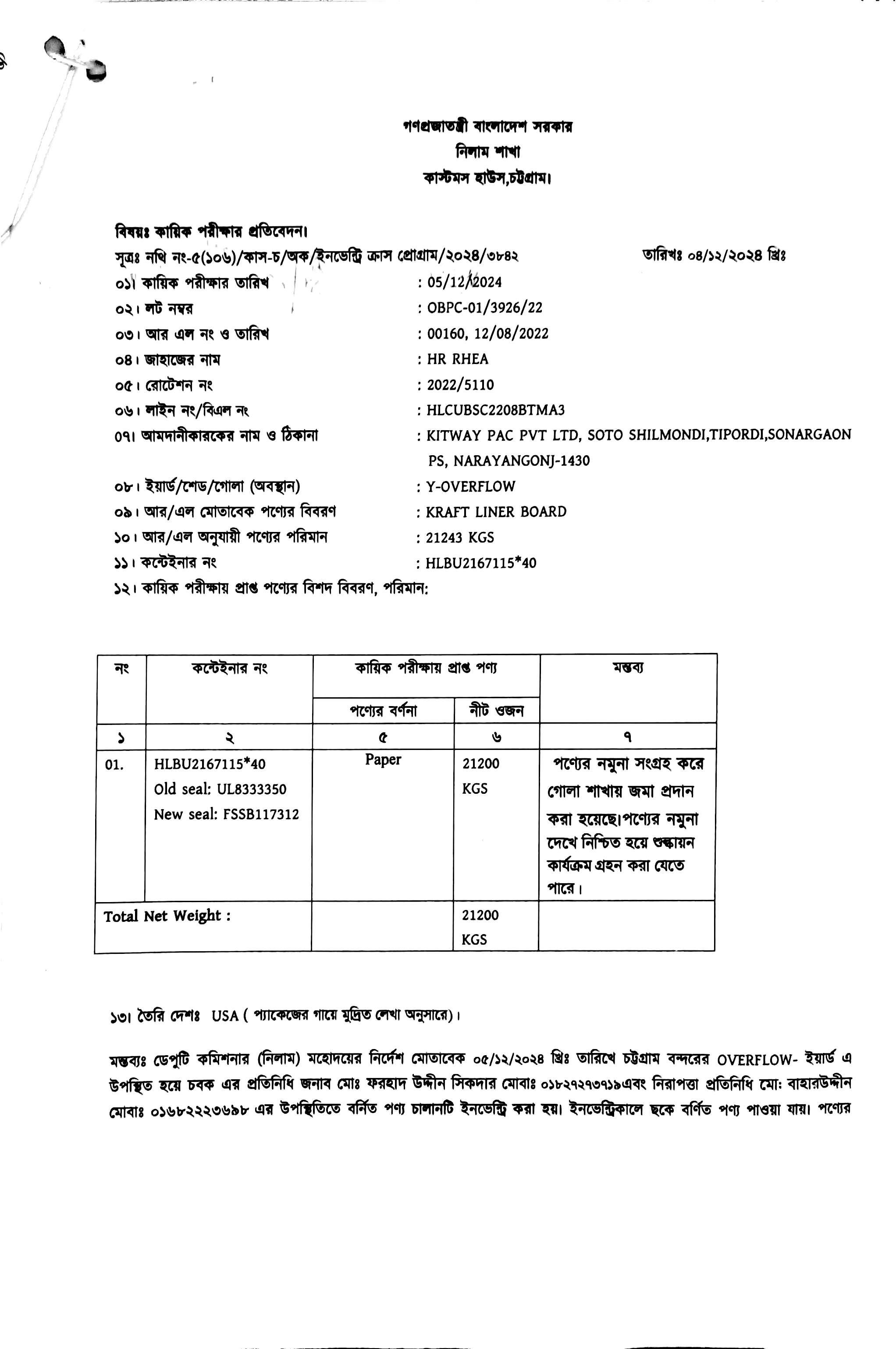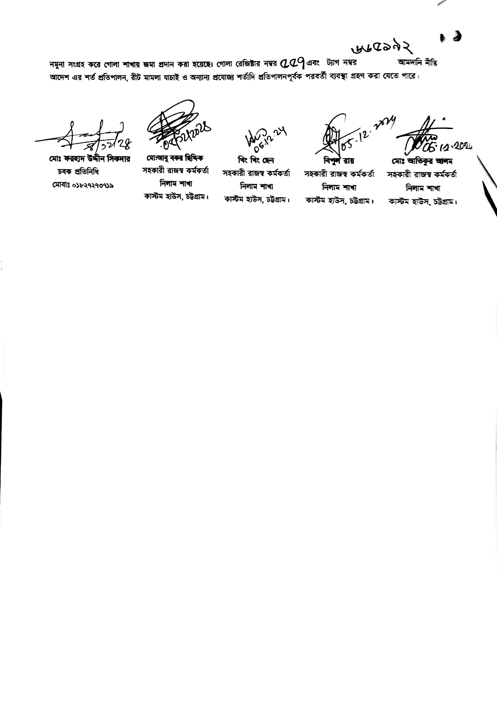 Terms & condition : আমদানি নীতি আদেশ এবং বিদ্যমান অন্যান্য আইন ও বিধি-বিধানের প্রযোজ্য সকল শর্ত পরিপালন এবং প্রযোজ্য ক্ষেত্রে রাসায়নিক পরীক্ষায় পণ্যের সঠিকতা ও ব্যবহার উপযোগিতা থাকা সাপেক্ষে খালাসকালে পণ্যের বর্ণনা এবং ওজন নিশ্চিত করে পণ্য ছাড়যোগ্য হবে। কোন লটভুক্ত পণ্যচালানে মেয়াদ উত্তীর্ণ/ধ্বসংযোগ্য পণ্য অন্তর্ভুক্ত থাকলে, উক্ত পণ্যচালানের ক্ষেত্রে মেয়াদ উত্তীর্ণ/ধ্বসংযোগ্য পণ্য ব্যতীত (প্রযোজ্য ক্ষেত্রে) কেবল মেয়াদযুক্ত/নিলামযোগ্য পণ্যসমূহ বিদ্যমান ও প্রযোজ্য আইন ও বিধি-বিধানের প্রযোজ্য সকল শর্ত পরিপালন সাপেক্ষে পণ্য ছাড়যোগ্য হবে। সার্ভার জটিলতা এড়ানোর জন্য আগ্রহী নিলাম ক্রেতাগণকে সরেজমিন পণ্য দেখে নিলামের নির্ধারিত শেষ তারিখ ও সময়ের (২৪/১২/২০২৫ খ্রি. তারিখ দুপুর ০২.০০ টা) পূর্বেই বিশেষ ই-নিলামে অংশগ্রহণ করার জন্য অনুরোধ করা যাচ্ছে। কোনরূপ কারণ দর্শানো ব্যতিরেকে কর্তৃপক্ষ যে কোন সময় ও পর্যায়ে যে কোন লট বা সকল লটের নিলাম আংশিক বা সম্পূর্ণ স্থগিত বা বাতিলের অধিকার সংরক্ষণ করেন।