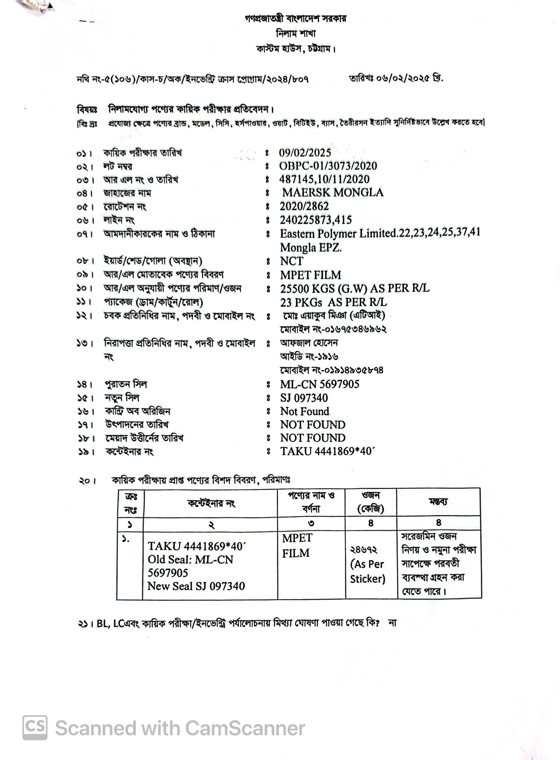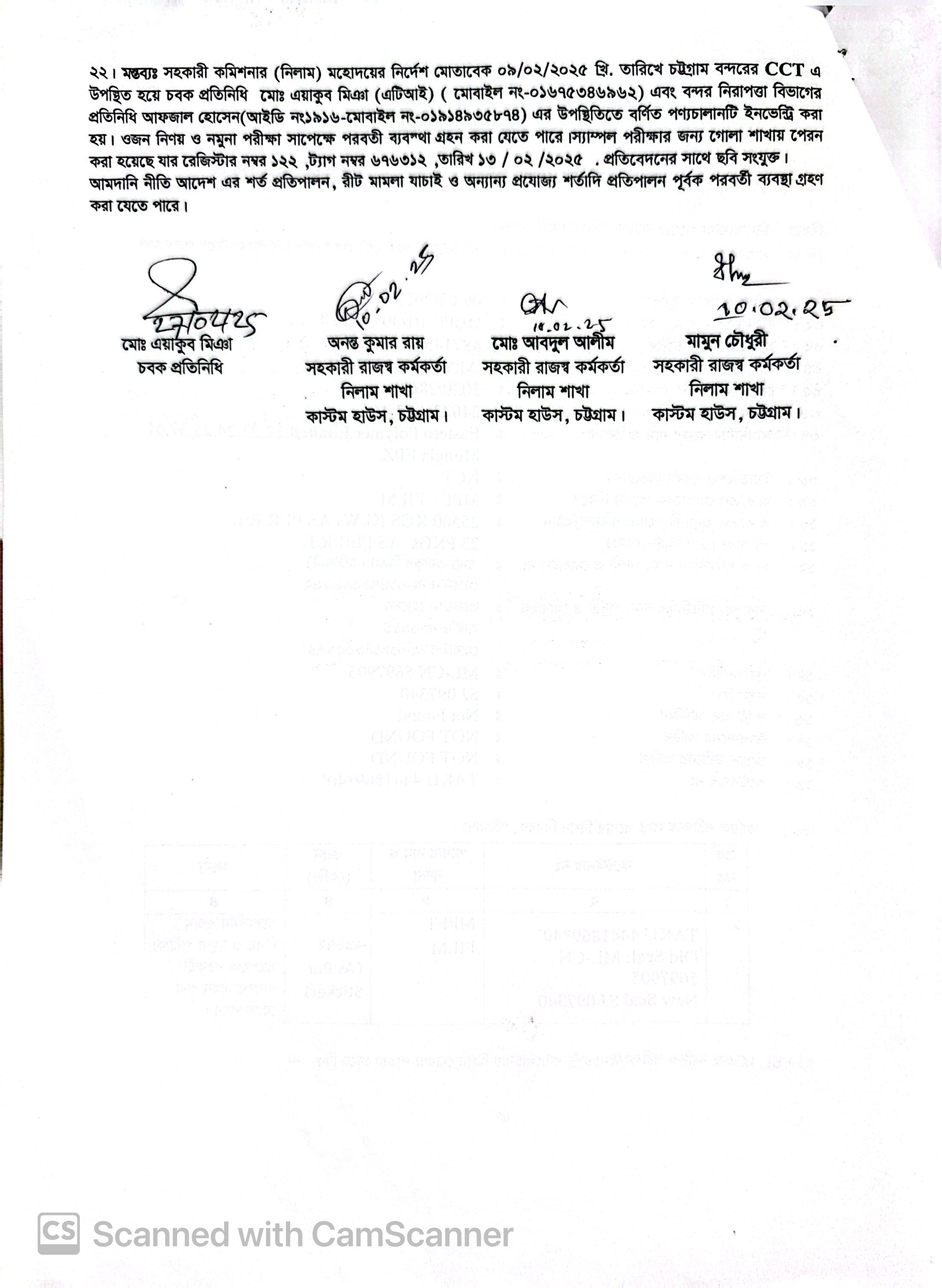Terms & condition : আমদানি নীতি আদেশ এবং বিদ্যমান অন্যান্য আইন ও বিধি-বিধানের প্রযোজ্য সকল শর্ত পরিপালন এবং প্রযোজ্য ক্ষেত্রে রাসায়নিক পরীক্ষায় পণ্যের সঠিকতা ও ব্যবহার উপযোগিতা থাকা সাপেক্ষে খালাসকালে পণ্যের বর্ণনা এবং ওজন নিশ্চিত করে পণ্য ছাড়যোগ্য হবে। কোন লটভুক্ত পণ্যচালানে মেয়াদ উত্তীর্ণ/ধ্বসংযোগ্য পণ্য অন্তর্ভুক্ত থাকলে, উক্ত পণ্যচালানের ক্ষেত্রে মেয়াদ উত্তীর্ণ/ধ্বসংযোগ্য পণ্য ব্যতীত (প্রযোজ্য ক্ষেত্রে) কেবল মেয়াদযুক্ত/নিলামযোগ্য পণ্যসমূহ বিদ্যমান ও প্রযোজ্য আইন ও বিধি-বিধানের প্রযোজ্য সকল শর্ত পরিপালন সাপেক্ষে পণ্য ছাড়যোগ্য হবে। সার্ভার জটিলতা এড়ানোর জন্য আগ্রহী নিলাম ক্রেতাগণকে সরেজমিন পণ্য দেখে নিলামের নির্ধারিত শেষ তারিখ ও সময়ের (২৪/১২/২০২৫ খ্রি. তারিখ দুপুর ০২.০০ টা) পূর্বেই বিশেষ ই-নিলামে অংশগ্রহণ করার জন্য অনুরোধ করা যাচ্ছে। কোনরূপ কারণ দর্শানো ব্যতিরেকে কর্তৃপক্ষ যে কোন সময় ও পর্যায়ে যে কোন লট বা সকল লটের নিলাম আংশিক বা সম্পূর্ণ স্থগিত বা বাতিলের অধিকার সংরক্ষণ করেন।