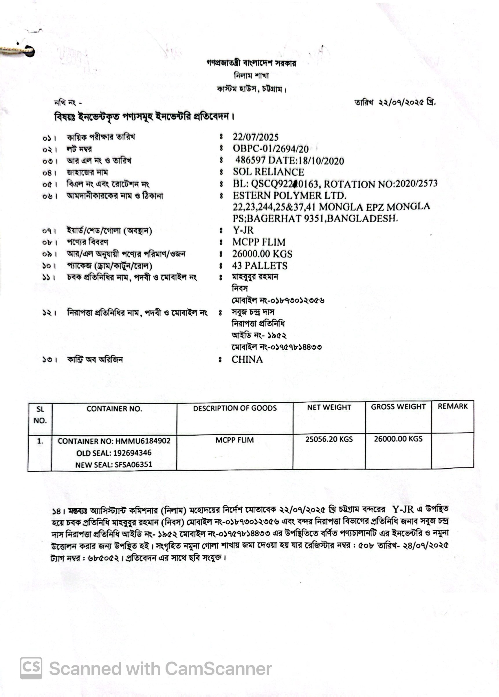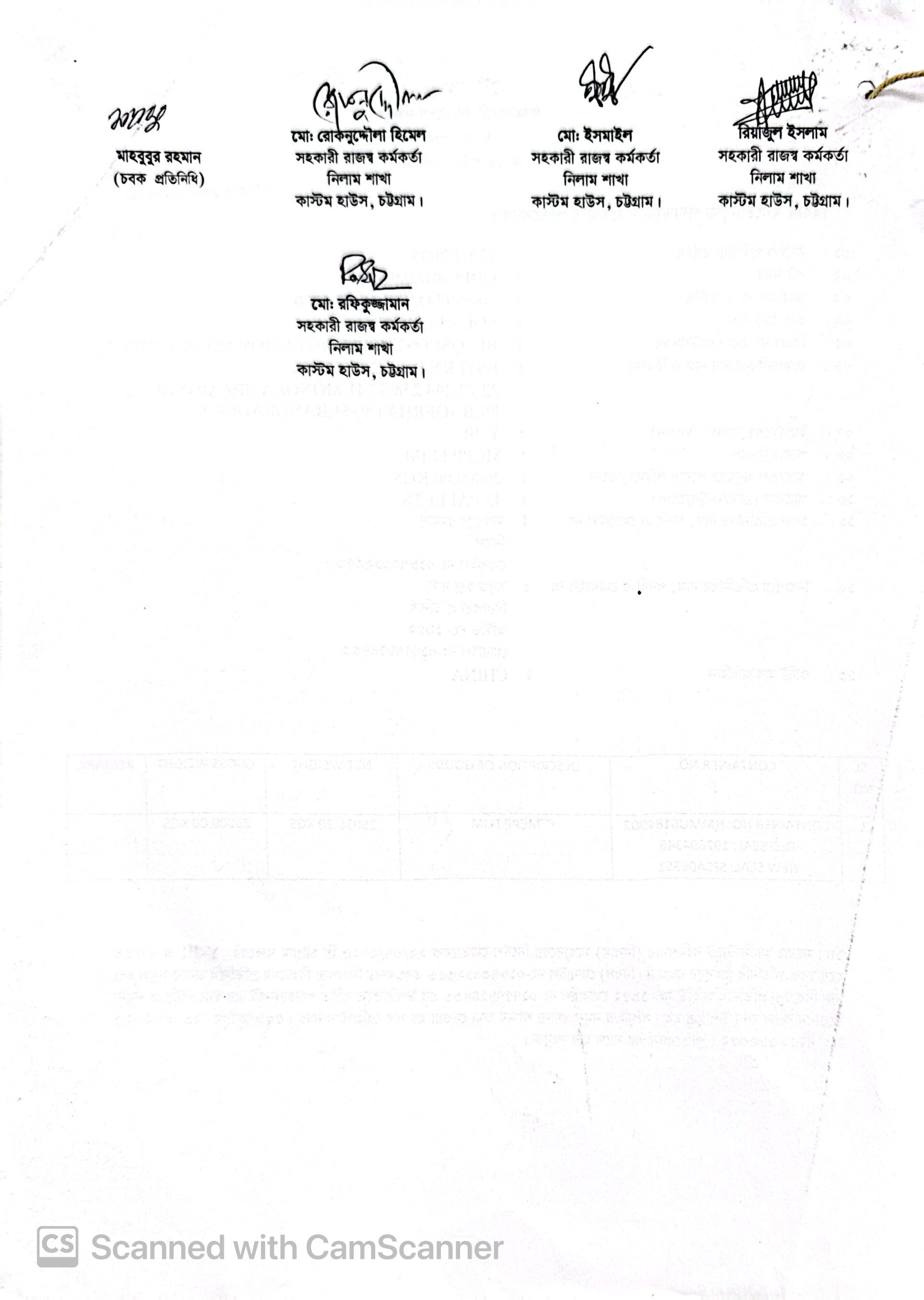 Terms & condition : আমদানি নীতি আদেশ এবং বিদ্যমান অন্যান্য আইন ও বিধি-বিধানের প্রযোজ্য সকল শর্ত পরিপালন এবং প্রযোজ্য ক্ষেত্রে রাসায়নিক পরীক্ষায় পণ্যের সঠিকতা ও ব্যবহার উপযোগিতা থাকা সাপেক্ষে খালাসকালে পণ্যের বর্ণনা এবং ওজন নিশ্চিত করে পণ্য ছাড়যোগ্য হবে। কোন লটভুক্ত পণ্যচালানে মেয়াদ উত্তীর্ণ/ধ্বসংযোগ্য পণ্য অন্তর্ভুক্ত থাকলে, উক্ত পণ্যচালানের ক্ষেত্রে মেয়াদ উত্তীর্ণ/ধ্বসংযোগ্য পণ্য ব্যতীত (প্রযোজ্য ক্ষেত্রে) কেবল মেয়াদযুক্ত/নিলামযোগ্য পণ্যসমূহ বিদ্যমান ও প্রযোজ্য আইন ও বিধি-বিধানের প্রযোজ্য সকল শর্ত পরিপালন সাপেক্ষে পণ্য ছাড়যোগ্য হবে। সার্ভার জটিলতা এড়ানোর জন্য আগ্রহী নিলাম ক্রেতাগণকে সরেজমিন পণ্য দেখে নিলামের নির্ধারিত শেষ তারিখ ও সময়ের (২৪/১২/২০২৫ খ্রি. তারিখ দুপুর ০২.০০ টা) পূর্বেই বিশেষ ই-নিলামে অংশগ্রহণ করার জন্য অনুরোধ করা যাচ্ছে। কোনরূপ কারণ দর্শানো ব্যতিরেকে কর্তৃপক্ষ যে কোন সময় ও পর্যায়ে যে কোন লট বা সকল লটের নিলাম আংশিক বা সম্পূর্ণ স্থগিত বা বাতিলের অধিকার সংরক্ষণ করেন।