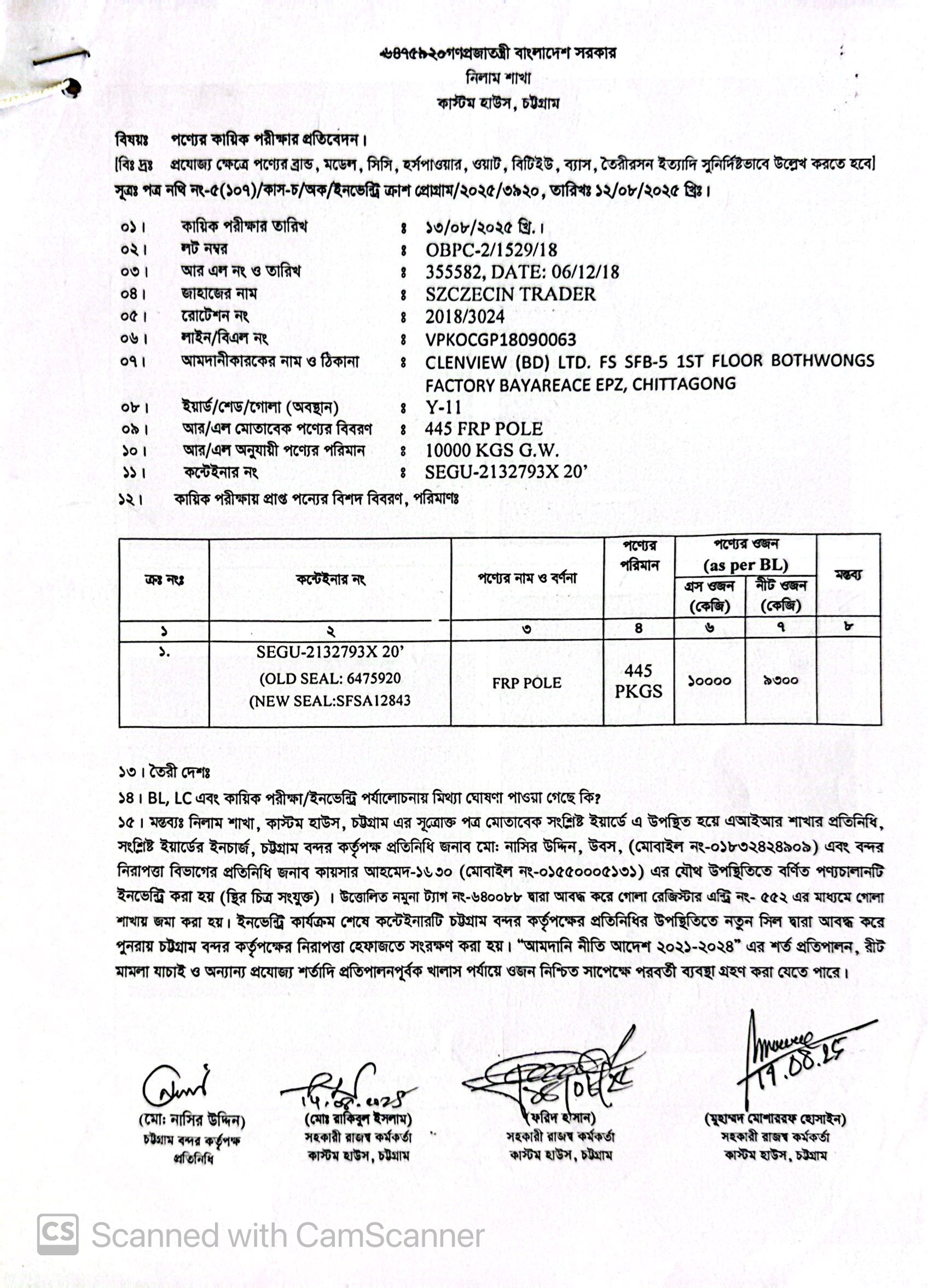 Terms & condition : আমদানি নীতি আদেশ এবং বিদ্যমান অন্যান্য আইন ও বিধি-বিধানের প্রযোজ্য সকল শর্ত পরিপালন এবং প্রযোজ্য ক্ষেত্রে রাসায়নিক পরীক্ষায় পণ্যের সঠিকতা ও ব্যবহার উপযোগিতা থাকা সাপেক্ষে খালাসকালে পণ্যের বর্ণনা এবং ওজন নিশ্চিত করে পণ্য ছাড়যোগ্য হবে। কোন লটভুক্ত পণ্যচালানে মেয়াদ উত্তীর্ণ/ধ্বসংযোগ্য পণ্য অন্তর্ভুক্ত থাকলে, উক্ত পণ্যচালানের ক্ষেত্রে মেয়াদ উত্তীর্ণ/ধ্বসংযোগ্য পণ্য ব্যতীত (প্রযোজ্য ক্ষেত্রে) কেবল মেয়াদযুক্ত/নিলামযোগ্য পণ্যসমূহ বিদ্যমান ও প্রযোজ্য আইন ও বিধি-বিধানের প্রযোজ্য সকল শর্ত পরিপালন সাপেক্ষে পণ্য ছাড়যোগ্য হবে। সার্ভার জটিলতা এড়ানোর জন্য আগ্রহী নিলাম ক্রেতাগণকে সরেজমিন পণ্য দেখে নিলামের নির্ধারিত শেষ তারিখ ও সময়ের (২৪/১২/২০২৫ খ্রি. তারিখ দুপুর ০২.০০ টা) পূর্বেই বিশেষ ই-নিলামে অংশগ্রহণ করার জন্য অনুরোধ করা যাচ্ছে। কোনরূপ কারণ দর্শানো ব্যতিরেকে কর্তৃপক্ষ যে কোন সময় ও পর্যায়ে যে কোন লট বা সকল লটের নিলাম আংশিক বা সম্পূর্ণ স্থগিত বা বাতিলের অধিকার সংরক্ষণ করেন।