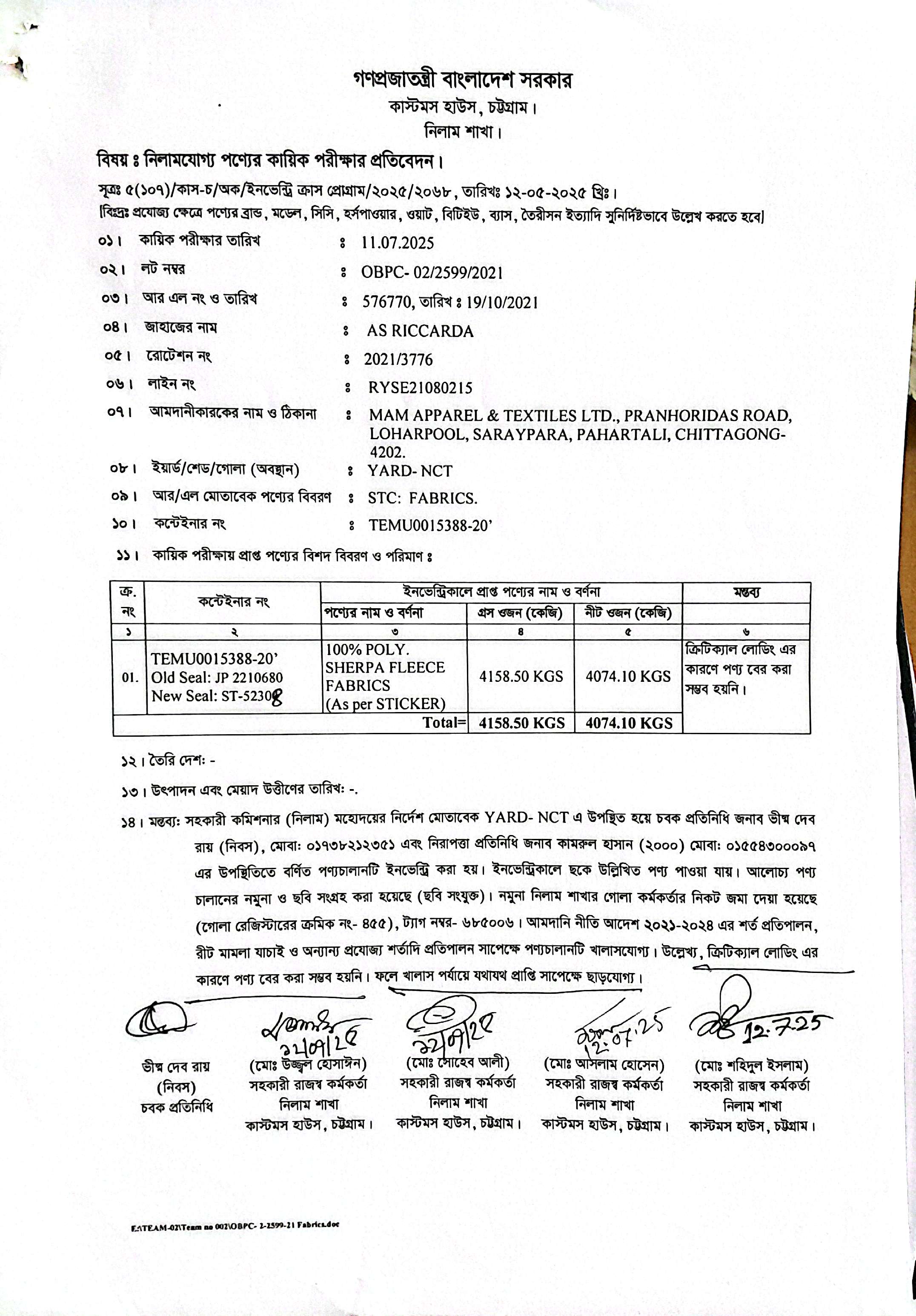 Terms & condition : আমদানি নীতি আদেশ এবং বিদ্যমান অন্যান্য আইন ও বিধি-বিধানের প্রযোজ্য সকল শর্ত পরিপালন এবং প্রযোজ্য ক্ষেত্রে রাসায়নিক পরীক্ষায় পণ্যের সঠিকতা ও ব্যবহার উপযোগিতা থাকা সাপেক্ষে খালাসকালে পণ্যের বর্ণনা এবং ওজন নিশ্চিত করে পণ্য ছাড়যোগ্য হবে। কোন লটভুক্ত পণ্যচালানে মেয়াদ উত্তীর্ণ/ধ্বসংযোগ্য পণ্য অন্তর্ভুক্ত থাকলে, উক্ত পণ্যচালানের ক্ষেত্রে মেয়াদ উত্তীর্ণ/ধ্বসংযোগ্য পণ্য ব্যতীত (প্রযোজ্য ক্ষেত্রে) কেবল মেয়াদযুক্ত/নিলামযোগ্য পণ্যসমূহ বিদ্যমান ও প্রযোজ্য আইন ও বিধি-বিধানের প্রযোজ্য সকল শর্ত পরিপালন সাপেক্ষে পণ্য ছাড়যোগ্য হবে। সার্ভার জটিলতা এড়ানোর জন্য আগ্রহী নিলাম ক্রেতাগণকে সরেজমিন পণ্য দেখে নিলামের নির্ধারিত শেষ তারিখ ও সময়ের (২৪/১২/২০২৫ খ্রি. তারিখ দুপুর ০২.০০ টা) পূর্বেই বিশেষ ই-নিলামে অংশগ্রহণ করার জন্য অনুরোধ করা যাচ্ছে। কোনরূপ কারণ দর্শানো ব্যতিরেকে কর্তৃপক্ষ যে কোন সময় ও পর্যায়ে যে কোন লট বা সকল লটের নিলাম আংশিক বা সম্পূর্ণ স্থগিত বা বাতিলের অধিকার সংরক্ষণ করেন।