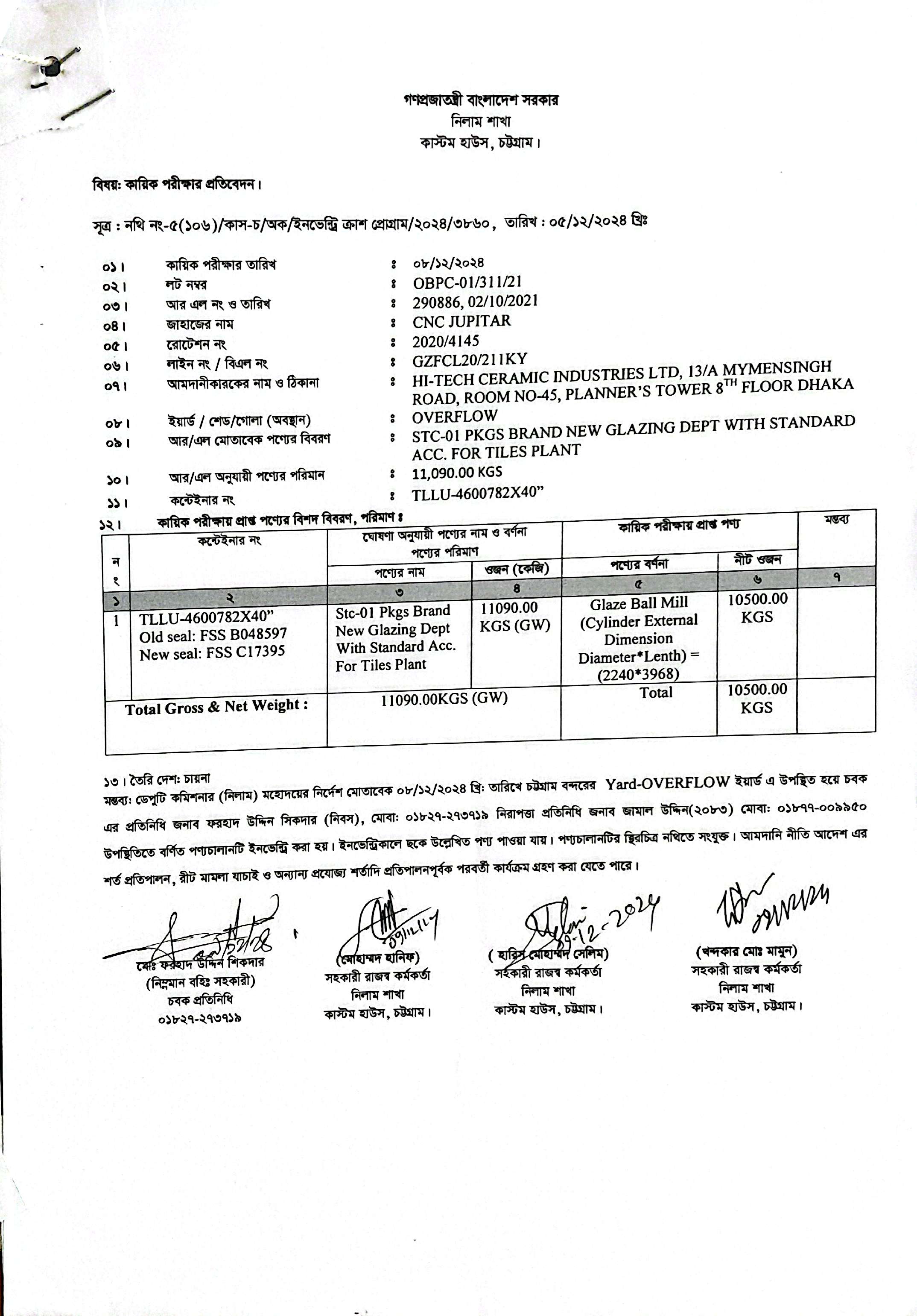 Terms & condition : আমদানি নীতি আদেশ এবং বিদ্যমান অন্যান্য আইন ও বিধি-বিধানের প্রযোজ্য সকল শর্ত পরিপালন এবং প্রযোজ্য ক্ষেত্রে রাসায়নিক পরীক্ষায় পণ্যের সঠিকতা ও ব্যবহার উপযোগিতা থাকা সাপেক্ষে খালাসকালে পণ্যের বর্ণনা এবং ওজন নিশ্চিত করে পণ্য ছাড়যোগ্য হবে। কোন লটভুক্ত পণ্যচালানে মেয়াদ উত্তীর্ণ/ধ্বসংযোগ্য পণ্য অন্তর্ভুক্ত থাকলে, উক্ত পণ্যচালানের ক্ষেত্রে মেয়াদ উত্তীর্ণ/ধ্বসংযোগ্য পণ্য ব্যতীত (প্রযোজ্য ক্ষেত্রে) কেবল মেয়াদযুক্ত/নিলামযোগ্য পণ্যসমূহ বিদ্যমান ও প্রযোজ্য আইন ও বিধি-বিধানের প্রযোজ্য সকল শর্ত পরিপালন সাপেক্ষে পণ্য ছাড়যোগ্য হবে। সার্ভার জটিলতা এড়ানোর জন্য আগ্রহী নিলাম ক্রেতাগণকে সরেজমিন পণ্য দেখে নিলামের নির্ধারিত শেষ তারিখ ও সময়ের (২৪/১২/২০২৫ খ্রি. তারিখ দুপুর ০২.০০ টা) পূর্বেই বিশেষ ই-নিলামে অংশগ্রহণ করার জন্য অনুরোধ করা যাচ্ছে। কোনরূপ কারণ দর্শানো ব্যতিরেকে কর্তৃপক্ষ যে কোন সময় ও পর্যায়ে যে কোন লট বা সকল লটের নিলাম আংশিক বা সম্পূর্ণ স্থগিত বা বাতিলের অধিকার সংরক্ষণ করেন।