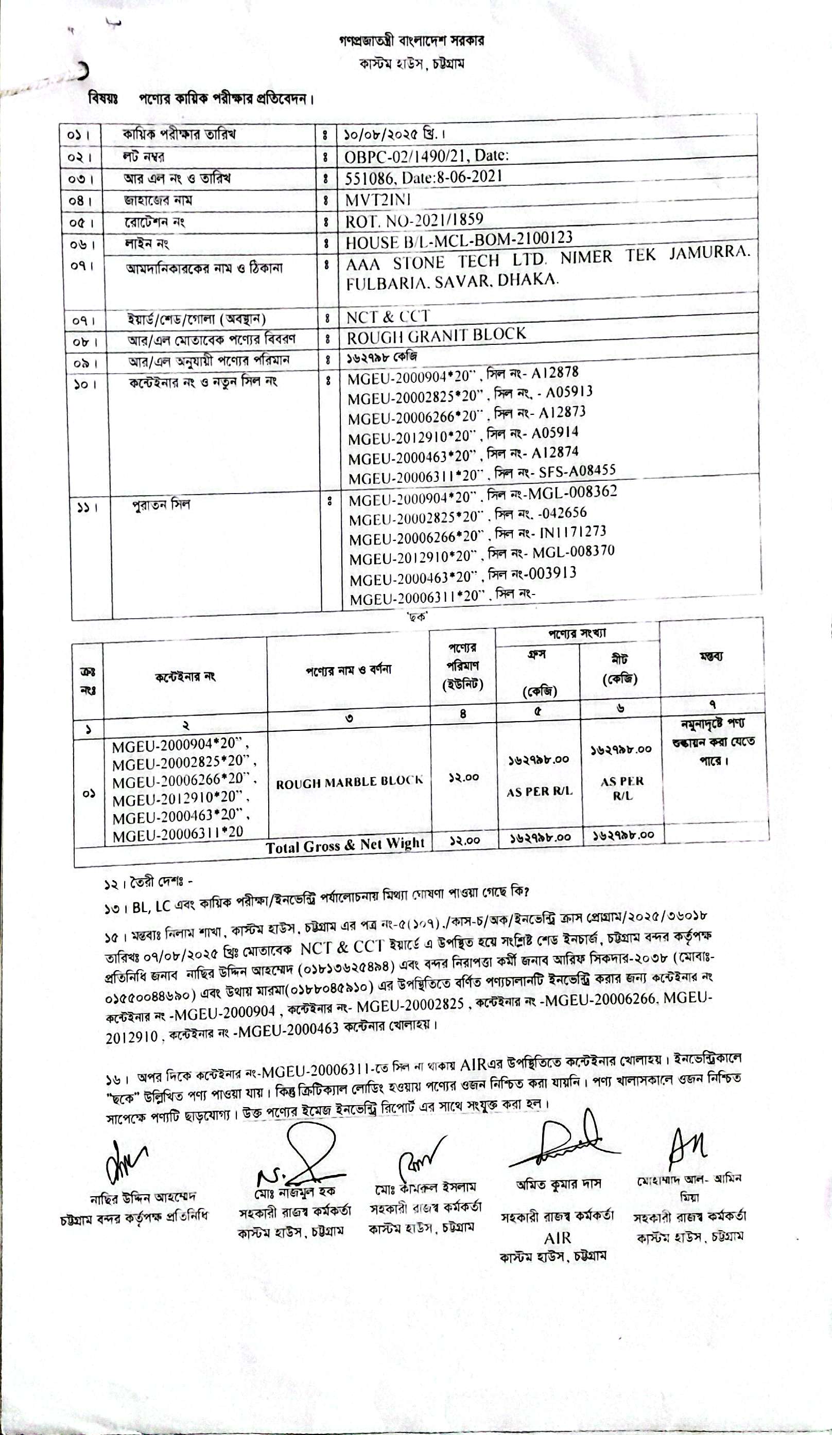 Terms & condition : আমদানি নীতি আদেশ এবং বিদ্যমান অন্যান্য আইন ও বিধি-বিধানের প্রযোজ্য সকল শর্ত পরিপালন এবং প্রযোজ্য ক্ষেত্রে রাসায়নিক পরীক্ষায় পণ্যের সঠিকতা ও ব্যবহার উপযোগিতা থাকা সাপেক্ষে খালাসকালে পণ্যের বর্ণনা এবং ওজন নিশ্চিত করে পণ্য ছাড়যোগ্য হবে। কোন লটভুক্ত পণ্যচালানে মেয়াদ উত্তীর্ণ/ধ্বসংযোগ্য পণ্য অন্তর্ভুক্ত থাকলে, উক্ত পণ্যচালানের ক্ষেত্রে মেয়াদ উত্তীর্ণ/ধ্বসংযোগ্য পণ্য ব্যতীত (প্রযোজ্য ক্ষেত্রে) কেবল মেয়াদযুক্ত/নিলামযোগ্য পণ্যসমূহ বিদ্যমান ও প্রযোজ্য আইন ও বিধি-বিধানের প্রযোজ্য সকল শর্ত পরিপালন সাপেক্ষে পণ্য ছাড়যোগ্য হবে। সার্ভার জটিলতা এড়ানোর জন্য আগ্রহী নিলাম ক্রেতাগণকে সরেজমিন পণ্য দেখে নিলামের নির্ধারিত শেষ তারিখ ও সময়ের (২৪/১২/২০২৫ খ্রি. তারিখ দুপুর ০২.০০ টা) পূর্বেই বিশেষ ই-নিলামে অংশগ্রহণ করার জন্য অনুরোধ করা যাচ্ছে। কোনরূপ কারণ দর্শানো ব্যতিরেকে কর্তৃপক্ষ যে কোন সময় ও পর্যায়ে যে কোন লট বা সকল লটের নিলাম আংশিক বা সম্পূর্ণ স্থগিত বা বাতিলের অধিকার সংরক্ষণ করেন।