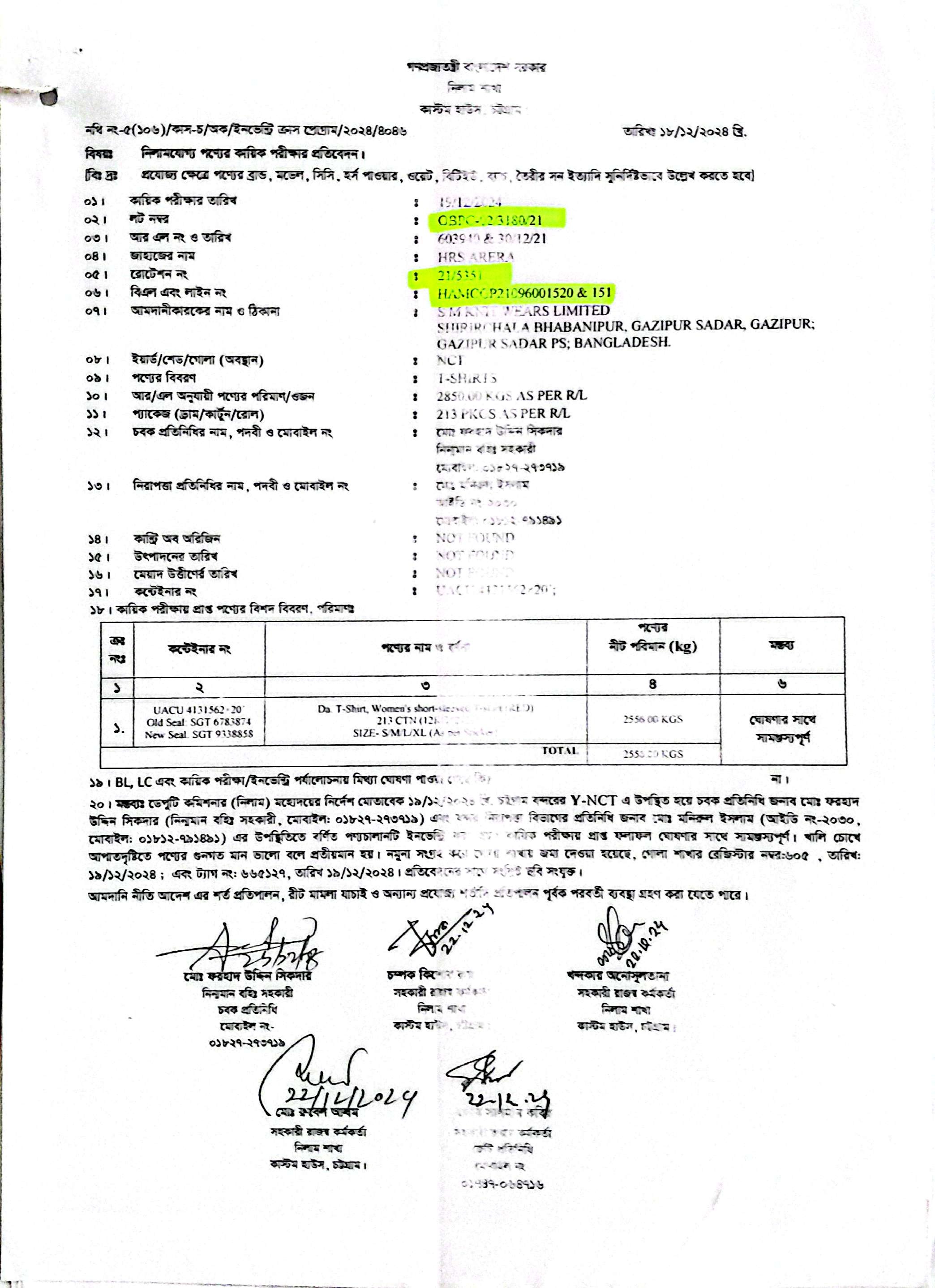 Terms & condition : আমদানি নীতি আদেশ এবং বিদ্যমান অন্যান্য আইন ও বিধি-বিধানের প্রযোজ্য সকল শর্ত পরিপালন এবং প্রযোজ্য ক্ষেত্রে রাসায়নিক পরীক্ষায় পণ্যের সঠিকতা ও ব্যবহার উপযোগিতা থাকা সাপেক্ষে খালাসকালে পণ্যের বর্ণনা এবং ওজন নিশ্চিত করে পণ্য ছাড়যোগ্য হবে। কোন লটভুক্ত পণ্যচালানে মেয়াদ উত্তীর্ণ/ধ্বসংযোগ্য পণ্য অন্তর্ভুক্ত থাকলে, উক্ত পণ্যচালানের ক্ষেত্রে মেয়াদ উত্তীর্ণ/ধ্বসংযোগ্য পণ্য ব্যতীত (প্রযোজ্য ক্ষেত্রে) কেবল মেয়াদযুক্ত/নিলামযোগ্য পণ্যসমূহ বিদ্যমান ও প্রযোজ্য আইন ও বিধি-বিধানের প্রযোজ্য সকল শর্ত পরিপালন সাপেক্ষে পণ্য ছাড়যোগ্য হবে। সার্ভার জটিলতা এড়ানোর জন্য আগ্রহী নিলাম ক্রেতাগণকে সরেজমিন পণ্য দেখে নিলামের নির্ধারিত শেষ তারিখ ও সময়ের (২৪/১২/২০২৫ খ্রি. তারিখ দুপুর ০২.০০ টা) পূর্বেই বিশেষ ই-নিলামে অংশগ্রহণ করার জন্য অনুরোধ করা যাচ্ছে। কোনরূপ কারণ দর্শানো ব্যতিরেকে কর্তৃপক্ষ যে কোন সময় ও পর্যায়ে যে কোন লট বা সকল লটের নিলাম আংশিক বা সম্পূর্ণ স্থগিত বা বাতিলের অধিকার সংরক্ষণ করেন।