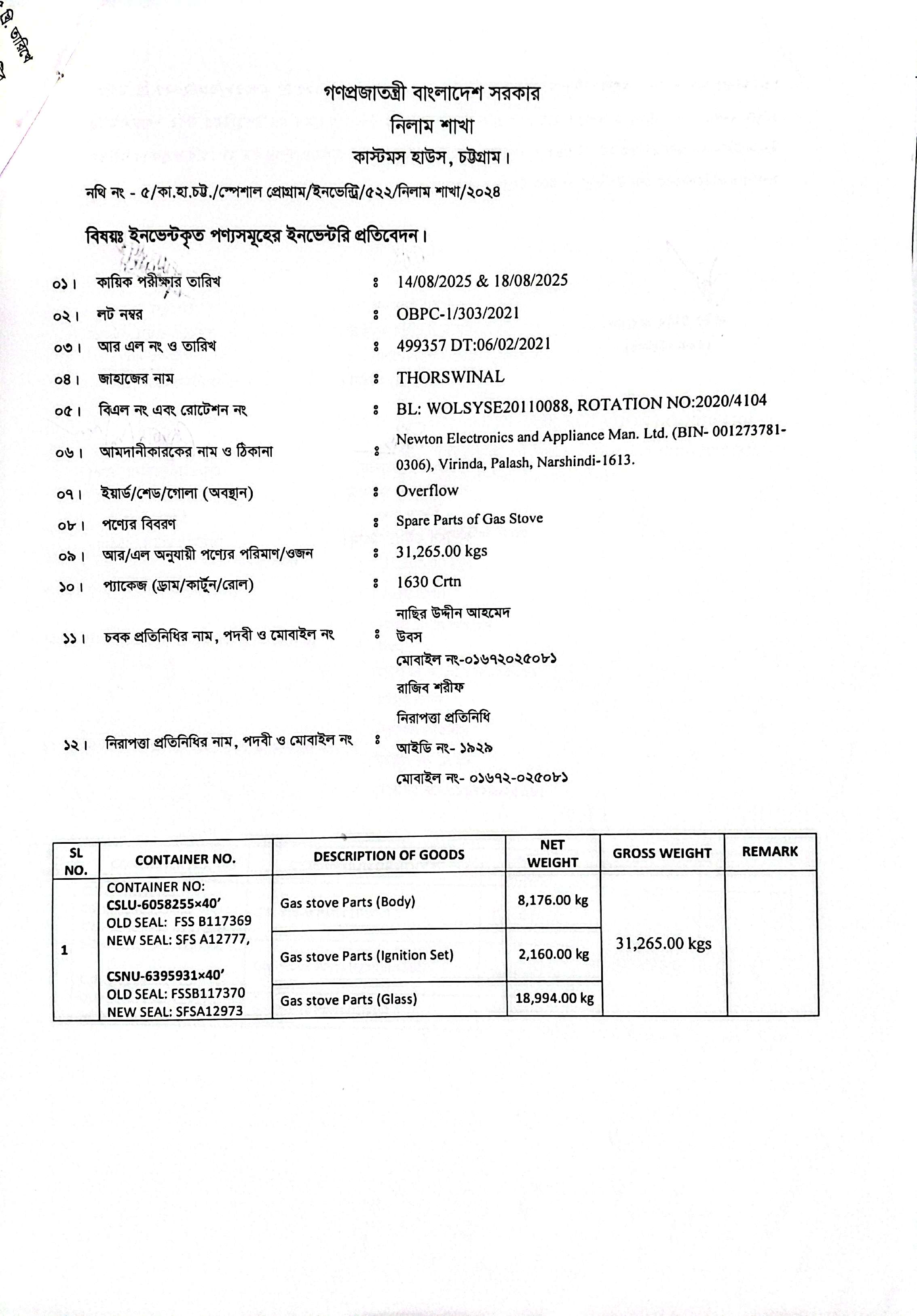 লটের শিরোনাম :(1) Gas Stove (Body) 8176 Kgs; (2) Gas Stove Parts (Ignition Set) 2160 Kgs; (3) Gas Stove Parts (Glass) 18994 Kgs(Previous Bid: 0 TK)