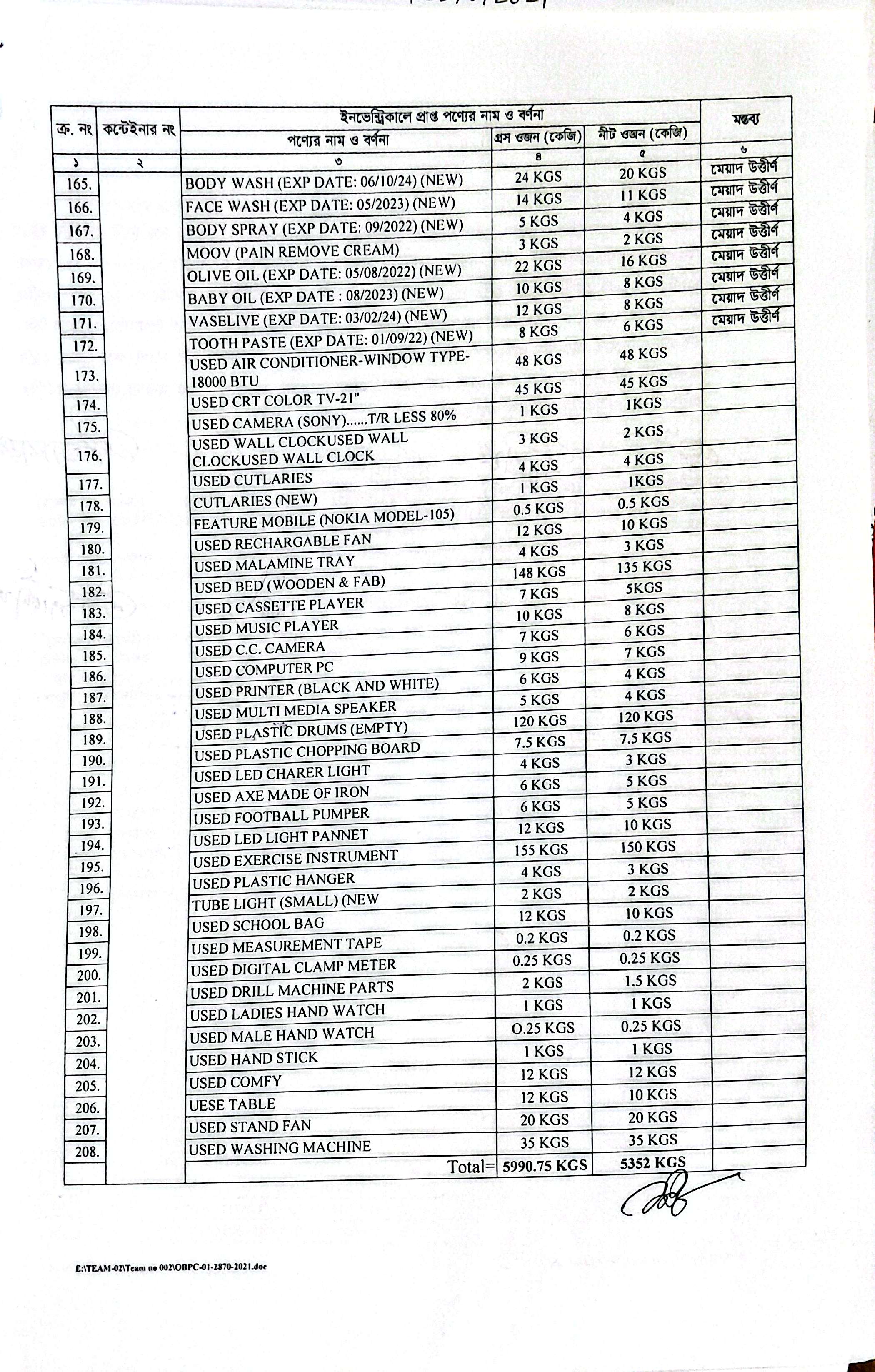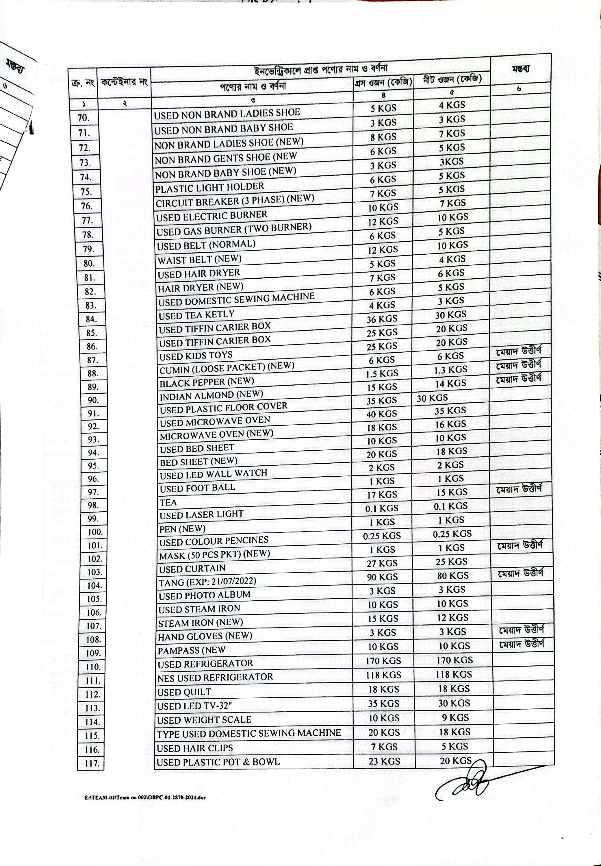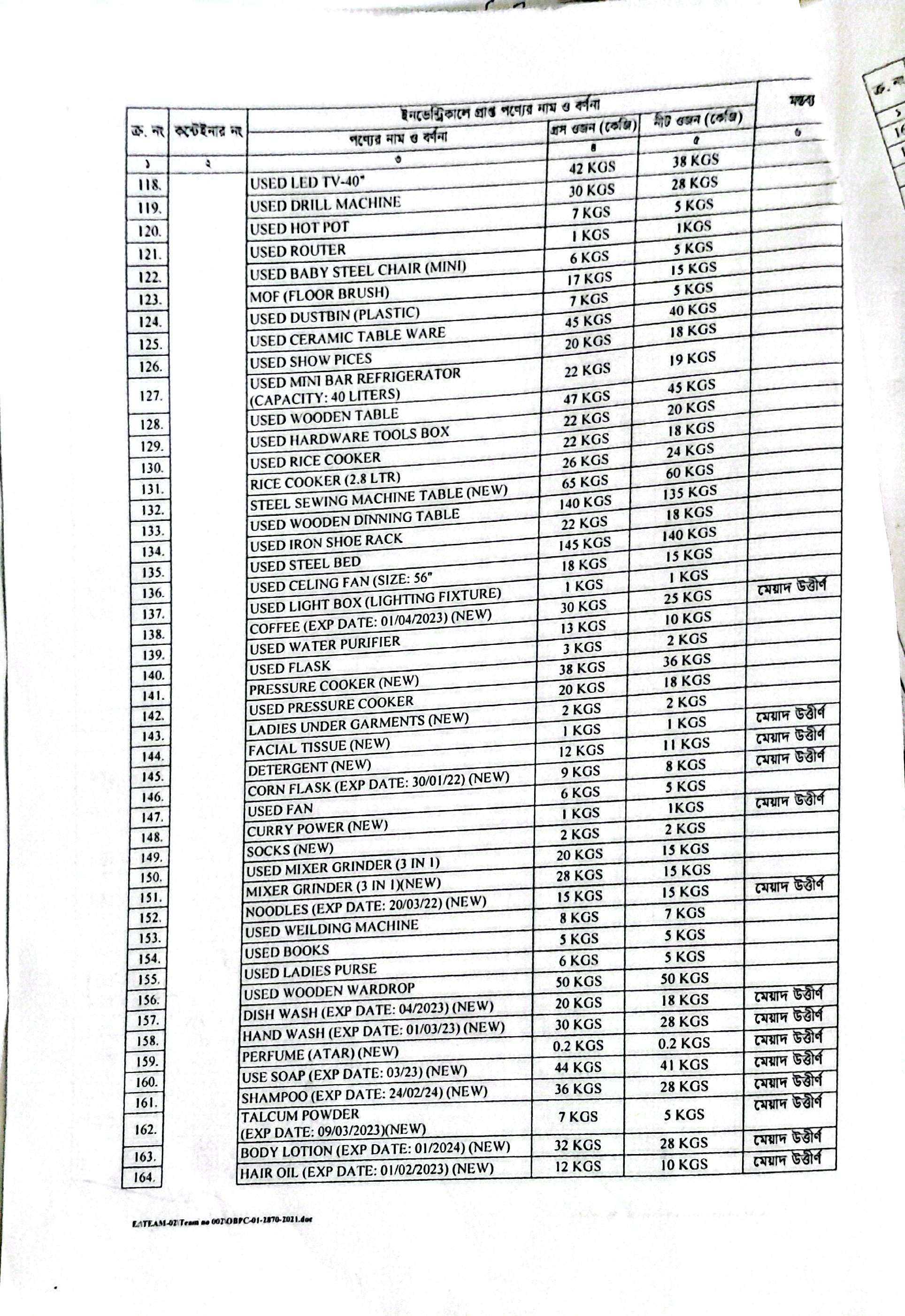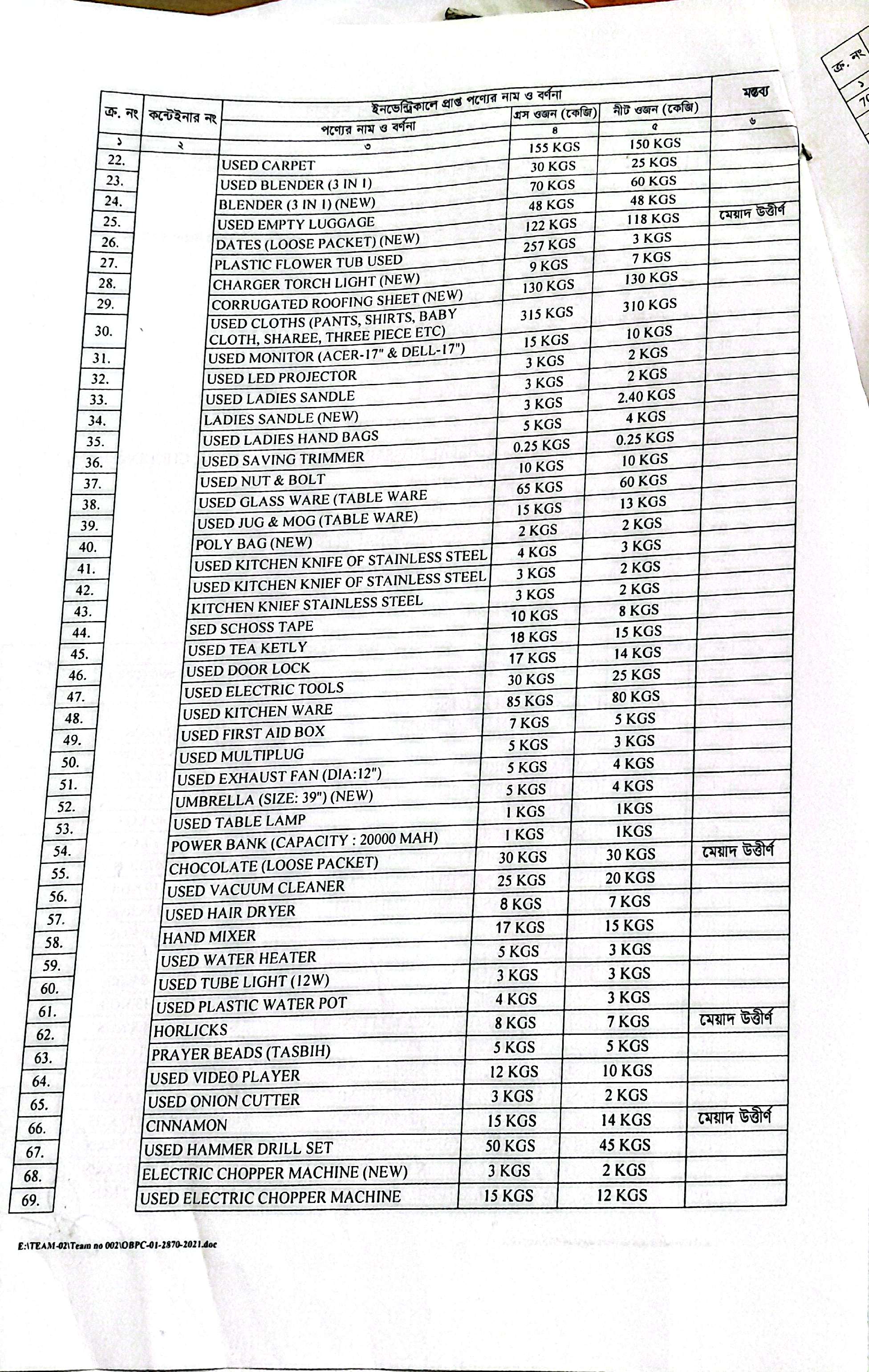 Personal Effects: (1) Used Chair (Made of Iron)= 20 Kgs; (2) Steel Net= 6.50 Kgs; (3) Carrum Board= 18 Kgs; (4) Used Iron Bird Case= 5 Kgs; (5) Used Iron Stand= 40 Kgs; (6) Used Plastic Bucket & Pot= 7 Kgs; (7) Used Aluminium Kitchen Ware= 67 Kgs; (8) Used Prayer Mat (Size: 80X120 CM)=10 Kgs; (9) Prayer Mat (Size: 80X10 Cm) (New)= 138 Kgs; (10) Used Fry Pan=10 Kgs; (11) Fry Pan (New)=15 Kgs; (12) Used Vacuum Flas= 8 Kgs; (13) Vacuum Flask (New)= 13 Kgs; (14) Energy Saving Bulb 22 Watt (New)= 1.8 Kgs; (15) Switch & Socket (New)= 11 Kgs; (16) Used Blanket (Size: 220 X 240 CM)= 128 Kgs; (17) Used Blanket (Size: 220 X 240 CM)= 54 Kgs; (18) Blanket (Size: 220 X 240 CM) (New)= 539 Kgs; (19) Blanket (Size: 200 X 240 CM) (New)=207 Kgs; (20) Conductor Cable In Roll (New)= 115 Kgs; (21) Cardamom (New)= 7 Kgs; (22) Used Carpet=150 Kgs; (23) Used Blender (3 In 1)= 25 Kgs; (24) Blender (3 In 1) (New)= 60 Kgs; (25) Used Empty Luggage=48 Kgs; (26) Dates (Loose Packet) (New)=118 Kgs (Date Expired); (27) Plastic Flower Tub Used=3 Kgs; (28) Charger Torch Light (New)= 7 Kgs; (29) Corrugated Roofing Sheet (New)= 130 Kgs; (30) Used Cloths (Pants, Shirts, Baby Cloth, Sharee, Three Piece Etc.)=310 Kgs; (31) Used Monitor (Acer-17" & Dell-17")= 10 Kgs; (32) Used LED Projector=2 Kgs; (33) Used Ladies Sandle=2 Kgs; (34) Ladies Sandle (New)= 2.40 Kgs; (35) Used Ladies Hand Bags= 4 Kgs; (36) Used Saving Trimmer= 0.25 Kgs; (37) Used Nut & Bolt= 10 Kgs; (38) Used Glass Ware (Table Ware)= 60 Kgs; (39) Used Jug & Mog (Table Ware)=13 Kgs; (40) Poly Bag (New)= 2 Kgs; (41) Used Kitchen Knife of Stainless Steel= 3 Kgs; (42) Used Kitchen Knief of Stainless Steel= 2 Kgs; (43) Kitchen Knief Stainless Steel= 2 Kgs; (44) Sed Schuss Tape= 8 Kgs; (45) Used Tea Ketly= 15 Kgs; (46) Used Door Lock= 14 Kgs; (47) Used Electric Tools= 25 Kgs; (48) Used Kitchen Ware= 80 Kgs; (49) Used First Aid Box= 5 Kgs; (50) Used Multiplug= 3 Kgs; (51) Used Exhaust Fan (Dia:12")= 4 Kgs; (52) Umbrella (Size: 39") (New)= 4 Kgs; (53) Used Table Lamp= 1 Kgs; (54) Power Bank (Capacity: 20000 MAH)= 1 Kgs; (55) Chocolate (Loose Packet)= 30 Kgs (Date Expired); (56) Used Vacuum Cleaner=20 Kgs; (57) Used Hair Dryer= 7 Kgs; (58) Hand Mixer= 15 Kgs; (59) Used Water Heater = 3 Kgs; (60) Used Tube Light (12w)= 3 Kgs; (61) Used Plastic Water Pot= 3 Kgs; (62) Horlicks=7 Kgs (Date Expired); (63) Prayer Beads (Tasbih)= 5 Kgs; (64) Used Video Player=10 Kgs; (65) Used Onion Cutter= 2 Kgs; (66) Cinnamon= 14 Kgs (Date Expired); (67) Used Hammer Drill Set= 45 Kgs; (68) Electric Chopper Machine (New)= 2 Kgs; (69) Used Electric Chopper Machine= 12 Kgs; (70) Used Non-Brand Ladies Shoe=70 Kgs; (71) Used Non-Brand Baby Shoe= 3 Kgs; (72) Non-Brand Ladies Shoe (New)= 7 Kgs; (73) Non-Brand Gents Shoe (New)= 5 Kgs; (74) Non-Brand Baby Shoe (New)= 3 Kgs; (75) Plastic Light Holder= 5 Kgs; (76) Circuit Breaker (3 Phase) (New)= 5 Kgs; (77) Used Electric Burner= 7 Kgs; (78) Used Gas Burner (Two Burner)= 10 Kgs; (79) Used Belt (Normal)= 5 Kgs; (80) Waist Belt (New)= 10 Kgs; (81)Used Hair Dryer= 4 Kgs; (82) Hair Dryer (New)= 6 Kgs; (83) Used Domestic Sewing Machine= 5 Kgs; (84) Used Tea Ketly= 3 Kgs; (85) Used Tiffin Carier Box= 30 Kgs; (86) Used Tiffin Carier Box= 20 Kgs; (87) Used Kids Toys= 20 Kgs; (88) Cumin (Loose Packet) (New)= 6 Kgs (Date Expired); (89) Black Pepper (New)= 1.30 Kgs (Date Expired); (90) Indian Almond (New)= 14 Kgs (Date Expired); (91) Used Plastic Floor Cover=30 Kgs; (92) Used Microwave Oven= 35 Kgs; (93) Microwave Oven (New)=16 Kgs; (94) Used Bed Sheet= 10 Kgs; (95) Bed Sheet (New)= 18 Kgs; (96) Used LED Wall Watch= 2 Kgs; (97) Used Foot Ball= 1 Kgs; (98) Tea=15 Kgs (Date Expired); (99) Used Laser Light= 0.10 Kgs; (100) Pen (New)=1 Kgs; (101) Used Color Pencils= 0.25 Kgs; (102) Mask (50 Pcs Pkt) (New)=1 Kgs (Date Expired); (103) Used Curtain=25 Kgs; (104) Tang (Exp: 21/07/2022)= 80 Kgs; (105) Used Photo Album= 3 Kgs; (106) Used Steam Iron= 10 Kgs; (107) Steam Iron (New)= 12 Kgs; (108) Hand Gloves (New)=3 Kgs (Date Expired); (109) Pampas (New)= 10 Kgs (Date Expired); (110) Used Refrigerator=170 Kgs; (111) NES Used Refrigerator=118 Kgs; (112) Used Quilt= 18 Kgs; (113) Used LED TV-32"=30 Kgs; (114) Used Weight Scale= 9 Kgs; (115) Type Used Domestic Sewing Machine= 18 Kgs; (116) Used Hair Clips= 5 Kgs; (117) Used Plastic Pot & Bowl= 20 Kgs; (118) Used LED TV-40"= 38 Kgs; (119) Used Drill Machine= 28 Kgs; (120) Used Hot Pot= 5 Kgs; (121) Used Router= 1 Kgs; (122) Used Baby Steel Chair (Mini)= 5 Kgs; (123) Mof (Floor Brush)= 15 Kgs; (124) Used Dustbin (Plastic)= 5 Kgs; (125) Used Ceramic Table Ware= 40 Kgs; (126) Used Show Pices= 18 Kgs; (127) Used Mini Bar Refrigerator (Capacity: 40 Liters)= 19 Kgs; (128) Used Wooden Table= 45 Kgs; (129) Used Hardware Tools Box= 20 Kgs; (130) Used Rice Cooker= 18 Kgs; (131) Rice Cooker 2.8 Ltr)=24 Kgs; (132) Steel Sewing Machine Table (New)= 60 Kgs; (133) Used Wooden Dinning Table= 135 Kgs; (134) Used Iron Shoe Rack= 18 Kgs; (135) Used Steel Bed= 140 Kgs; (136) Used Celling Fan (Size: 56")= 15 Kgs; (137) Used Light Box (Lighting Fixture)= 1 Kgs; (138) Coffee (Exp Date: 01/04/2023) (New)= 25 Kgs; (139) Used Water Purifier= 10 Kgs; (140) Used Flask= 2 Kgs; (141) Pressure Cooker (New)= 36 Kgs; (142) Used Pressure Cooker= 18 Kgs; (143) Ladies Under Garments (New)= 2 Kgs; (144) Facial Tissue (New)= 1 Kgs (Date Expired); (145) Detergent (New)= 11 Kgs (Date Expired); (146) Corn Flask (Exp Date: 30/01/22) (New)= 8 Kgs; (147) Used Fan= 5 Kgs; (148) Curry Power (New)=1 Kgs (Date Expired); (149) Socks (New)= 2 Kgs; (150) Used Mixer Grinder (3 In 1)= 15 Kgs; (151) Mixer Grinder (3 In 1)(New)= 15 Kgs; (152) Noodles (Exp Date: 20/03/22) (New)= 15 Kgs; (153) Used Wielding Machine= 7 Kgs; (154) Used Books= 5 Kgs; (155) Used Ladies Purse= 5 Kgs; (156) Used Wooden Wardrop= 50 Kgs; (157) Dish Wash (Exp Date: 04/2023) (New)= 18 Kgs; (158) Hand Wash (Exp Date: 01/03/23) (New)=28 Kgs; (159) Perfume (Atar) (New)= 0.20 Kgs; (160) Use Soap (Exp Date: 03/23) (New