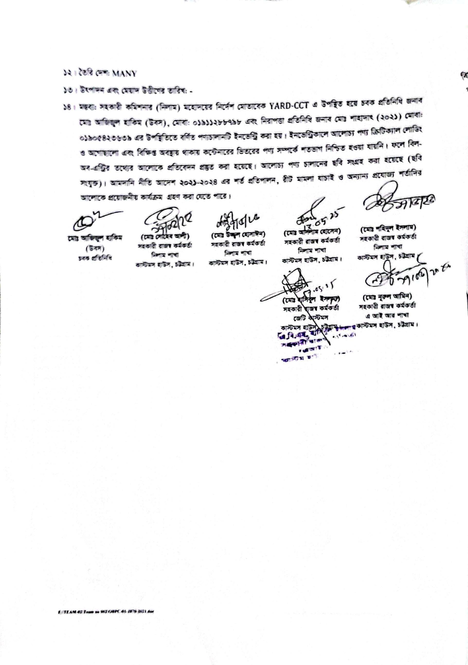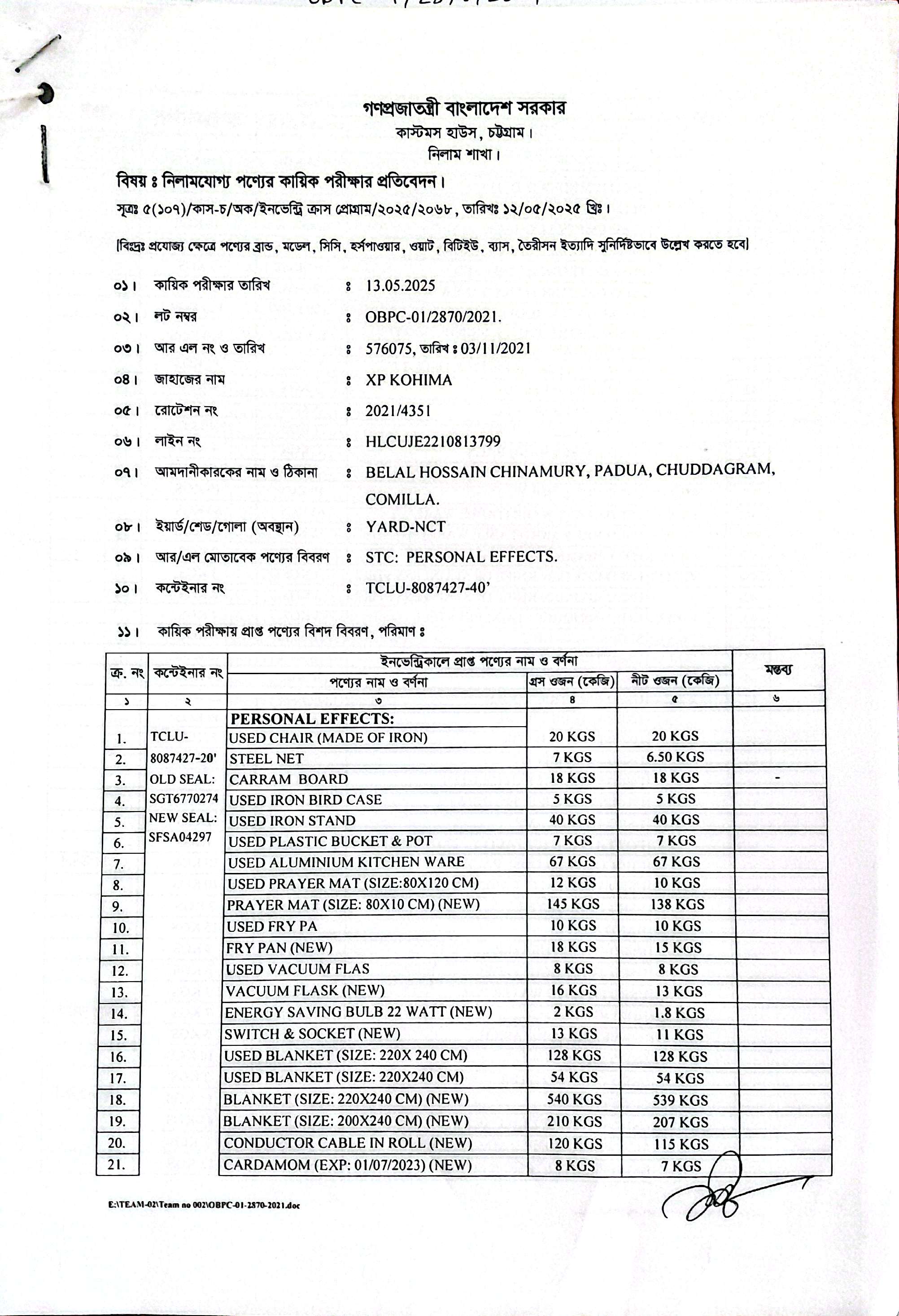 Terms & condition : আমদানি নীতি আদেশ এবং বিদ্যমান অন্যান্য আইন ও বিধি-বিধানের প্রযোজ্য সকল শর্ত পরিপালন এবং প্রযোজ্য ক্ষেত্রে রাসায়নিক পরীক্ষায় পণ্যের সঠিকতা ও ব্যবহার উপযোগিতা থাকা সাপেক্ষে খালাসকালে পণ্যের বর্ণনা এবং ওজন নিশ্চিত করে পণ্য ছাড়যোগ্য হবে। কোন লটভুক্ত পণ্যচালানে মেয়াদ উত্তীর্ণ/ধ্বসংযোগ্য পণ্য অন্তর্ভুক্ত থাকলে, উক্ত পণ্যচালানের ক্ষেত্রে মেয়াদ উত্তীর্ণ/ধ্বসংযোগ্য পণ্য ব্যতীত (প্রযোজ্য ক্ষেত্রে) কেবল মেয়াদযুক্ত/নিলামযোগ্য পণ্যসমূহ বিদ্যমান ও প্রযোজ্য আইন ও বিধি-বিধানের প্রযোজ্য সকল শর্ত পরিপালন সাপেক্ষে পণ্য ছাড়যোগ্য হবে। সার্ভার জটিলতা এড়ানোর জন্য আগ্রহী নিলাম ক্রেতাগণকে সরেজমিন পণ্য দেখে নিলামের নির্ধারিত শেষ তারিখ ও সময়ের (২৪/১২/২০২৫ খ্রি. তারিখ দুপুর ০২.০০ টা) পূর্বেই বিশেষ ই-নিলামে অংশগ্রহণ করার জন্য অনুরোধ করা যাচ্ছে। কোনরূপ কারণ দর্শানো ব্যতিরেকে কর্তৃপক্ষ যে কোন সময় ও পর্যায়ে যে কোন লট বা সকল লটের নিলাম আংশিক বা সম্পূর্ণ স্থগিত বা বাতিলের অধিকার সংরক্ষণ করেন।