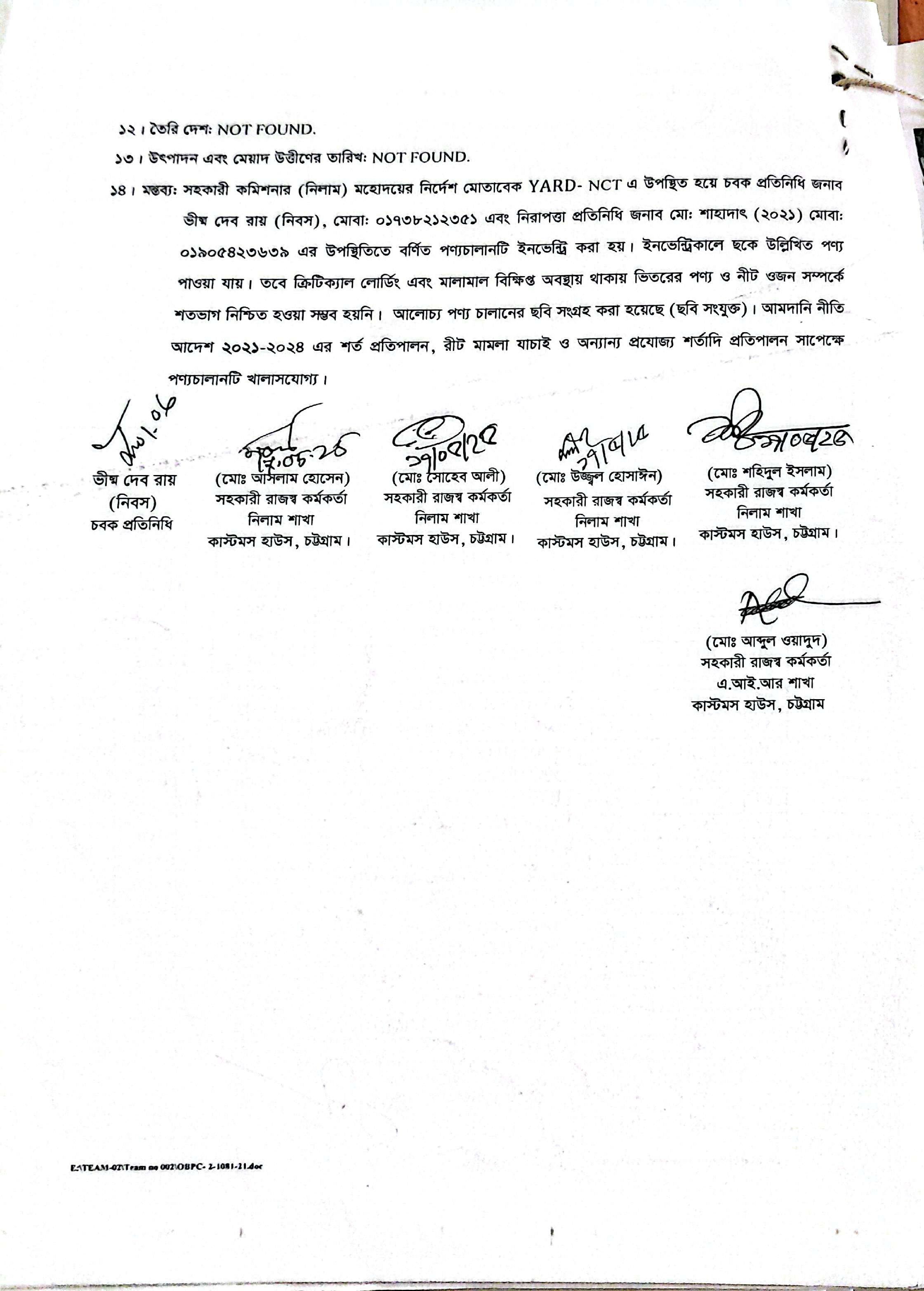 Terms & condition : আমদানি নীতি আদেশ এবং বিদ্যমান অন্যান্য আইন ও বিধি-বিধানের প্রযোজ্য সকল শর্ত পরিপালন এবং প্রযোজ্য ক্ষেত্রে রাসায়নিক পরীক্ষায় পণ্যের সঠিকতা ও ব্যবহার উপযোগিতা থাকা সাপেক্ষে খালাসকালে পণ্যের বর্ণনা এবং ওজন নিশ্চিত করে পণ্য ছাড়যোগ্য হবে। কোন লটভুক্ত পণ্যচালানে মেয়াদ উত্তীর্ণ/ধ্বসংযোগ্য পণ্য অন্তর্ভুক্ত থাকলে, উক্ত পণ্যচালানের ক্ষেত্রে মেয়াদ উত্তীর্ণ/ধ্বসংযোগ্য পণ্য ব্যতীত (প্রযোজ্য ক্ষেত্রে) কেবল মেয়াদযুক্ত/নিলামযোগ্য পণ্যসমূহ বিদ্যমান ও প্রযোজ্য আইন ও বিধি-বিধানের প্রযোজ্য সকল শর্ত পরিপালন সাপেক্ষে পণ্য ছাড়যোগ্য হবে। সার্ভার জটিলতা এড়ানোর জন্য আগ্রহী নিলাম ক্রেতাগণকে সরেজমিন পণ্য দেখে নিলামের নির্ধারিত শেষ তারিখ ও সময়ের (২৪/১২/২০২৫ খ্রি. তারিখ দুপুর ০২.০০ টা) পূর্বেই বিশেষ ই-নিলামে অংশগ্রহণ করার জন্য অনুরোধ করা যাচ্ছে। কোনরূপ কারণ দর্শানো ব্যতিরেকে কর্তৃপক্ষ যে কোন সময় ও পর্যায়ে যে কোন লট বা সকল লটের নিলাম আংশিক বা সম্পূর্ণ স্থগিত বা বাতিলের অধিকার সংরক্ষণ করেন।
