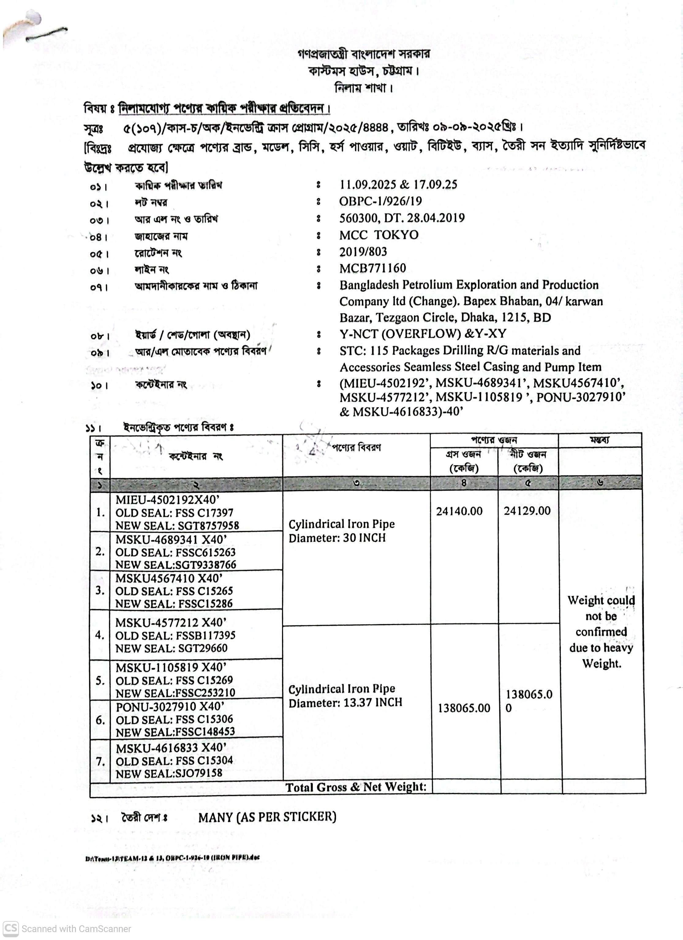 লটের শিরোনাম :(1) Cylindrical Iron Pipe Diameter: 30 Inch 24,129 Kgs; (2) Cylindrical Iron Pipe Diameter: 13.37 Inch 1,38,065 Kgs(Previous Bid: 0 TK)