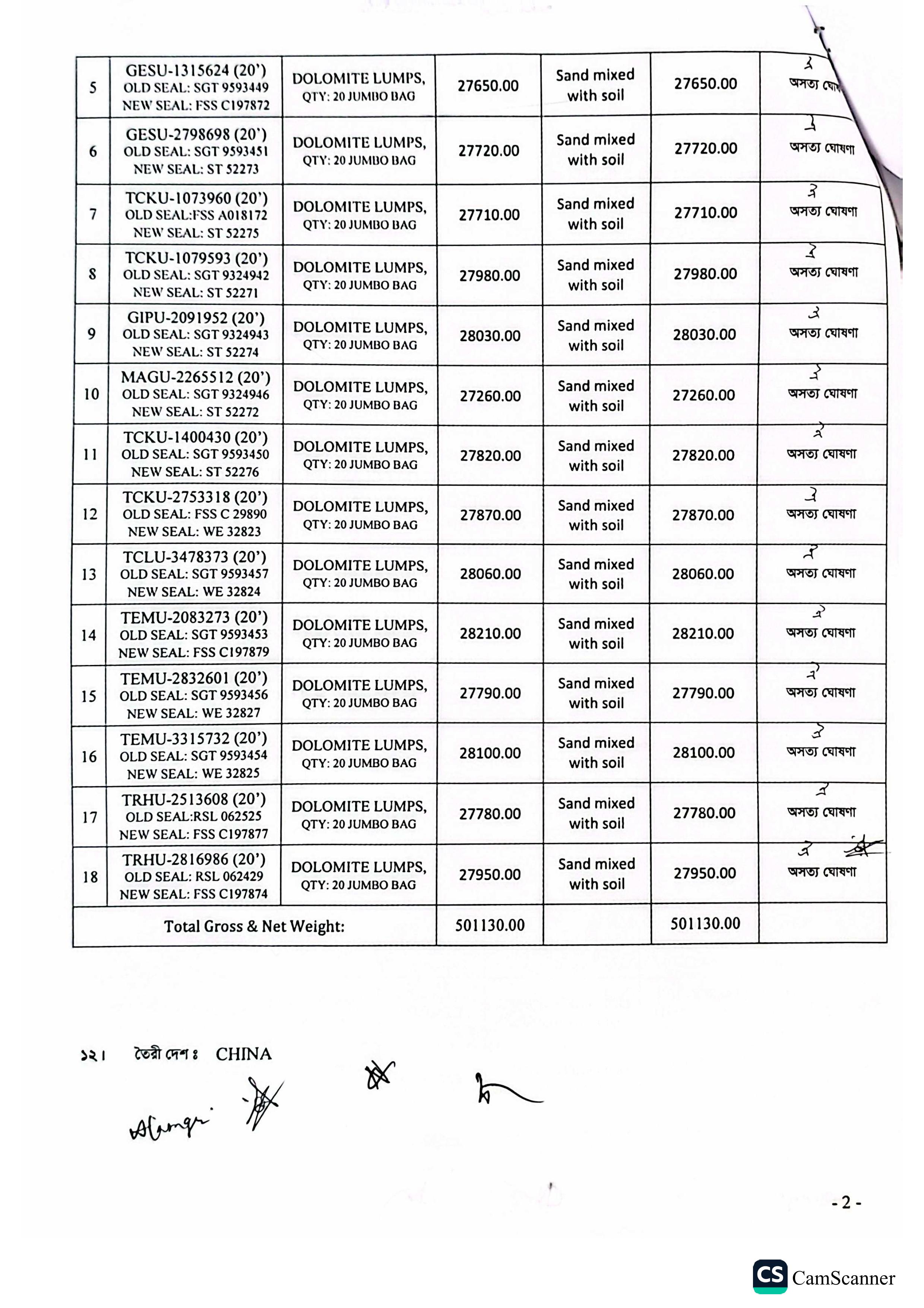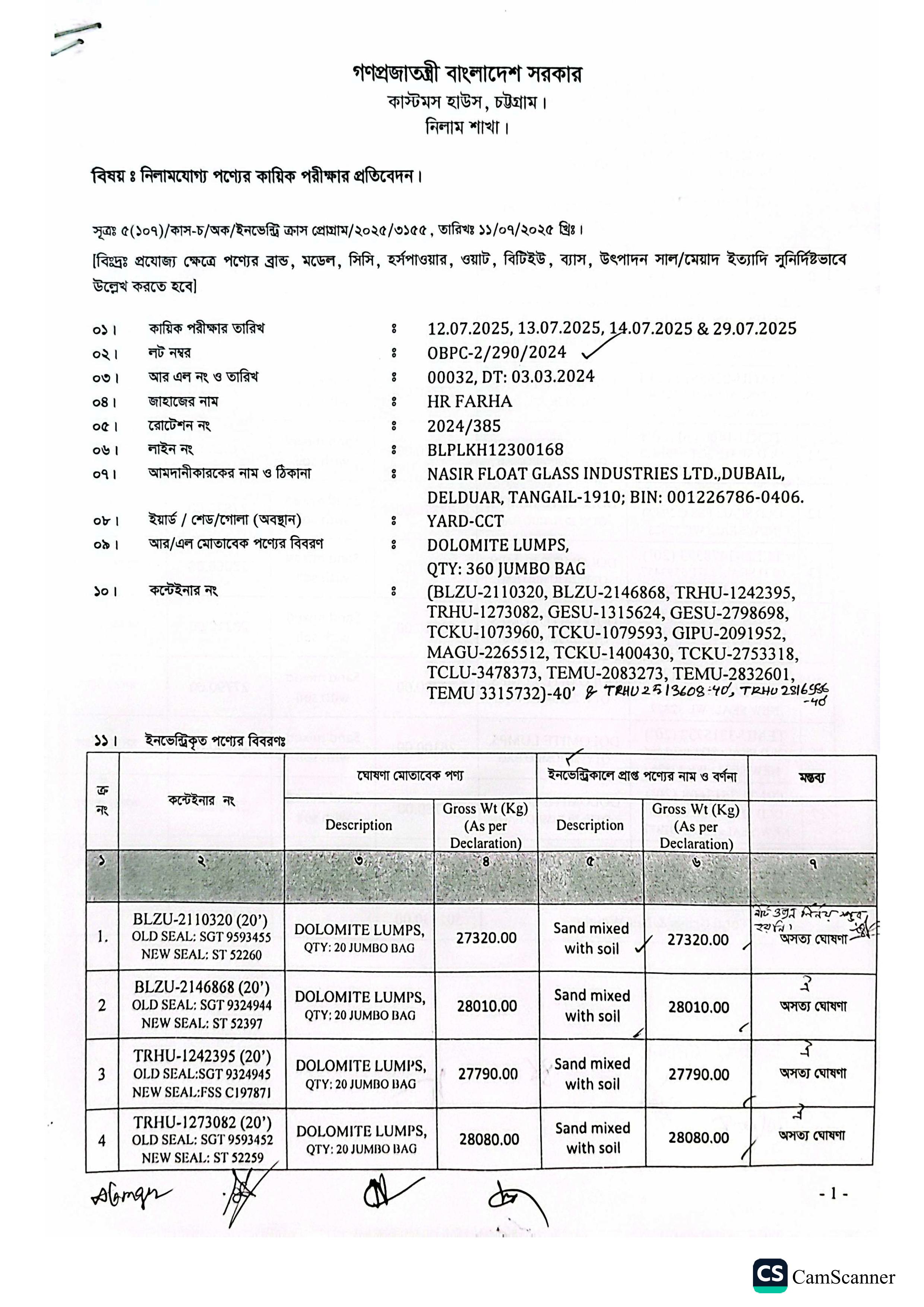 | কন্টেনার/জি আর নং |