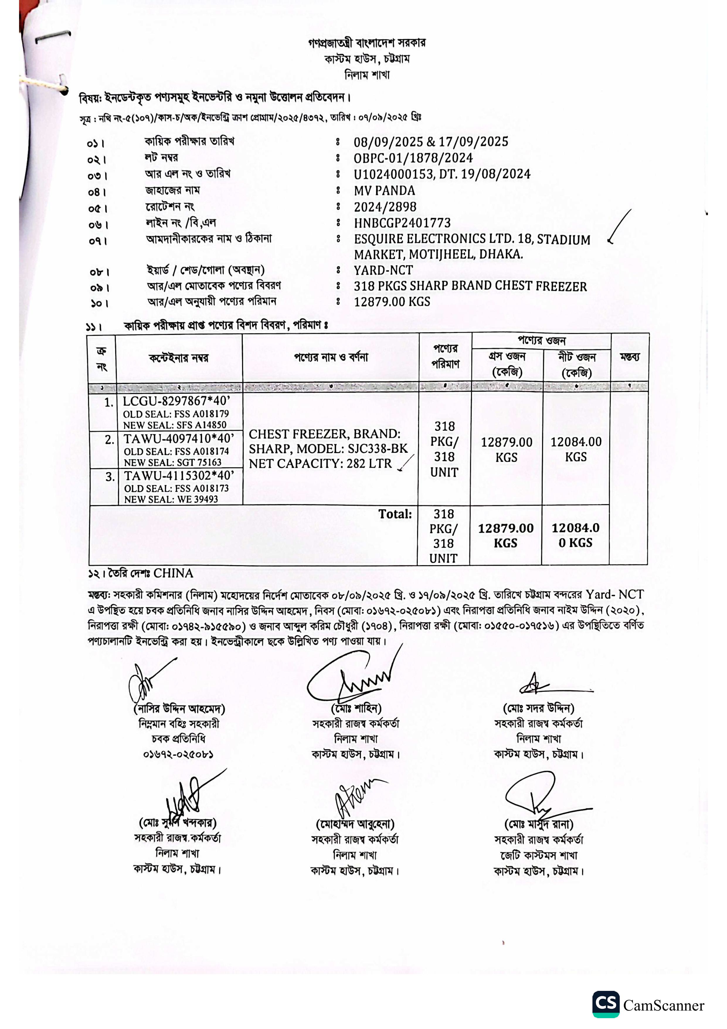 Terms & condition : আমদানি নীতি আদেশ এবং বিদ্যমান অন্যান্য আইন ও বিধি-বিধানের প্রযোজ্য সকল শর্ত পরিপালন এবং প্রযোজ্য ক্ষেত্রে রাসায়নিক পরীক্ষায় পণ্যের সঠিকতা ও ব্যবহার উপযোগিতা থাকা সাপেক্ষে খালাসকালে পণ্যের বর্ণনা এবং ওজন নিশ্চিত করে পণ্য ছাড়যোগ্য হবে। কোন লটভুক্ত পণ্যচালানে মেয়াদ উত্তীর্ণ/ধ্বসংযোগ্য পণ্য অন্তর্ভুক্ত থাকলে, উক্ত পণ্যচালানের ক্ষেত্রে মেয়াদ উত্তীর্ণ/ধ্বসংযোগ্য পণ্য ব্যতীত (প্রযোজ্য ক্ষেত্রে) কেবল মেয়াদযুক্ত/নিলামযোগ্য পণ্যসমূহ বিদ্যমান ও প্রযোজ্য আইন ও বিধি-বিধানের প্রযোজ্য সকল শর্ত পরিপালন সাপেক্ষে পণ্য ছাড়যোগ্য হবে। সার্ভার জটিলতা এড়ানোর জন্য আগ্রহী নিলাম ক্রেতাগণকে সরেজমিন পণ্য দেখে নিলামের নির্ধারিত শেষ তারিখ ও সময়ের পূর্বেই ই-নিলামে অংশগ্রহণ করার জন্য অনুরোধ করা যাচ্ছে। কোনরূপ কারণ দর্শানো ব্যতিরেকে কর্তৃপক্ষ যে কোন সময় ও পর্যায়ে যে কোন লট বা সকল লটের নিলাম আংশিক বা সম্পূর্ণ স্থগিত বা বাতিলের অধিকার সংরক্ষণ করেন।