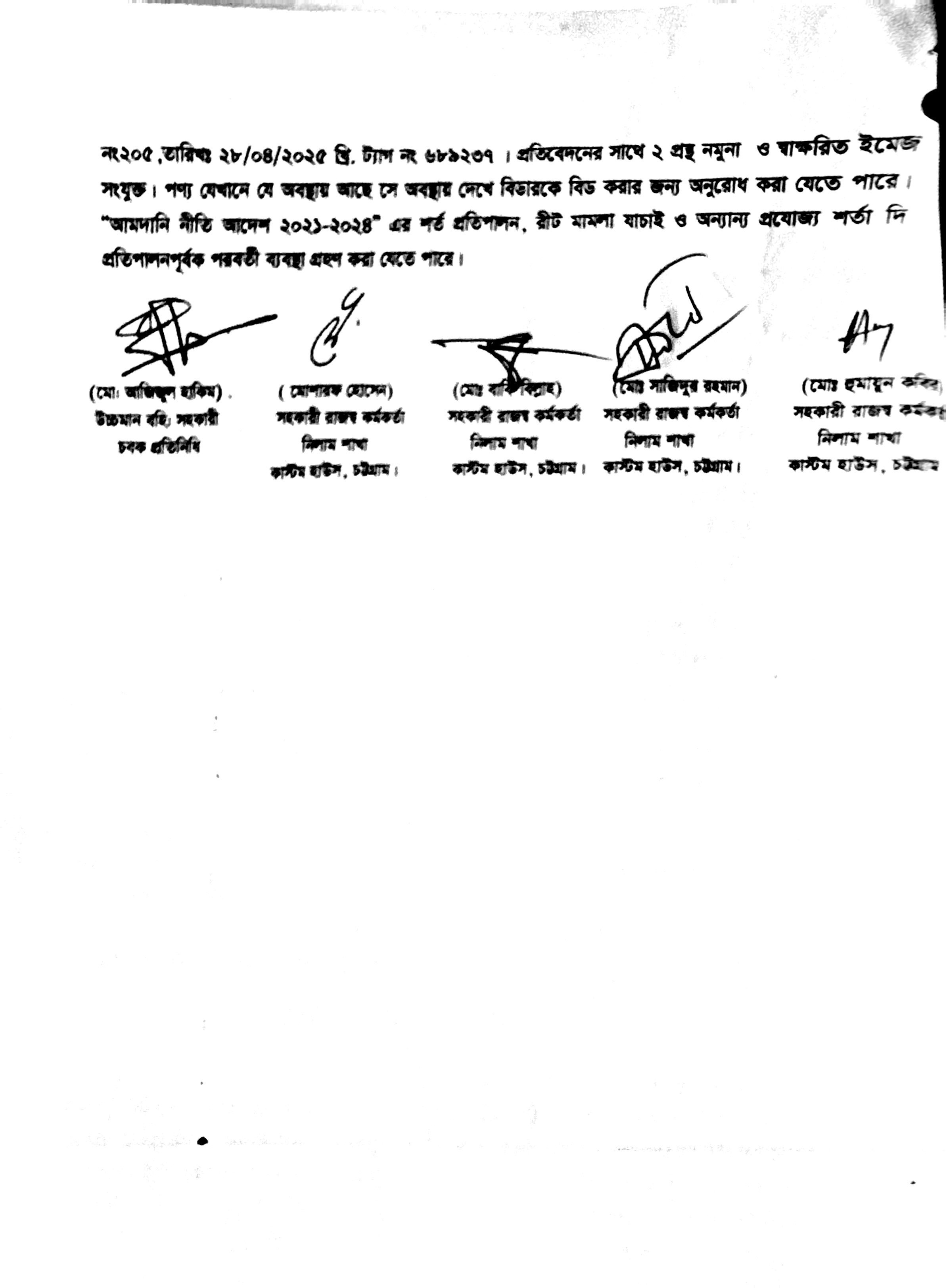 Terms & condition : আমদানি নীতি আদেশ এবং বিদ্যমান অন্যান্য আইন ও বিধি-বিধানের প্রযোজ্য সকল শর্ত পরিপালন এবং প্রযোজ্য ক্ষেত্রে রাসায়নিক পরীক্ষায় পণ্যের সঠিকতা ও ব্যবহার উপযোগিতা থাকা সাপেক্ষে খালাসকালে পণ্যের বর্ণনা এবং ওজন নিশ্চিত করে পণ্য ছাড়যোগ্য হবে। কোন লটভুক্ত পণ্যচালানে মেয়াদ উত্তীর্ণ/ধ্বসংযোগ্য পণ্য অন্তর্ভুক্ত থাকলে, উক্ত পণ্যচালানের ক্ষেত্রে মেয়াদ উত্তীর্ণ/ধ্বসংযোগ্য পণ্য ব্যতীত (প্রযোজ্য ক্ষেত্রে) কেবল মেয়াদযুক্ত/নিলামযোগ্য পণ্যসমূহ বিদ্যমান ও প্রযোজ্য আইন ও বিধি-বিধানের প্রযোজ্য সকল শর্ত পরিপালন সাপেক্ষে পণ্য ছাড়যোগ্য হবে। সার্ভার জটিলতা এড়ানোর জন্য আগ্রহী নিলাম ক্রেতাগণকে সরেজমিন পণ্য দেখে নিলামের নির্ধারিত শেষ তারিখ ও সময়ের পূর্বেই ই-নিলামে অংশগ্রহণ করার জন্য অনুরোধ করা যাচ্ছে। কোনরূপ কারণ দর্শানো ব্যতিরেকে কর্তৃপক্ষ যে কোন সময় ও পর্যায়ে যে কোন লট বা সকল লটের নিলাম আংশিক বা সম্পূর্ণ স্থগিত বা বাতিলের অধিকার সংরক্ষণ করেন।