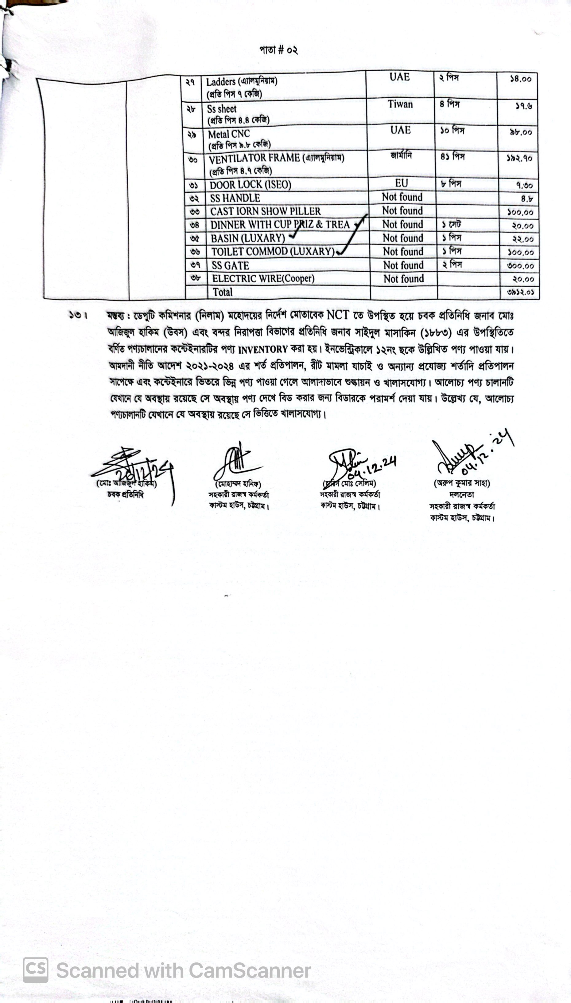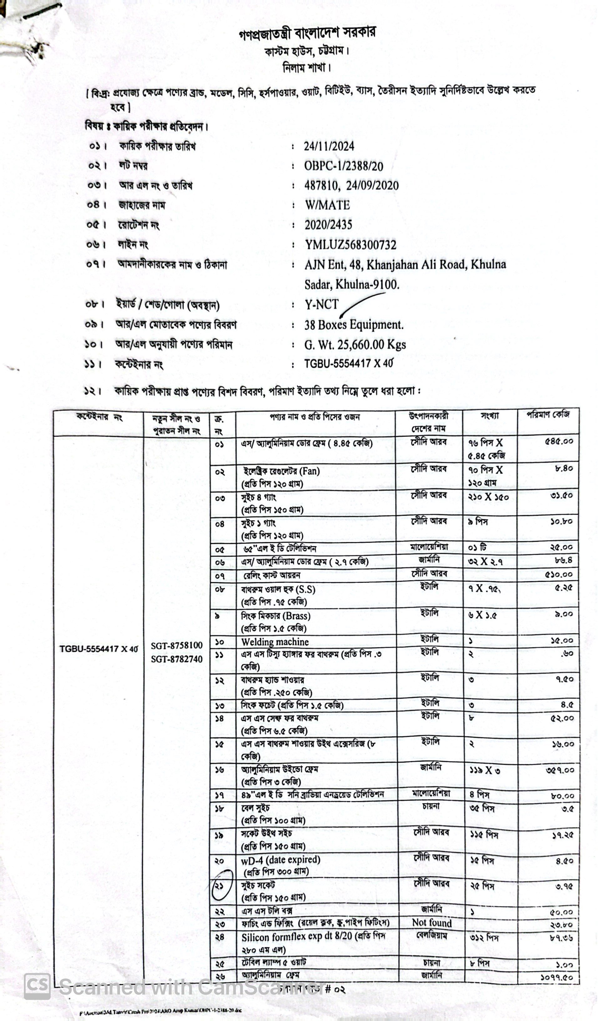 (১) এস/অ্যালুমিনিয়াম ডোর ফ্রেম= ৫৪৫ কেজি; (২) ইলেক্ট্রিক রেগুলেটর (Fan) (প্রতি পিস ১২০গ্রাম)= ৮.৪০ কেজি; (৩) সুইচ ৪ গ্যাং (প্রতি পিস ১৫০ গ্রাম)= ৩১.৫০ কেজি; (৪) সুইচ ১ গ্যাং (প্রতি পিস ১২০ গ্রাম)= ১০.৮০ কেজি; (৫) ৬৫” এল ই ডি টেলিভিশন ০১টি= ২৫ কেজি; (৬) এস/অ্যালুমিনিয়াম ডোর ফ্রেম (২.৭ কেজি)= ৮৬.৪ কেজি; (৭) রেলিং কাস্ট আয়রন=৫১০ কেজি; (৮) বাথরুম ওয়াল হুক (এস এস) (প্রতি পিস ০.৭৫ কেজি)= ৫.২৫ কেজি; (৯) সিংক মিকচার (Brass) (প্রতি পিস ১.৫ কেজি)= ৯ কেজি; (১০) Welding Machine= ১৫ কেজি; (১১) এস এস টিস্যু হ্যাঙ্গার ফর বাথরুম (প্রতি পিস ০.৩০ কেজি)= ০.৬০ কেজি; (১২) বাথরুম হ্যান্ড শাওয়ার (প্রতি পিস ০.২৫০ কেজি)= ৭.৫০ কেজি; (১৩) সিংক ফচেট (প্রতি পিস ১.৫০ কেজি)= ৪.৫০ কেজি; (১৪) এস এস সেল্ফ ফর বাথরুম (প্রতি পিস ৬.৫০ কেজি)= ৫২ কেজি; (১৫) এস এস বাথরুম শাওয়ার উইথ এক্সেসরিজ (৮ কেজি)= ১৬ কেজি; (১৬) অ্যালুমিনিয়াম উইন্ডো ফেম (প্রতি পিস ৩ কেজি)= ৩৫৭ কেজি; (১৭) ৪৯” এল ই ডি সনি ব্রাভিয়া এন্ড্রয়েড টেলিভিশন, ৪ পিস= ৮০ কেজি; (১৮) বেল সুইচ (প্রতি পিস ১০০ গ্রাম) ৩৫ পিস=৩.৫ কেজি; (১৯) সকেট উইথ সইচ (প্রতি পিস ১৫০ গ্রাম) ১১৫ পিস=১৭.২৫ কেজি; (২০) WD-40 (Date Expired) (প্রতি পিস ৩০০ গ্রাম) ১৫ পিস= ৪.৫০ কেজি; (২১) সুইচ সকেট (প্রতি পিস ১৫০ গ্রাম) ২৫ পিস ৩.৭৫ কেজি; (২২) এস এস টলি বক্স ১পিস= ৫০ কেজি; (২৩) ফাচিং এন্ড ফিক্সিং (রয়েল ব্লক, স্ক্রু, পাইপ ফিটিংস)= ২৩.৮০ কেজি; (২৪) Silicon Formflex Exp Dt 08/2020 (প্রতি পিস ২৮০ এম এল) ৩১২ পিস= ৮৭.৩৬ কেজি; (২৫) টেবিল ল্যাম্প ৫ ওয়াট ৮ পিস= ১ কেজি; (২৬) অ্যালুমিনিয়াম ফ্রেম= ১,০৭৭.৫০ কেজি; (২৭) Ladders (অ্যালুমিনিয়াম) (প্রতি পিস ৭ কেজি) ২পিস=১৪ কেজি; (২৮) SS Sheet (প্রতি পিস ৪.৪ কেজি) ৪ পিস= ১৭.৬ কেজি; (২৯) Metal CNC (প্রতি পিস ৯.৮০ কেজি) ১০পিস= ৯৮ কেজি; (৩০) Ventilator Frame (অ্যালুমিনিয়াম) (প্রতি পিস ৪.৭ কেজি) ৪১পিস= ১৯২.৭০ কেজি; (৩১) Door Lock (ISEO) ৮পিস= ৭.৩০ কেজি; (৩২) SS Handle= ৪.৮ কেজি; (৩৩) Cast Iron SShow Piller= ১০০ কেজি; (৩৪) Dinner with Cup Priz & Trea ১ সেট=২০ কেজি; (৩৫) Basin (Luxury) ১পিস=২২ কেজি; (৩৬) Toilet Commode (Luxury) ১পিস= ১০০ কেজি; (৩৭) SS Gate ২পিস=৩০০ কেজি; (৩৮) Electric Wire (Copper)= ২০ কেজি |