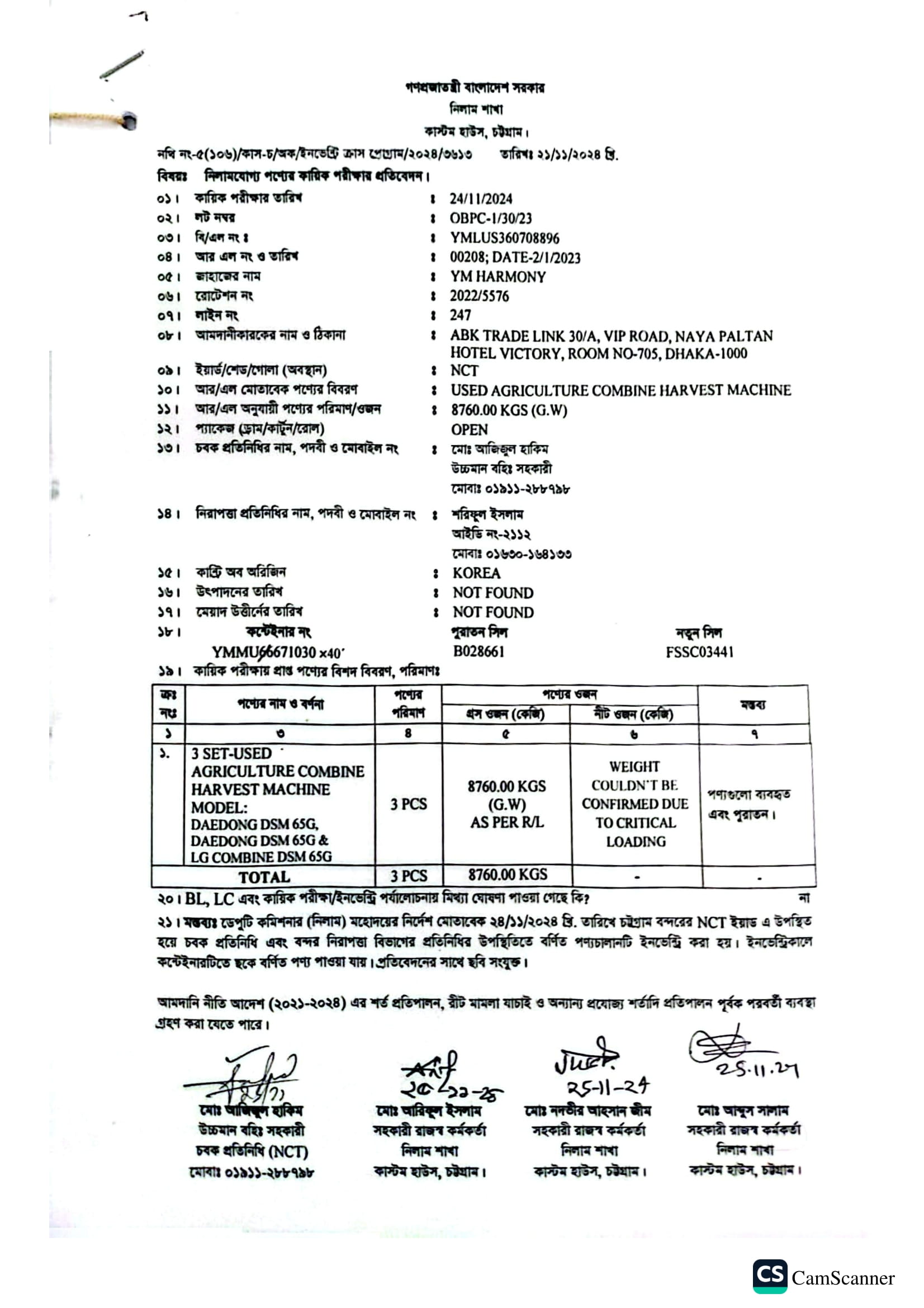Terms & condition : আমদানি নীতি আদেশ এবং বিদ্যমান অন্যান্য আইন ও বিধি-বিধানের প্রযোজ্য সকল শর্ত পরিপালন এবং প্রযোজ্য ক্ষেত্রে রাসায়নিক পরীক্ষায় পণ্যের সঠিকতা ও ব্যবহার উপযোগিতা থাকা সাপেক্ষে খালাসকালে পণ্যের বর্ণনা এবং ওজন নিশ্চিত করে পণ্য ছাড়যোগ্য হবে। কোন লটভুক্ত পণ্যচালানে মেয়াদ উত্তীর্ণ/ধ্বসংযোগ্য পণ্য অন্তর্ভুক্ত থাকলে, উক্ত পণ্যচালানের ক্ষেত্রে মেয়াদ উত্তীর্ণ/ধ্বসংযোগ্য পণ্য ব্যতীত (প্রযোজ্য ক্ষেত্রে) কেবল মেয়াদযুক্ত/নিলামযোগ্য পণ্যসমূহ বিদ্যমান ও প্রযোজ্য আইন ও বিধি-বিধানের প্রযোজ্য সকল শর্ত পরিপালন সাপেক্ষে পণ্য ছাড়যোগ্য হবে। সার্ভার জটিলতা এড়ানোর জন্য আগ্রহী নিলাম ক্রেতাগণকে সরেজমিন পণ্য দেখে নিলামের নির্ধারিত শেষ তারিখ ও সময়ের (২৪/১২/২০২৫ খ্রি. তারিখ দুপুর ০২.০০ টা) পূর্বেই বিশেষ ই-নিলামে অংশগ্রহণ করার জন্য অনুরোধ করা যাচ্ছে। কোনরূপ কারণ দর্শানো ব্যতিরেকে কর্তৃপক্ষ যে কোন সময় ও পর্যায়ে যে কোন লট বা সকল লটের নিলাম আংশিক বা সম্পূর্ণ স্থগিত বা বাতিলের অধিকার সংরক্ষণ করেন।