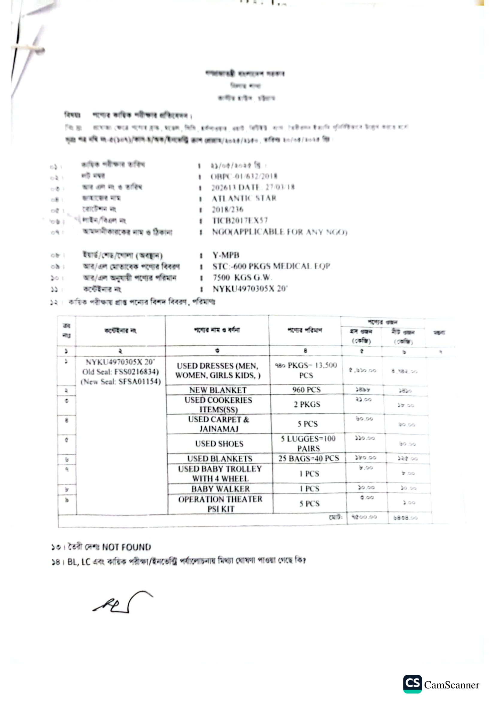 (1) Used Dresses (Men, Women, Girls Kids) 740 Pkgs, 13,500 Pcs= 4742.00 Kgs; (2) New Blanket, 960 Pcs= 1,410.00 Kgs; (3) Used Cookeries Items (SS), 02 Pkgs=18.00 Kgs; (4) Used Carpet & Jainamaj, 5 Pcs= 60.00 Kgs; (5) Used Shoes, 5 Lugges 100 Pairs=60.00 Kgs; (6) Used Blankets, 25 Bags, 40 Pcs= 125.00 Kgs; (7) Used Baby Trolley with 4 Wheel, 1 Pcs=8.00 Kgs; (8) Baby Walker, 1 Pcs= 10.00 Kgs; (9) Operation Theater PSI Kit, 5 Pcs= 1.00 Kgs; |