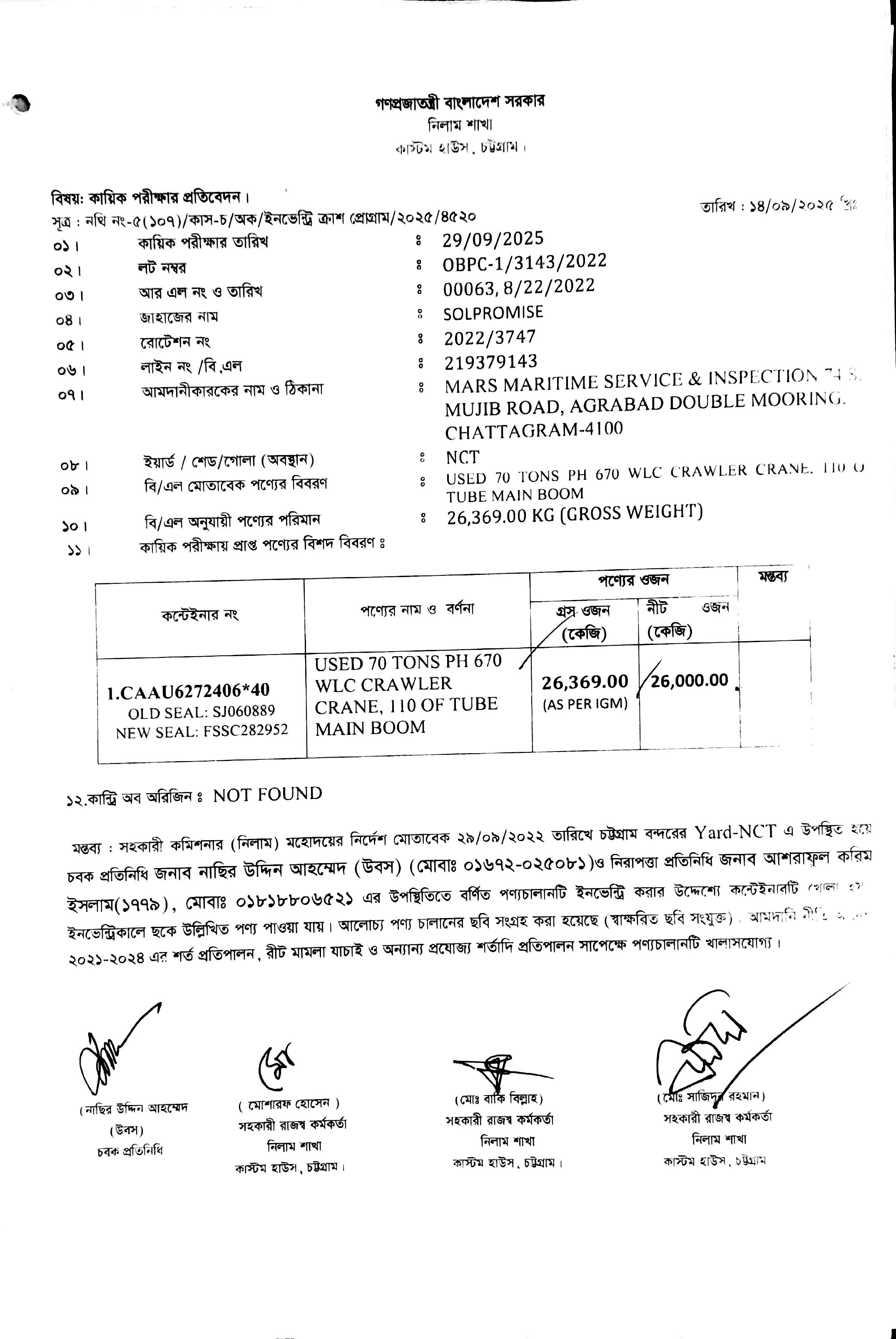 Terms & condition : আমদানি নীতি আদেশ এবং বিদ্যমান অন্যান্য আইন ও বিধি-বিধানের প্রযোজ্য সকল শর্ত পরিপালন এবং প্রযোজ্য ক্ষেত্রে রাসায়নিক পরীক্ষায় পণ্যের সঠিকতা ও ব্যবহার উপযোগিতা থাকা সাপেক্ষে খালাসকালে পণ্যের বর্ণনা এবং ওজন নিশ্চিত করে পণ্য ছাড়যোগ্য হবে। কোন লটভুক্ত পণ্যচালানে মেয়াদ উত্তীর্ণ/ধ্বসংযোগ্য পণ্য অন্তর্ভুক্ত থাকলে, উক্ত পণ্যচালানের ক্ষেত্রে মেয়াদ উত্তীর্ণ/ধ্বসংযোগ্য পণ্য ব্যতীত (প্রযোজ্য ক্ষেত্রে) কেবল মেয়াদযুক্ত/নিলামযোগ্য পণ্যসমূহ বিদ্যমান ও প্রযোজ্য আইন ও বিধি-বিধানের প্রযোজ্য সকল শর্ত পরিপালন সাপেক্ষে পণ্য ছাড়যোগ্য হবে। সার্ভার জটিলতা এড়ানোর জন্য আগ্রহী নিলাম ক্রেতাগণকে সরেজমিন পণ্য দেখে নিলামের নির্ধারিত শেষ তারিখ ও সময়ের (২৪/১২/২০২৫ খ্রি. তারিখ দুপুর ০২.০০ টা) পূর্বেই বিশেষ ই-নিলামে অংশগ্রহণ করার জন্য অনুরোধ করা যাচ্ছে। কোনরূপ কারণ দর্শানো ব্যতিরেকে কর্তৃপক্ষ যে কোন সময় ও পর্যায়ে যে কোন লট বা সকল লটের নিলাম আংশিক বা সম্পূর্ণ স্থগিত বা বাতিলের অধিকার সংরক্ষণ করেন।