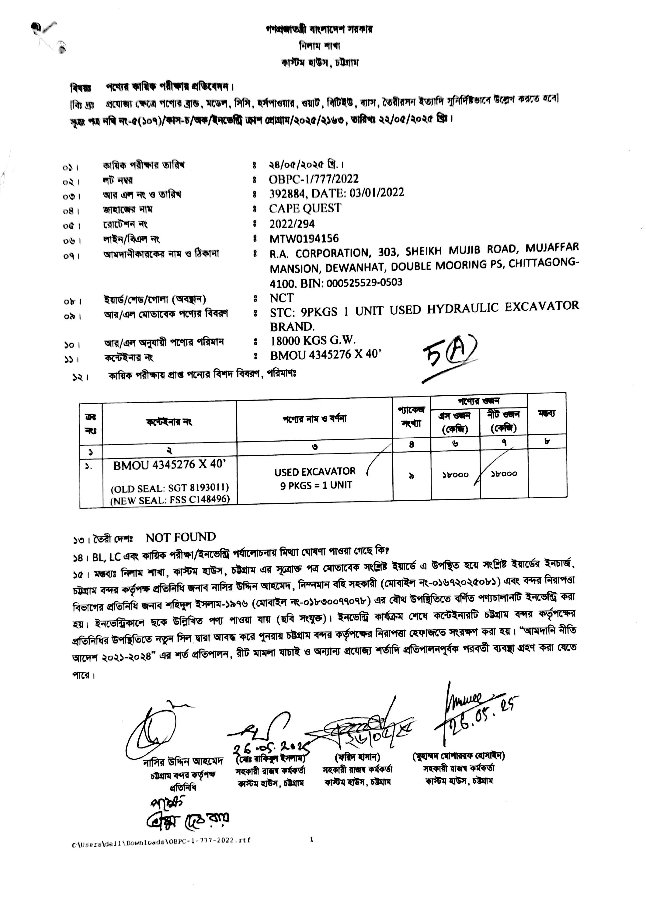 লটের শিরোনাম :Hydraulic Excavator (Cater Pillar)-1 Unit(Previous Bid: 0 TK)