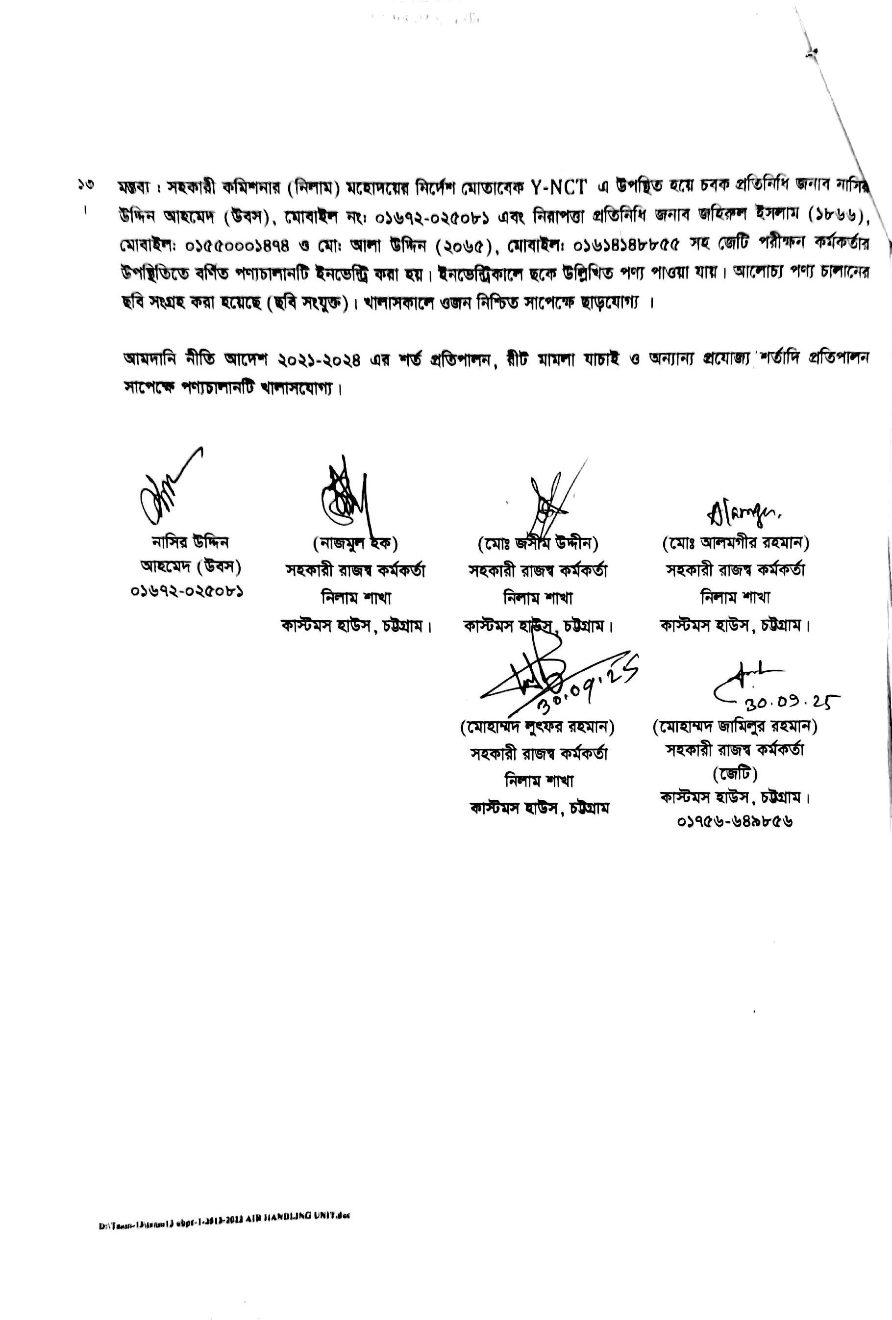 Terms & condition : আমদানি নীতি আদেশ এবং বিদ্যমান অন্যান্য আইন ও বিধি-বিধানের প্রযোজ্য সকল শর্ত পরিপালন এবং প্রযোজ্য ক্ষেত্রে রাসায়নিক পরীক্ষায় পণ্যের সঠিকতা ও ব্যবহার উপযোগিতা থাকা সাপেক্ষে খালাসকালে পণ্যের বর্ণনা এবং ওজন নিশ্চিত করে পণ্য ছাড়যোগ্য হবে। কোন লটভুক্ত পণ্যচালানে মেয়াদ উত্তীর্ণ/ধ্বসংযোগ্য পণ্য অন্তর্ভুক্ত থাকলে, উক্ত পণ্যচালানের ক্ষেত্রে মেয়াদ উত্তীর্ণ/ধ্বসংযোগ্য পণ্য ব্যতীত (প্রযোজ্য ক্ষেত্রে) কেবল মেয়াদযুক্ত/নিলামযোগ্য পণ্যসমূহ বিদ্যমান ও প্রযোজ্য আইন ও বিধি-বিধানের প্রযোজ্য সকল শর্ত পরিপালন সাপেক্ষে পণ্য ছাড়যোগ্য হবে। সার্ভার জটিলতা এড়ানোর জন্য আগ্রহী নিলাম ক্রেতাগণকে সরেজমিন পণ্য দেখে নিলামের নির্ধারিত শেষ তারিখ ও সময়ের (২৪/১২/২০২৫ খ্রি. তারিখ দুপুর ০২.০০ টা) পূর্বেই বিশেষ ই-নিলামে অংশগ্রহণ করার জন্য অনুরোধ করা যাচ্ছে। কোনরূপ কারণ দর্শানো ব্যতিরেকে কর্তৃপক্ষ যে কোন সময় ও পর্যায়ে যে কোন লট বা সকল লটের নিলাম আংশিক বা সম্পূর্ণ স্থগিত বা বাতিলের অধিকার সংরক্ষণ করেন।