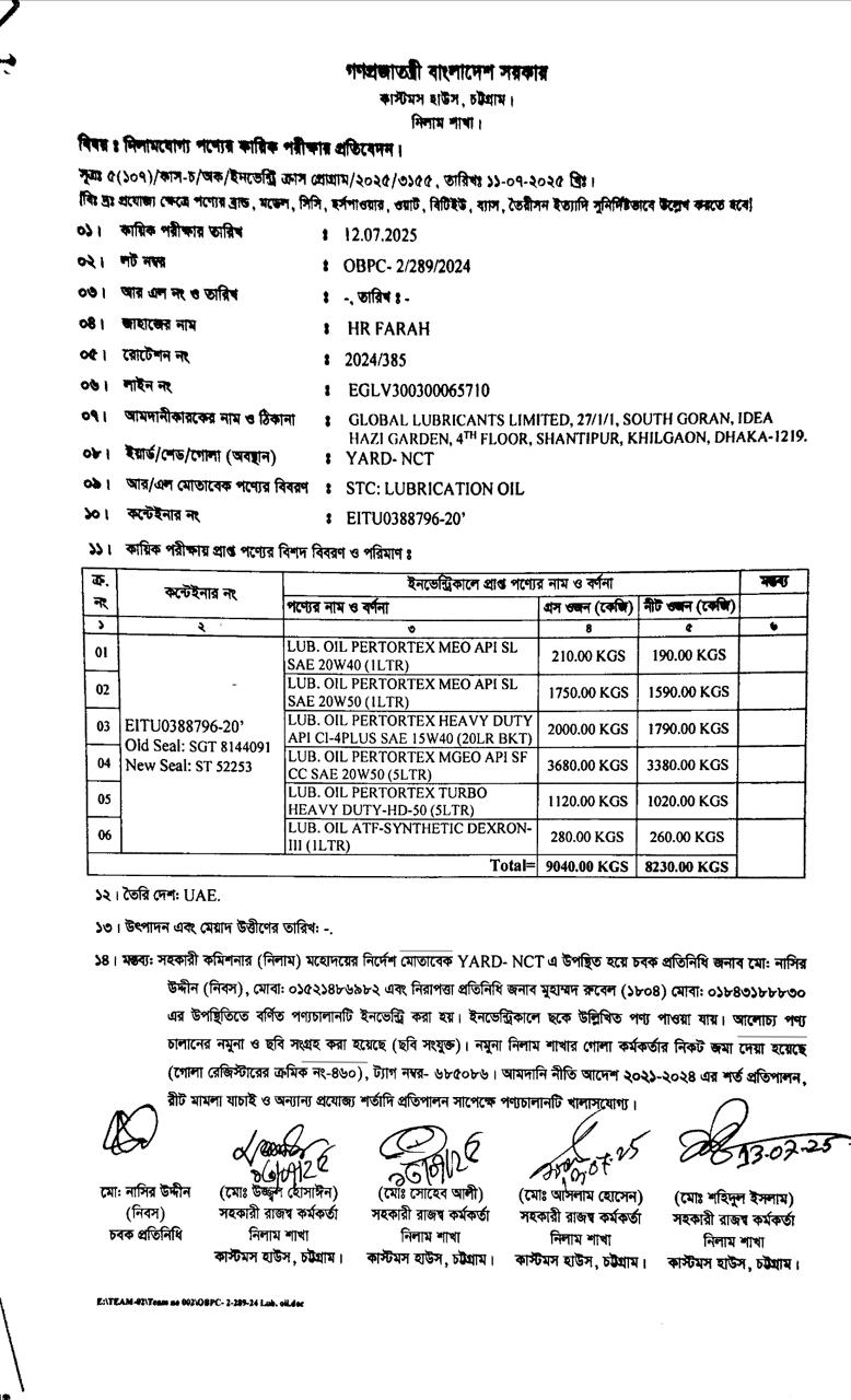 লটের শিরোনাম :Lub Oil (Lubricating Oil)(Previous Bid: 0 TK)