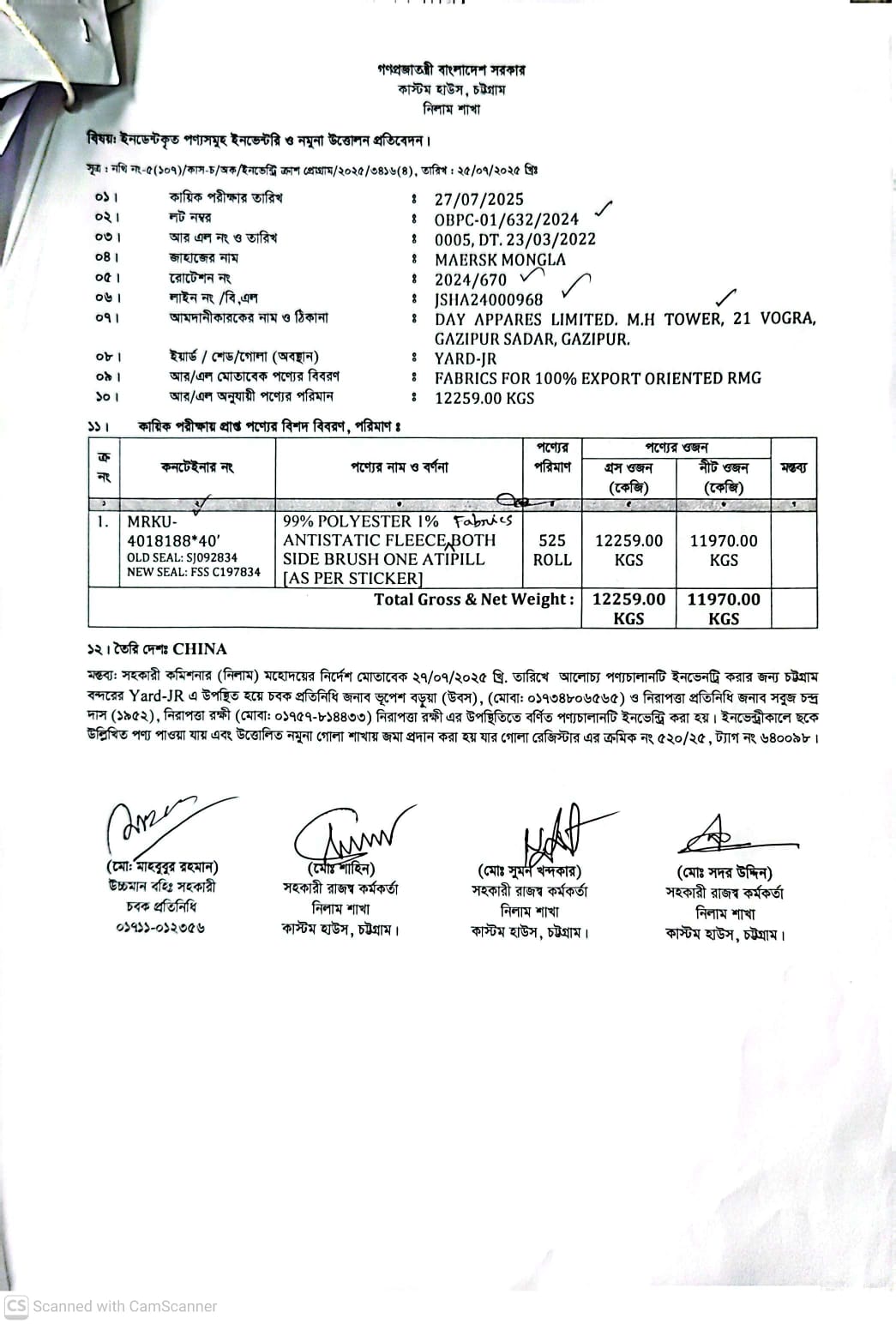 | কন্টেনার/জি আর নং |