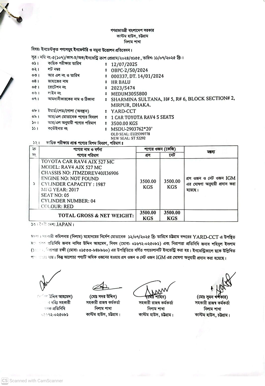 লটের শিরোনাম :TOYOTA CAR RAV4 AJX 527 MC, MODEL : RAV4 AJX 527 MC, CHASSIS NO : JTMZDREV40JI36906 ENGINE NO : NOT FOUND CYLINDER CAPACITY : 1987 MFG YEAR : 2017 SEAT NO : 05, CYLINDER NUMBER : 04, COLOUR : RED,(Previous Bid: 0 TK)