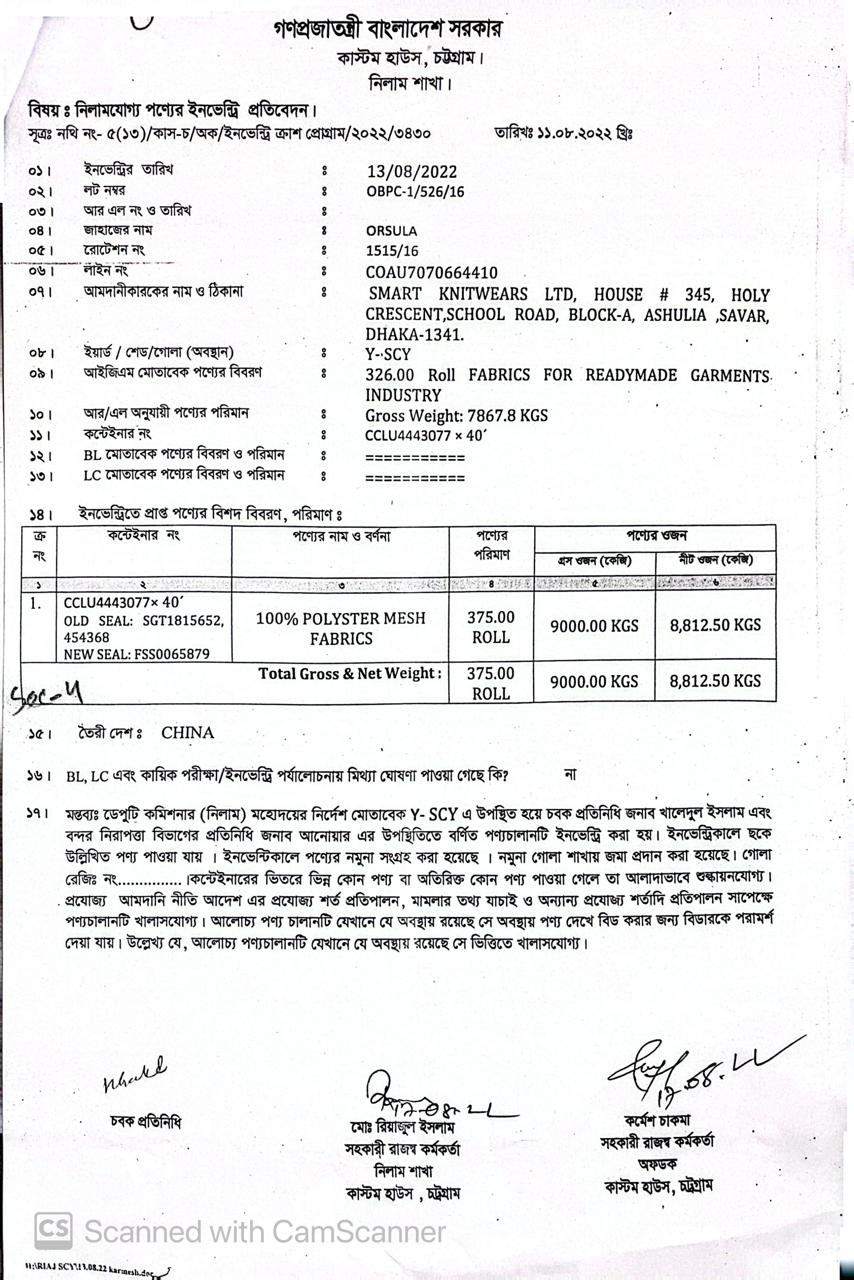 Terms & condition : আমদানি নীতি আদেশ এবং বিদ্যমান অন্যান্য আইন ও বিধি-বিধানের প্রযোজ্য সকল শর্ত পরিপালন এবং প্রযোজ্য ক্ষেত্রে রাসায়নিক পরীক্ষায় পণ্যের সঠিকতা ও ব্যবহার উপযোগিতা থাকা সাপেক্ষে খালাসকালে পণ্যের বর্ণনা এবং ওজন নিশ্চিত করে পণ্য ছাড়যোগ্য হবে। কোন লটভুক্ত পণ্যচালানে মেয়াদ উত্তীর্ণ/ধ্বসংযোগ্য পণ্য অন্তর্ভুক্ত থাকলে, উক্ত পণ্যচালানের ক্ষেত্রে মেয়াদ উত্তীর্ণ/ধ্বসংযোগ্য পণ্য ব্যতীত (প্রযোজ্য ক্ষেত্রে) কেবল মেয়াদযুক্ত/নিলামযোগ্য পণ্যসমূহ বিদ্যমান ও প্রযোজ্য আইন ও বিধি-বিধানের প্রযোজ্য সকল শর্ত পরিপালন সাপেক্ষে পণ্য ছাড়যোগ্য হবে। সার্ভার জটিলতা এড়ানোর জন্য আগ্রহী নিলাম ক্রেতাগণকে সরেজমিন পণ্য দেখে নিলামের নির্ধারিত তারিখ ও সময় শেষ হওয়ার পূর্বেই ই-নিলামে অংশগ্রহণ করার জন্য অনুরোধ করা যাচ্ছে। কোনরূপ কারণ দর্শানো ব্যতিরেকে কর্তৃপক্ষ যে কোন সময় ও পর্যায়ে যে কোন লট বা সকল লটের নিলাম আংশিক বা সম্পূর্ণ স্থগিত বা বাতিলের অধিকার সংরক্ষণ করেন।