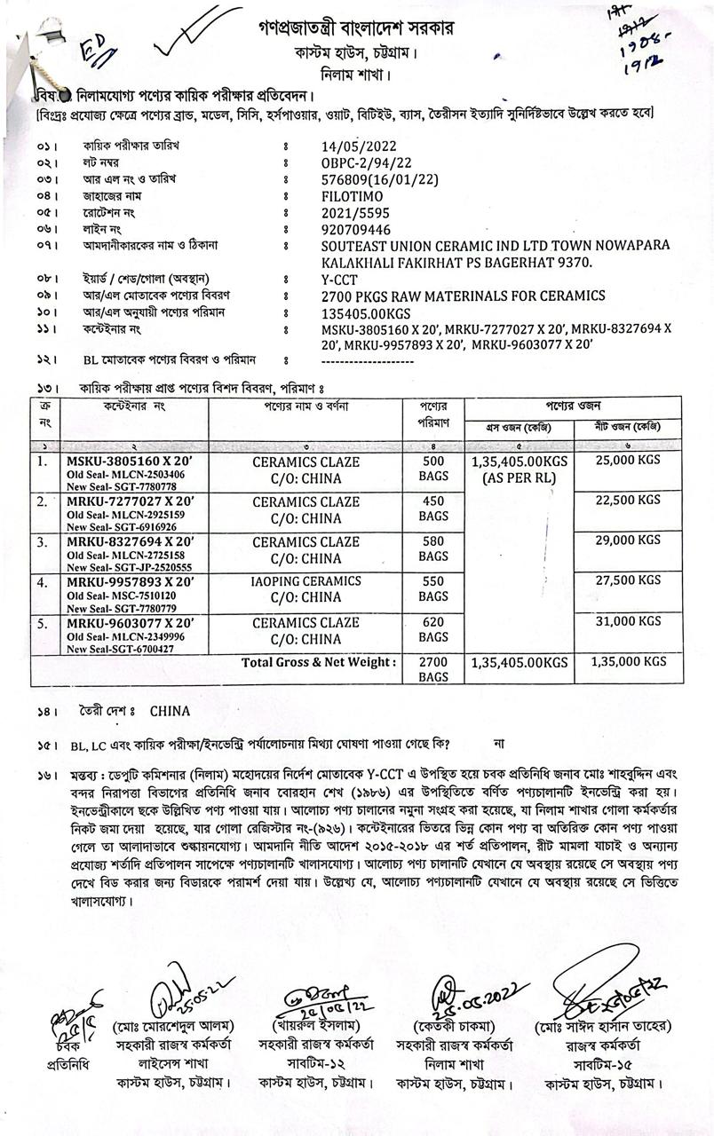 লটের শিরোনাম :1. Ceramic Glaze (1,07,500 Kgs) 2. Doping Ceramics (27500 Kgs(Previous Bid: 0 TK)