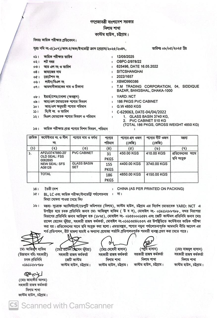 লটের শিরোনাম :1. PVC Cabinet 31 Pkgs 410 Kgs 2. Glass Basin Set 155 Pkgs 3740 Kgs(Previous Bid: 0 TK)