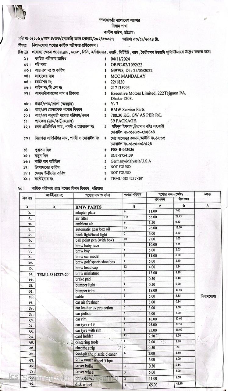 লটের শিরোনাম :Adapter Plate 7 Kgs Air filter 28.45 Kgs Ambient air 0.3 Kgs Automatic Gear Box Oil 12 Kgs Back Light/Head Light 3.1 Kgs Ball Point Pen (With Box) 1 Kg BMW baby race 7.25 Kgs BMW bag 2.05 Kgs BMW car (Previous Bid: 0 TK)