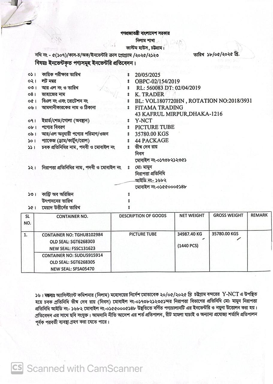 Terms & condition : আমদানি নীতি আদেশ এবং বিদ্যমান অন্যান্য আইন ও বিধি-বিধানের প্রযোজ্য সকল শর্ত পরিপালন এবং প্রযোজ্য ক্ষেত্রে রাসায়নিক পরীক্ষায় পণ্যের সঠিকতা ও ব্যবহার উপযোগিতা থাকা সাপেক্ষে খালাসকালে পণ্যের বর্ণনা এবং ওজন নিশ্চিত করে পণ্য ছাড়যোগ্য হবে। কোন লটভুক্ত পণ্যচালানে মেয়াদ উত্তীর্ণ/ধ্বসংযোগ্য পণ্য অন্তর্ভুক্ত থাকলে, উক্ত পণ্যচালানের ক্ষেত্রে মেয়াদ উত্তীর্ণ/ধ্বসংযোগ্য পণ্য ব্যতীত (প্রযোজ্য ক্ষেত্রে) কেবল মেয়াদযুক্ত/নিলামযোগ্য পণ্যসমূহ বিদ্যমান ও প্রযোজ্য আইন ও বিধি-বিধানের প্রযোজ্য সকল শর্ত পরিপালন সাপেক্ষে পণ্য ছাড়যোগ্য হবে। সার্ভার জটিলতা এড়ানোর জন্য আগ্রহী নিলাম ক্রেতাগণকে সরেজমিন পণ্য দেখে নিলামের নির্ধারিত তারিখ ও সময় শেষ হওয়ার পূর্বেই ই-নিলামে অংশগ্রহণ করার জন্য অনুরোধ করা যাচ্ছে। কোনরূপ কারণ দর্শানো ব্যতিরেকে কর্তৃপক্ষ যে কোন সময় ও পর্যায়ে যে কোন লট বা সকল লটের নিলাম আংশিক বা সম্পূর্ণ স্থগিত বা বাতিলের অধিকার সংরক্ষণ করেন।
