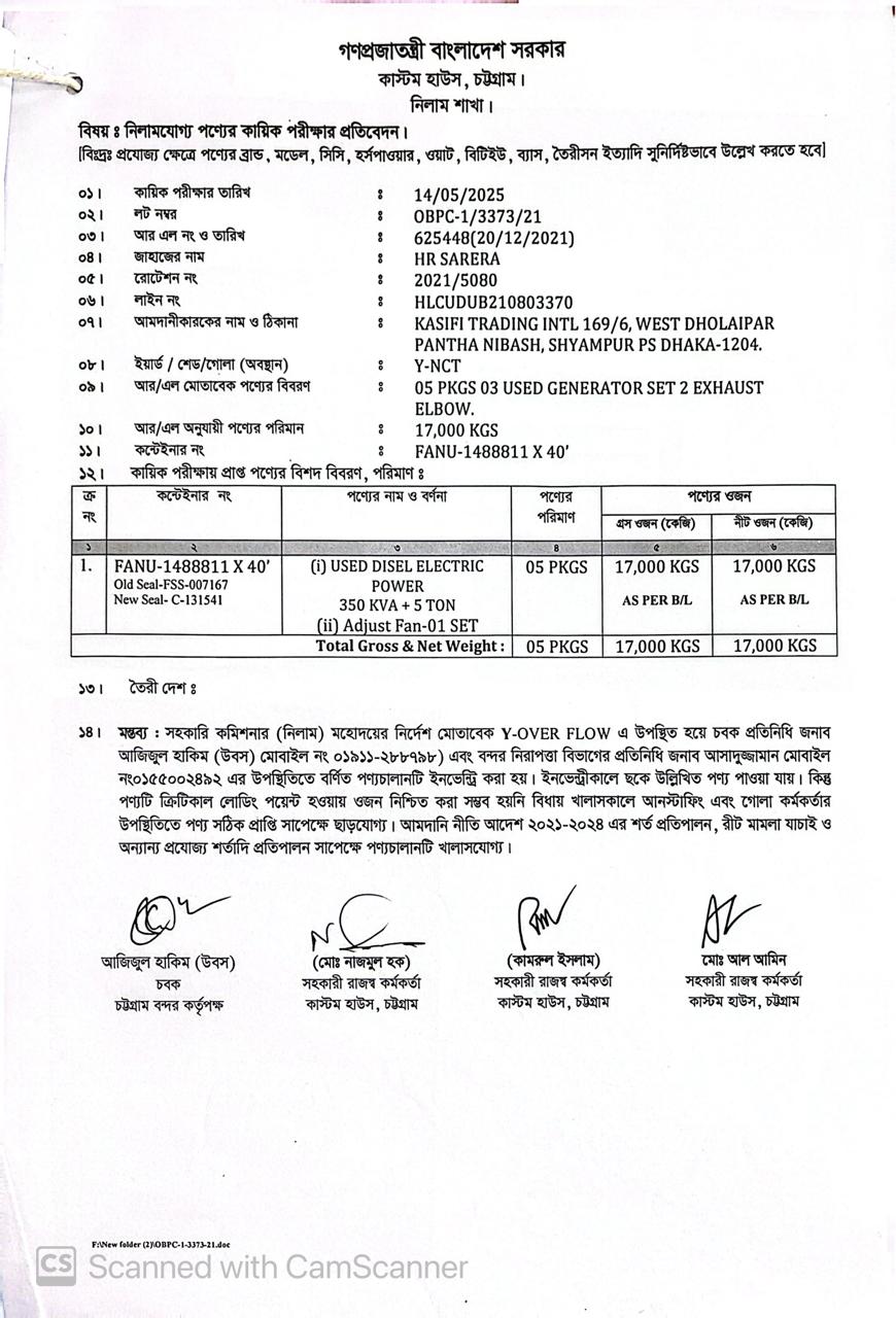Terms & condition : আমদানি নীতি আদেশ এবং বিদ্যমান অন্যান্য আইন ও বিধি-বিধানের প্রযোজ্য সকল শর্ত পরিপালন এবং প্রযোজ্য ক্ষেত্রে রাসায়নিক পরীক্ষায় পণ্যের সঠিকতা ও ব্যবহার উপযোগিতা থাকা সাপেক্ষে খালাসকালে পণ্যের বর্ণনা এবং ওজন নিশ্চিত করে পণ্য ছাড়যোগ্য হবে। কোন লটভুক্ত পণ্যচালানে মেয়াদ উত্তীর্ণ/ধ্বসংযোগ্য পণ্য অন্তর্ভুক্ত থাকলে, উক্ত পণ্যচালানের ক্ষেত্রে মেয়াদ উত্তীর্ণ/ধ্বসংযোগ্য পণ্য ব্যতীত (প্রযোজ্য ক্ষেত্রে) কেবল মেয়াদযুক্ত/নিলামযোগ্য পণ্যসমূহ বিদ্যমান ও প্রযোজ্য আইন ও বিধি-বিধানের প্রযোজ্য সকল শর্ত পরিপালন সাপেক্ষে পণ্য ছাড়যোগ্য হবে। সার্ভার জটিলতা এড়ানোর জন্য আগ্রহী নিলাম ক্রেতাগণকে সরেজমিন পণ্য দেখে নিলামের নির্ধারিত তারিখ ও সময় শেষ হওয়ার পূর্বেই ই-নিলামে অংশগ্রহণ করার জন্য অনুরোধ করা যাচ্ছে। কোনরূপ কারণ দর্শানো ব্যতিরেকে কর্তৃপক্ষ যে কোন সময় ও পর্যায়ে যে কোন লট বা সকল লটের নিলাম আংশিক বা সম্পূর্ণ স্থগিত বা বাতিলের অধিকার সংরক্ষণ করেন।