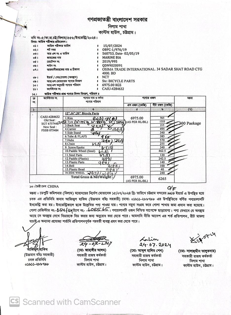 লটের শিরোনাম :RIM-965 KG TYRE-1355 KG BACK SEAT- 215 KG CARRIER-495 KG SIDE STAND- 340 KG TUBE & FLAPS-385 KG HUBS-570 KG CHAIN-255 KG SCREW/SPOKE -340 KG PADDLE WHEEL-462.5 KGS STEEL PARTS-120 KG PADDLE (PLASTIC)-(Previous Bid: 0 TK)